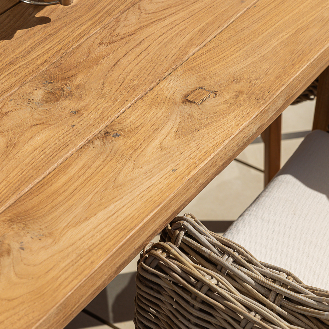 200cm Rectangular Natural Reclaimed Teak Straight Leg Outdoor Dining Table with 4 or 6 Natural Kubu Wicker ChairsIn stock