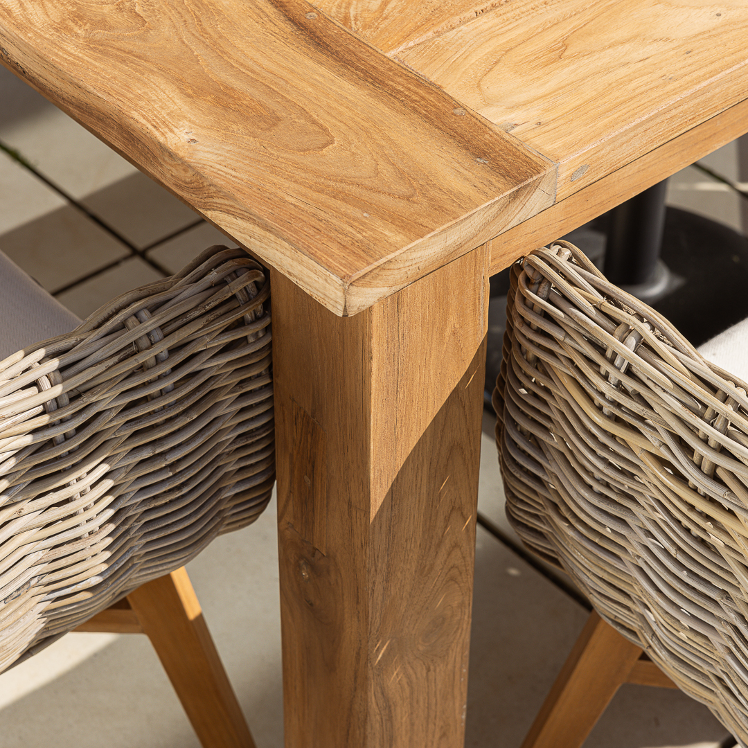 160cm Rectangular Natural Reclaimed Teak Straight Leg Outdoor Dining Table with 4 or 6 Natural Kubu Wicker ChairsIn stock