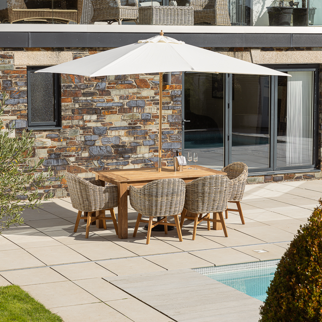 240cm Rectangular Natural Reclaimed Teak Straight Leg Outdoor Dining Table with 6 or 8 Scandi ArmchairsIn stock