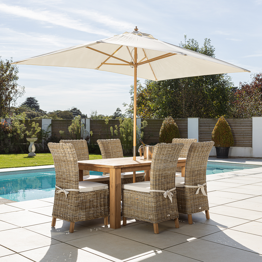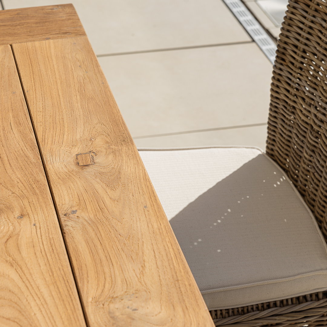 200cm Rectangular Natural Reclaimed Teak Straight Leg Outdoor Dining Table with 4 or 6 Natural Kubu Wicker ChairsIn stock