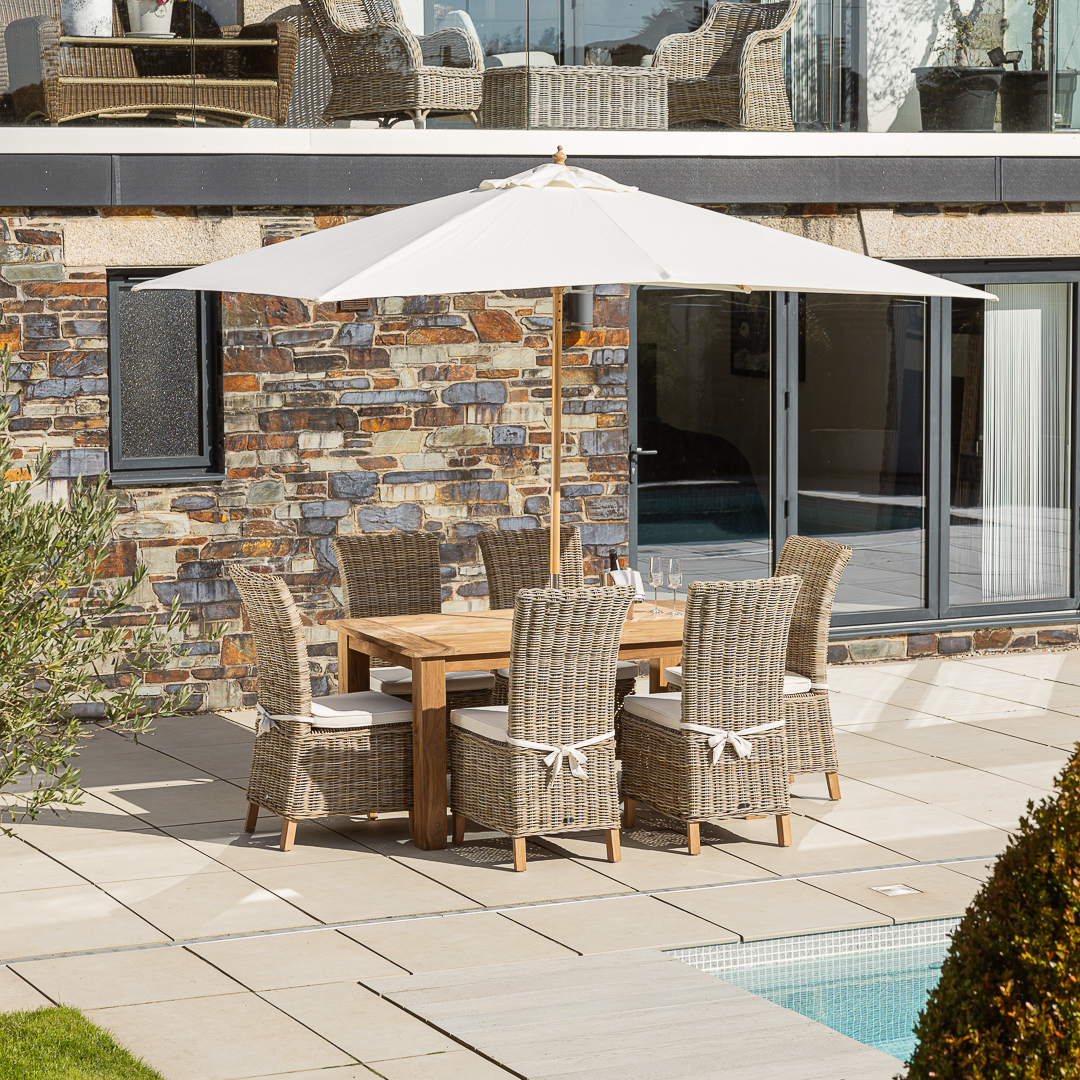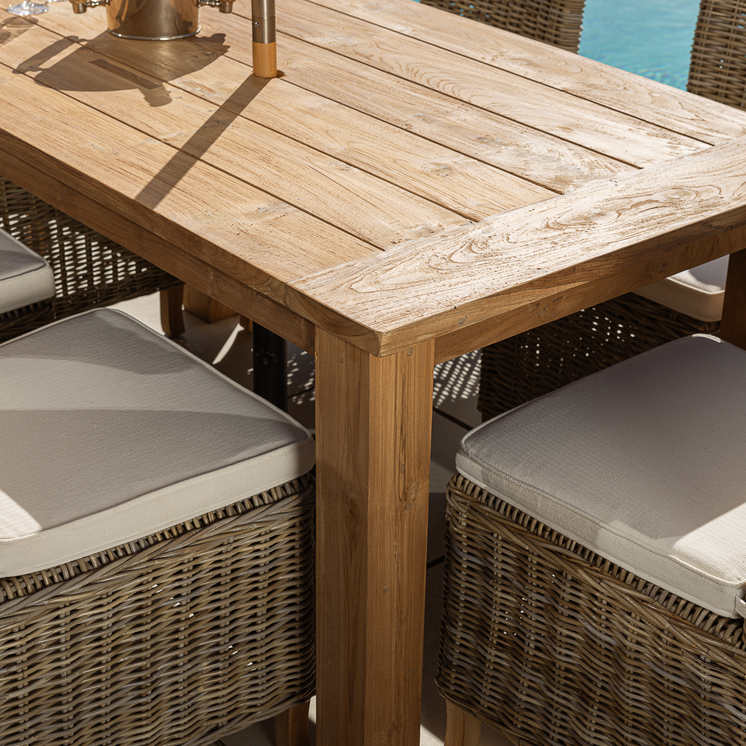 240cm Rectangular Natural Reclaimed Teak Straight Leg Outdoor Dining Table with 6 or 8 Natural Kubu Wicker ChairsIn stock
