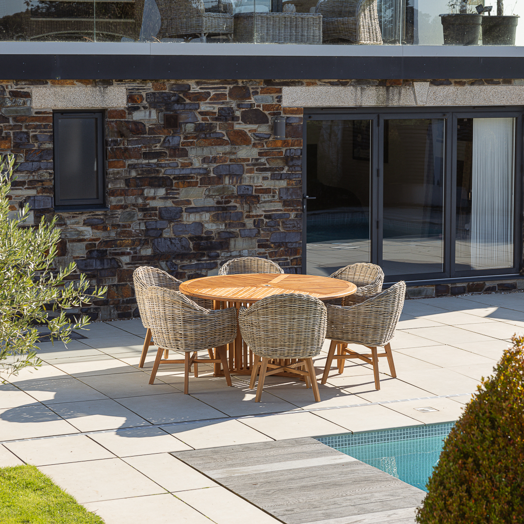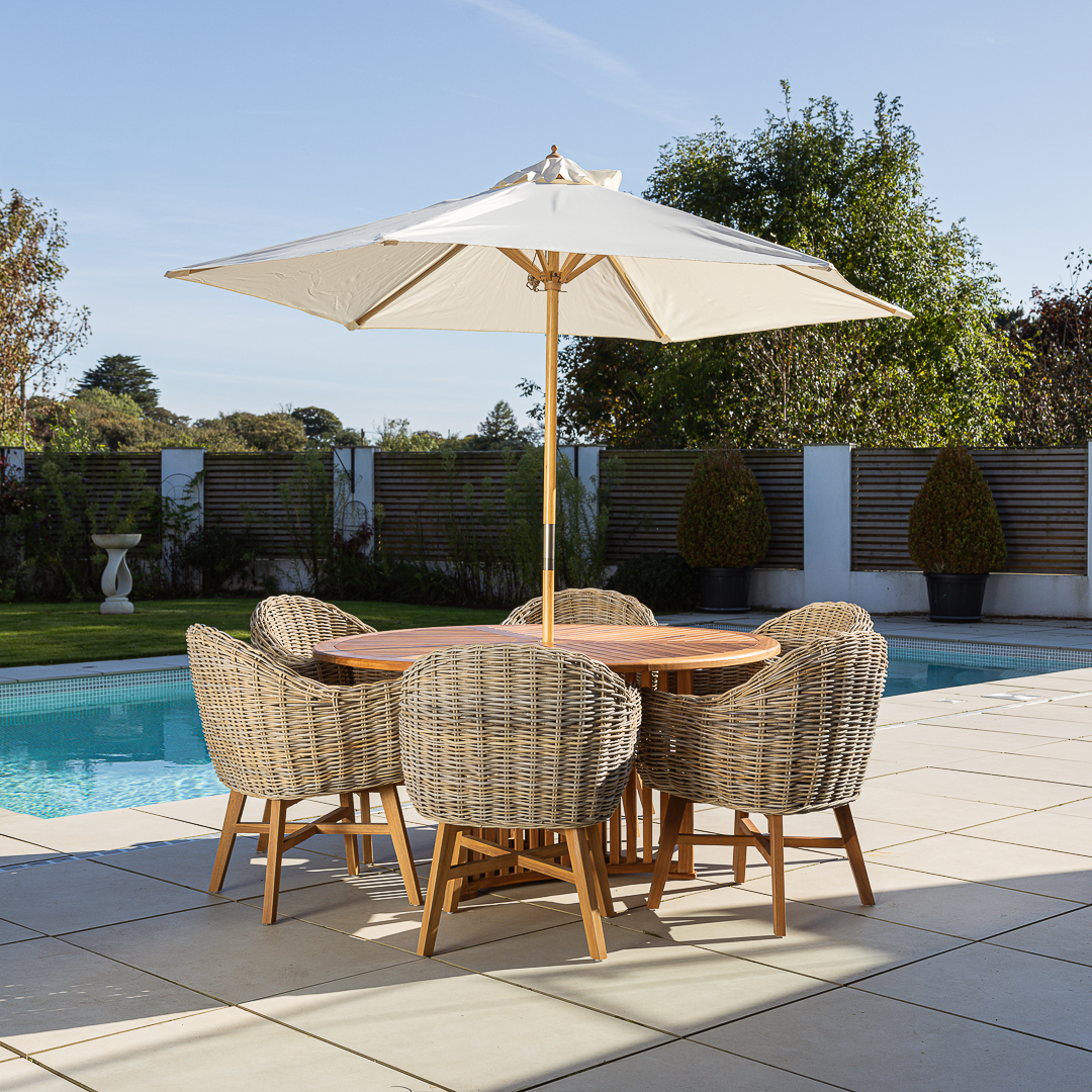 180cm - 240cm Certified Teak Single Extending Cross Leg Outdoor Dining Table with 6 or 8 Natural Kubu Wicker ChairsIn stock