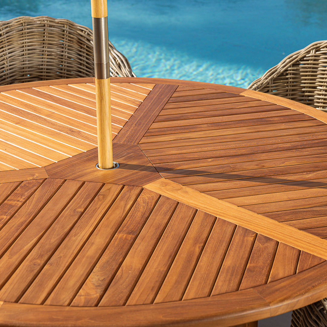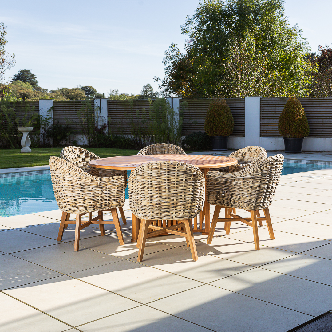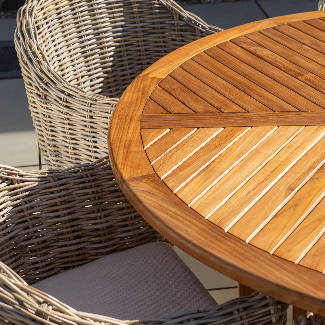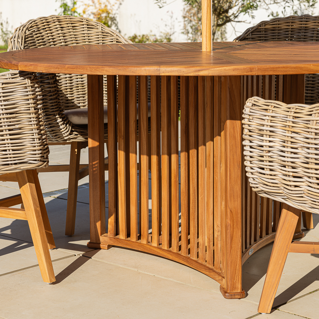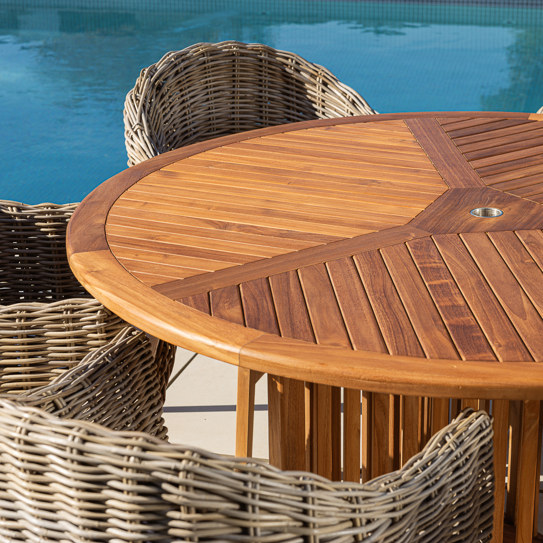 150cm Circular Certified Teak Radar Outdoor Dining Table with 6 Scandi Armchairs