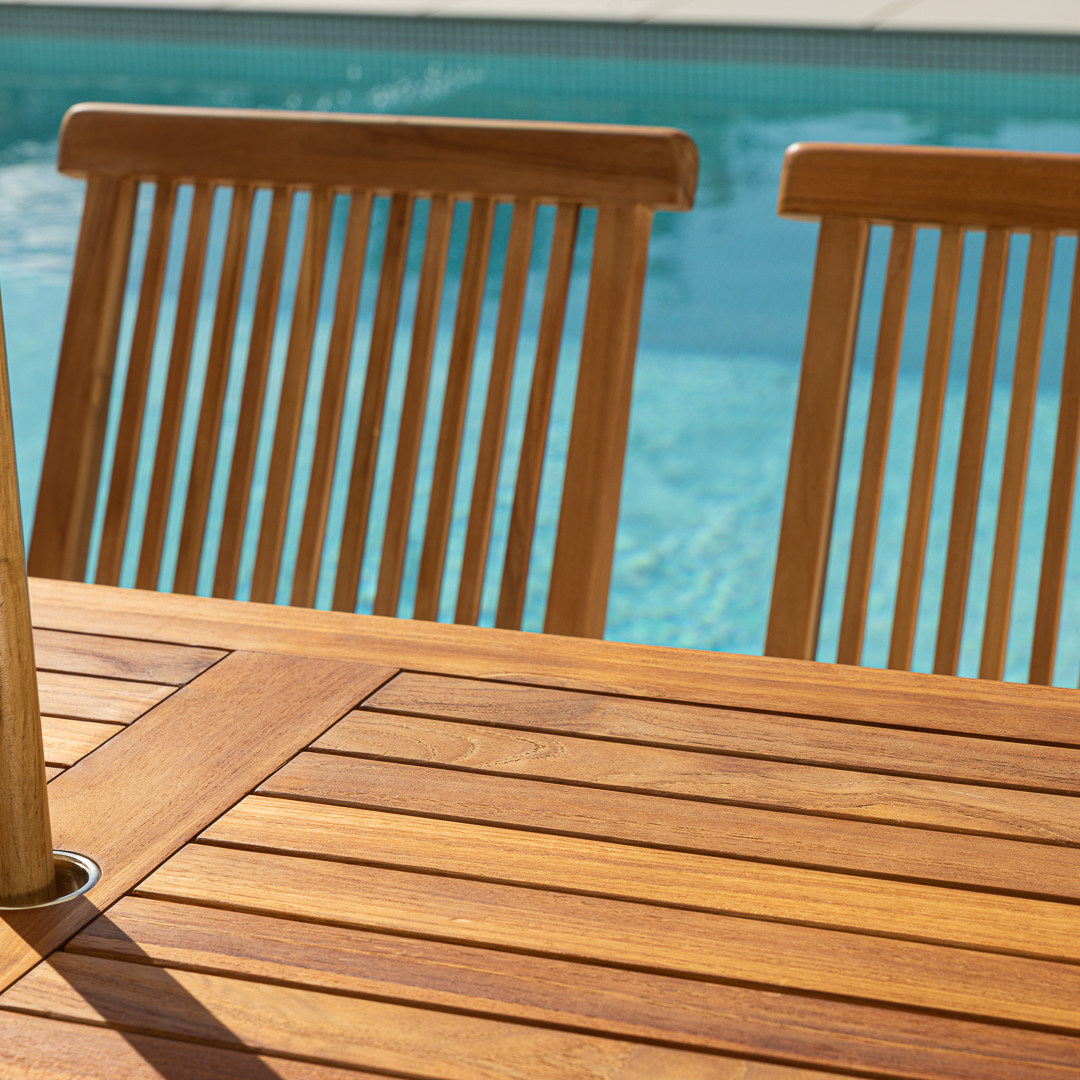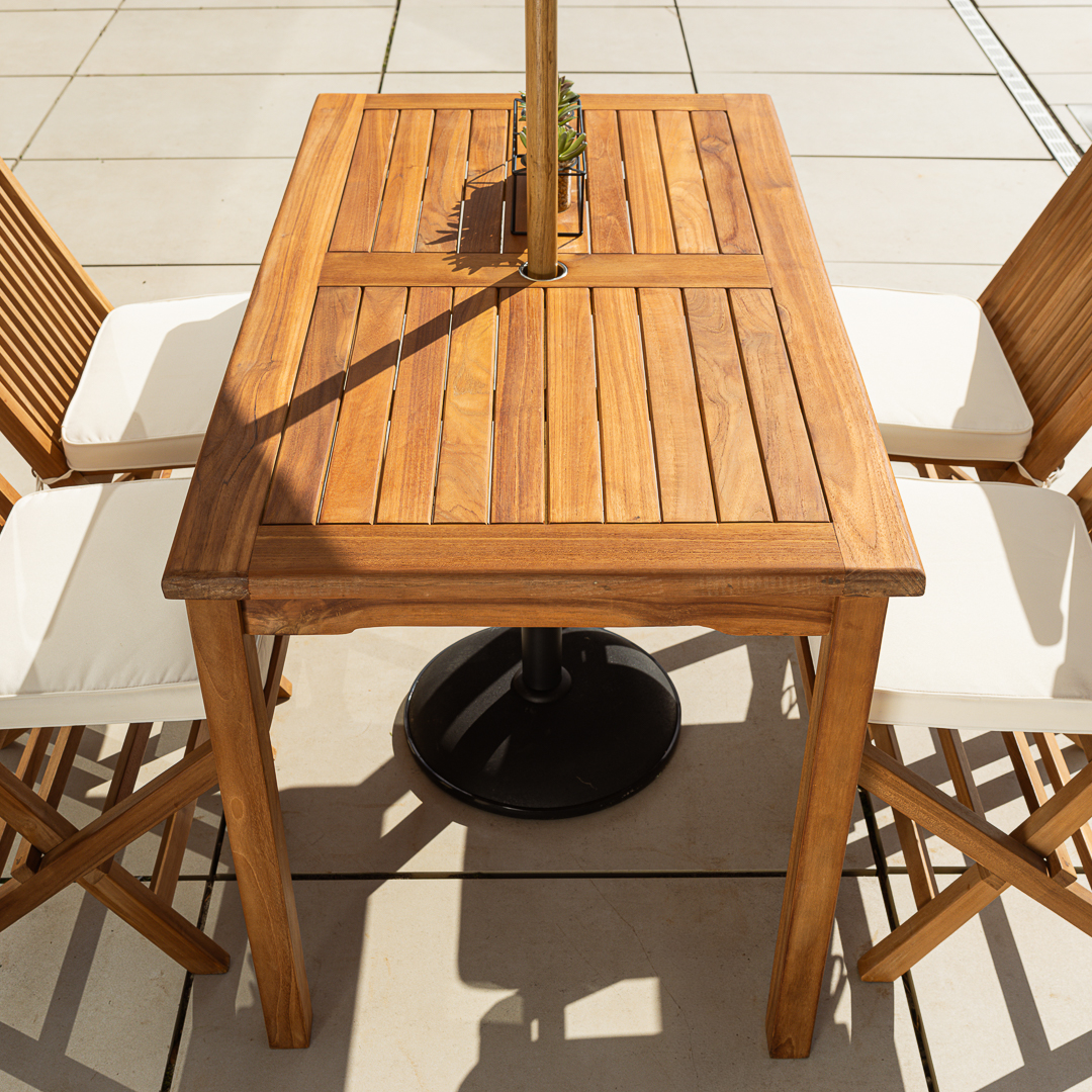 150cm Rectangular Certified Teak Outdoor Dining Table with 6 Cora Teak Folding ChairsIn stock