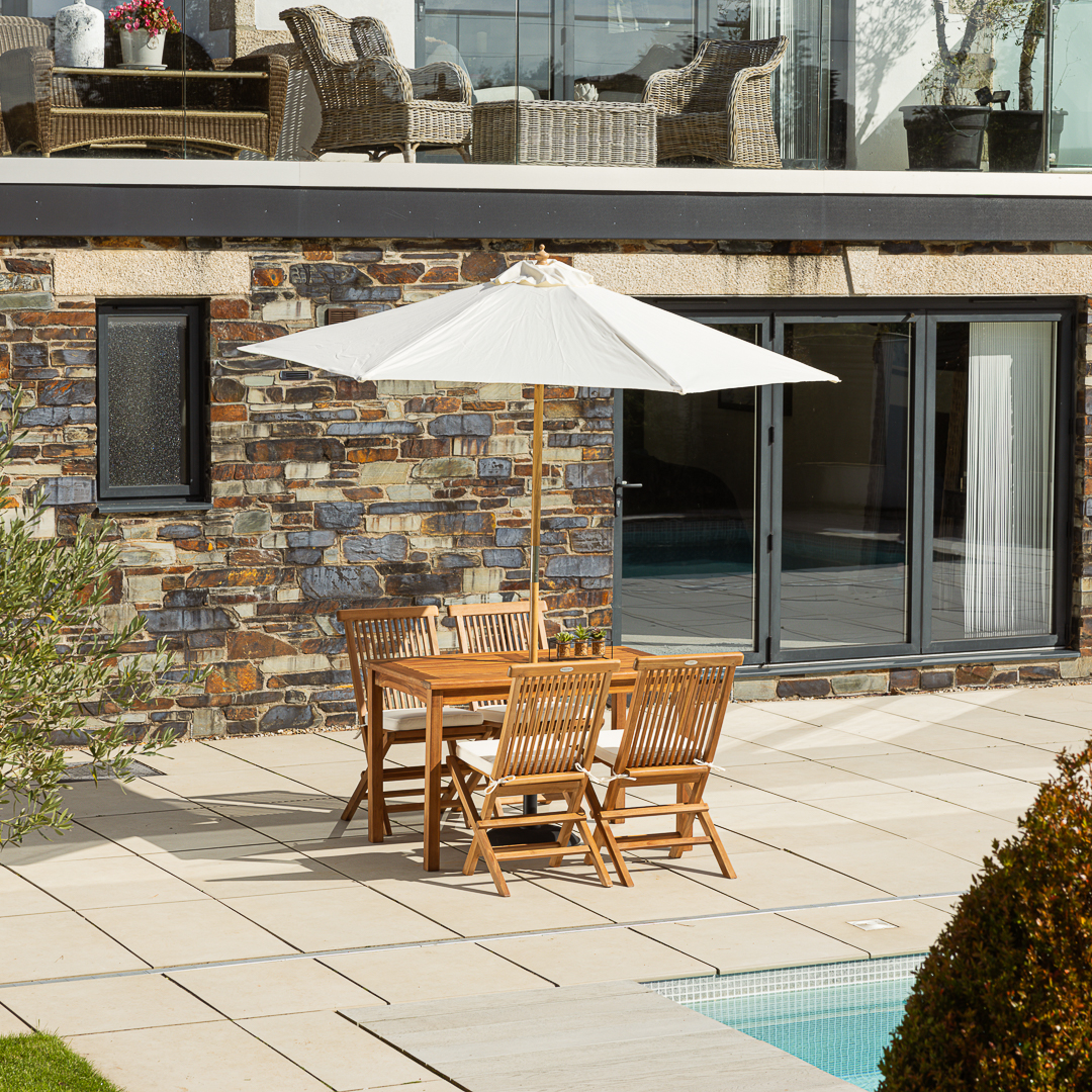 120cm - 180cm Circular Certified Teak Extending Outdoor Dining Table with 4 or 6 Cora Teak Folding ChairsIn stock