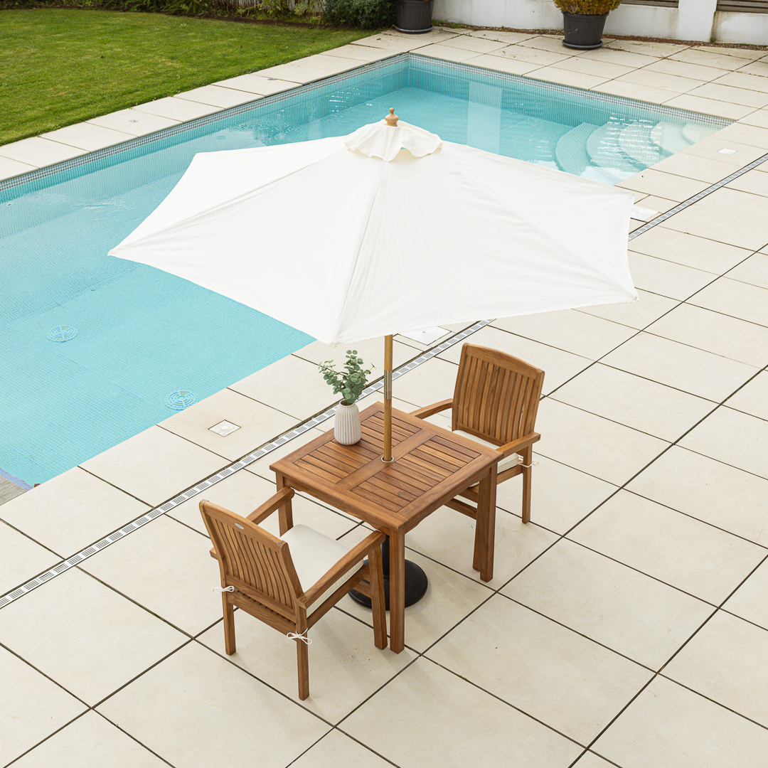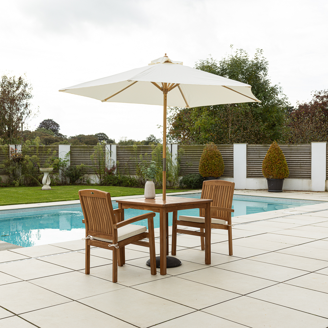 80cm Square Certified Teak Outdoor Dining Table with 2 Marley Teak Stacking Chairs