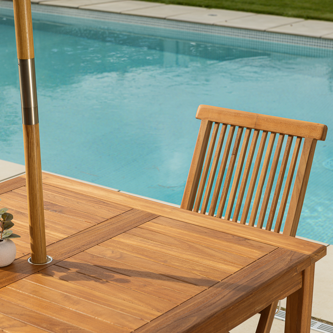 150cm Rectangular Certified Teak Outdoor Dining Table with 6 Cora Teak Folding ChairsIn stock