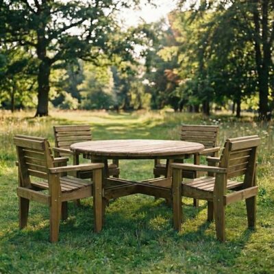 120cm Circular Douglas Fir Outdoor Dining Table with 4 Douglas Fir ArmchairsIn stock