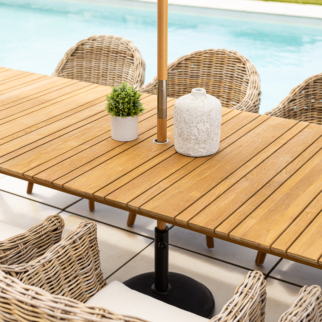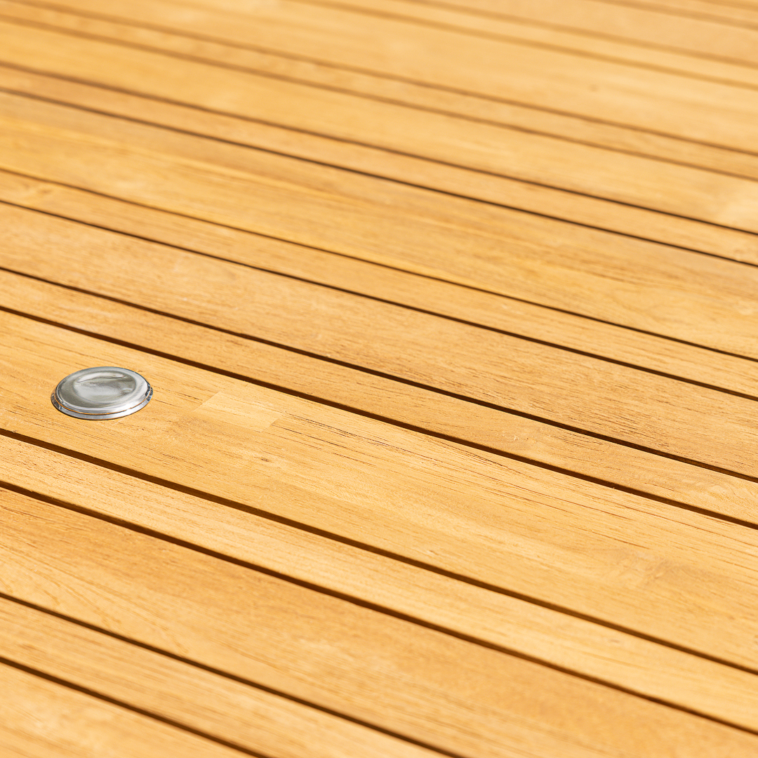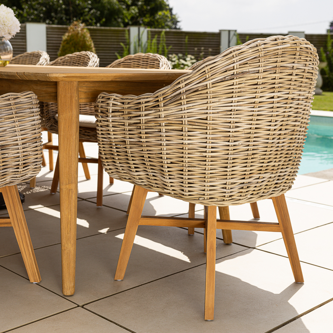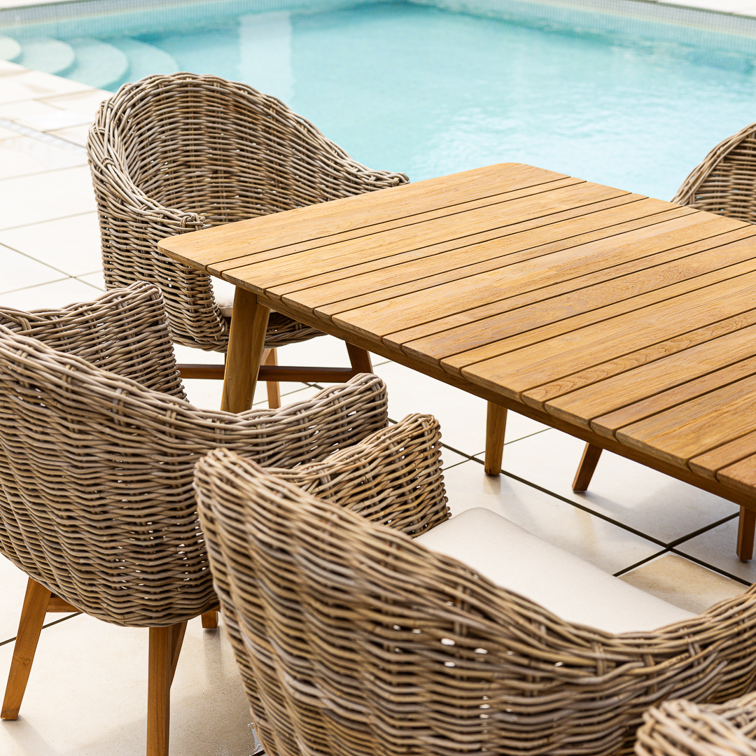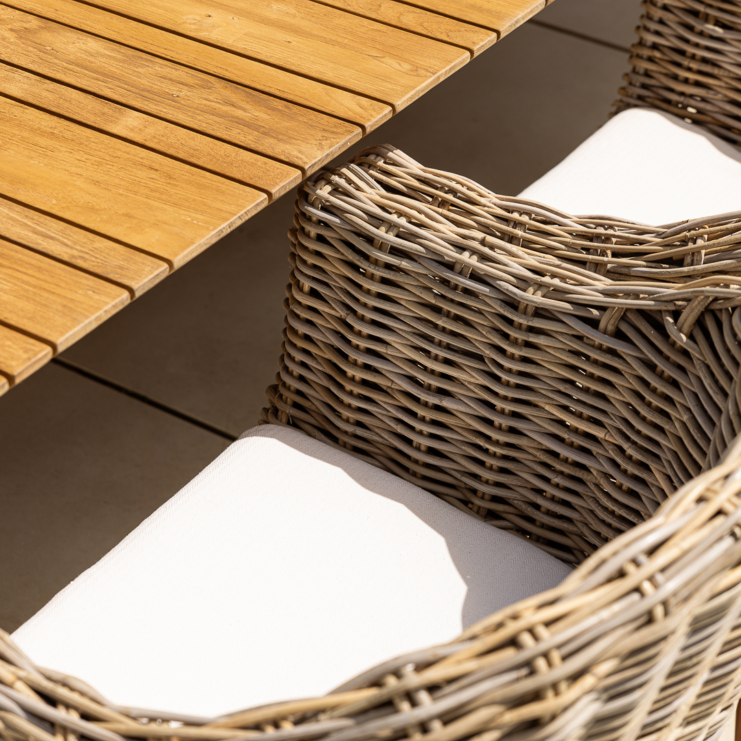 This Savannah Dining Set combines a 300cm honey‑brown reclaimed teak table with modern Scandi armchairs. The large table highlights the natural warmth and grain of reclaimed teak, while the armchairs add comfort and contemporary simplicity. A refined choice for creating a welcoming, design‑focused outdoor dining space.