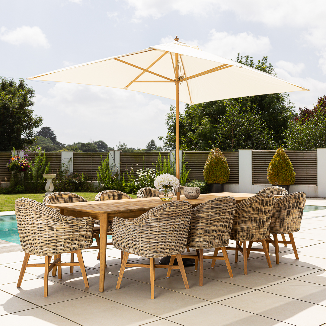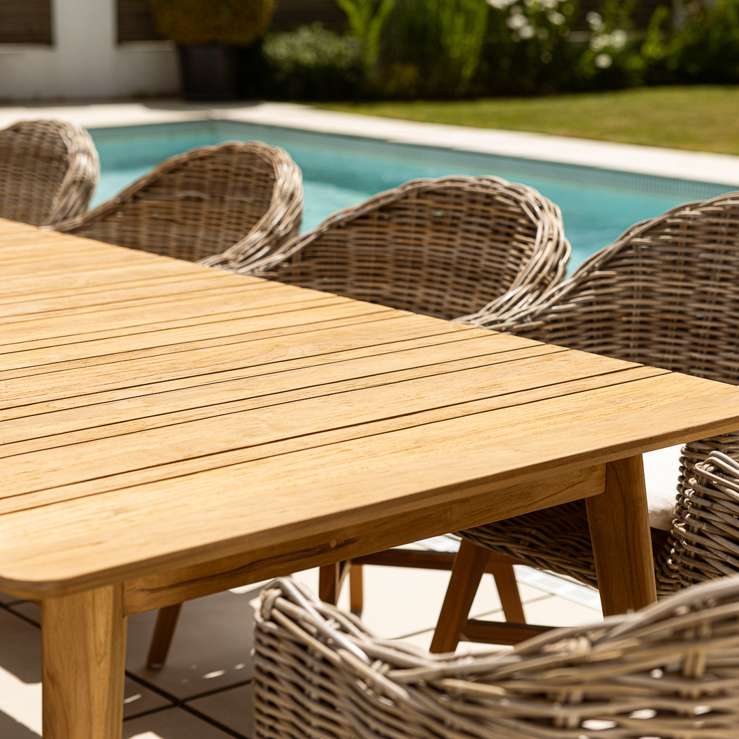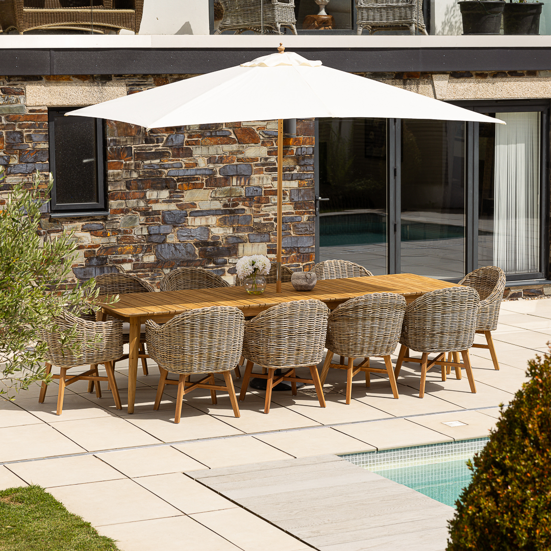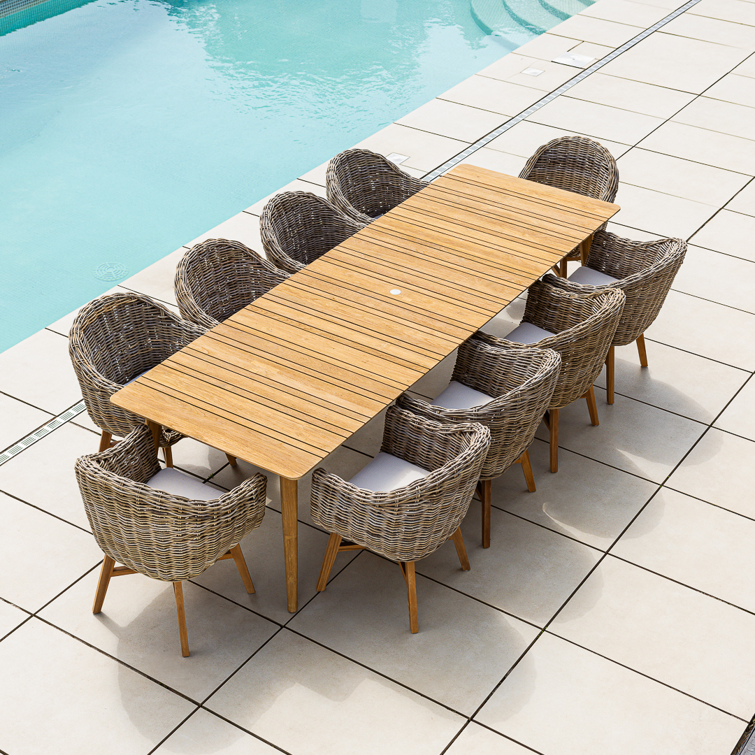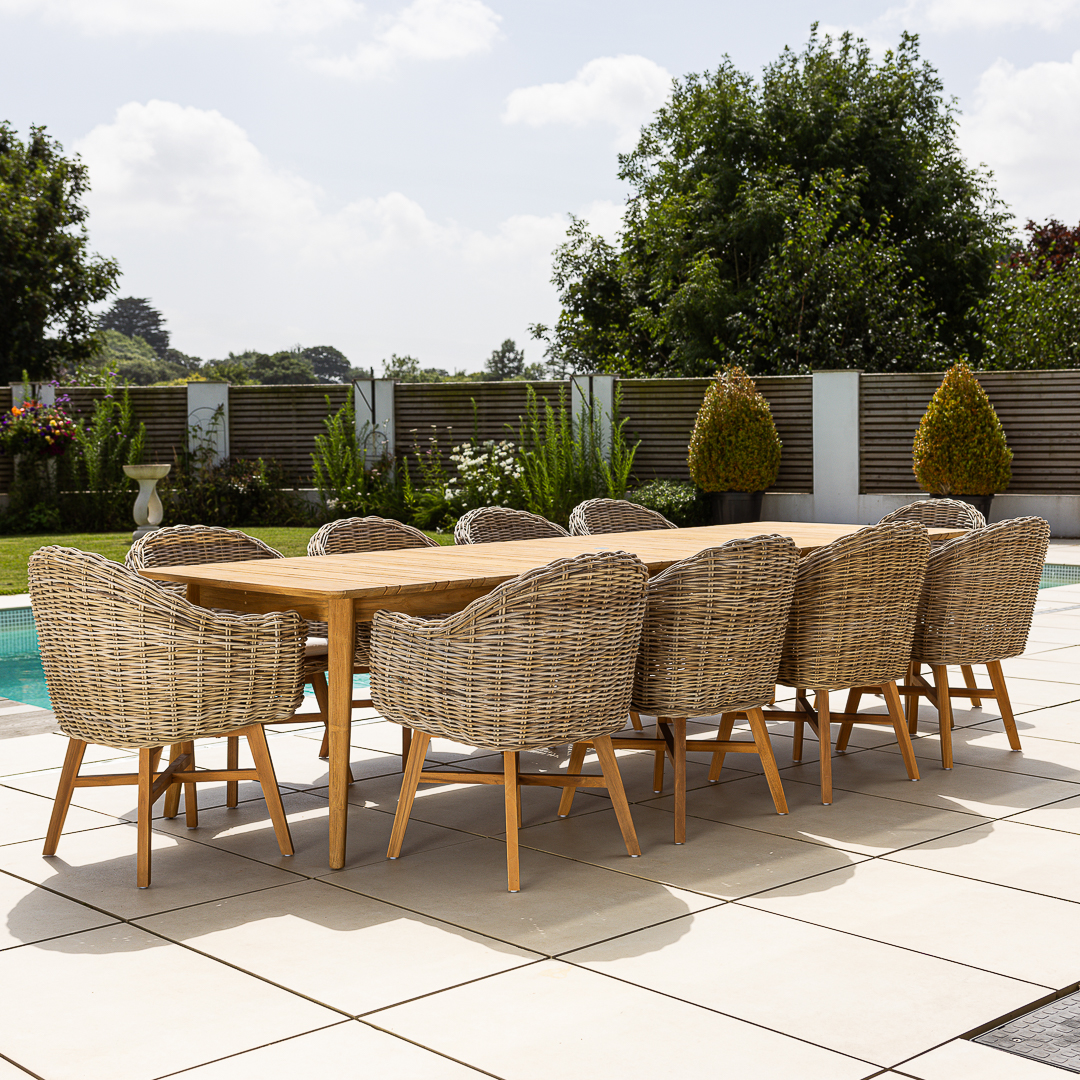 300cm Rectangular Honey Brown Reclaimed Teak Outdoor Dining Table with 10 or 12 Scandi Armchairs