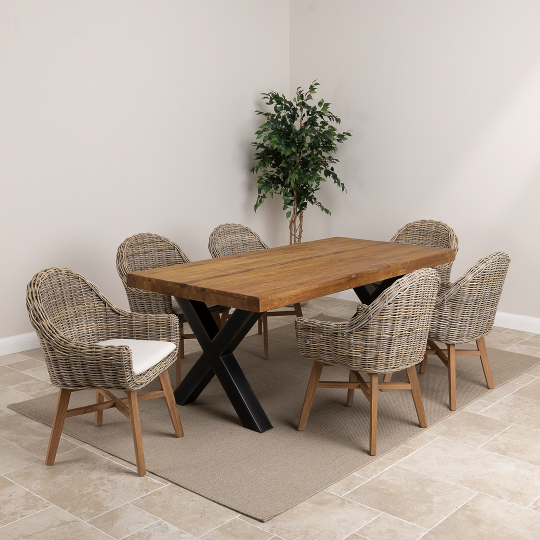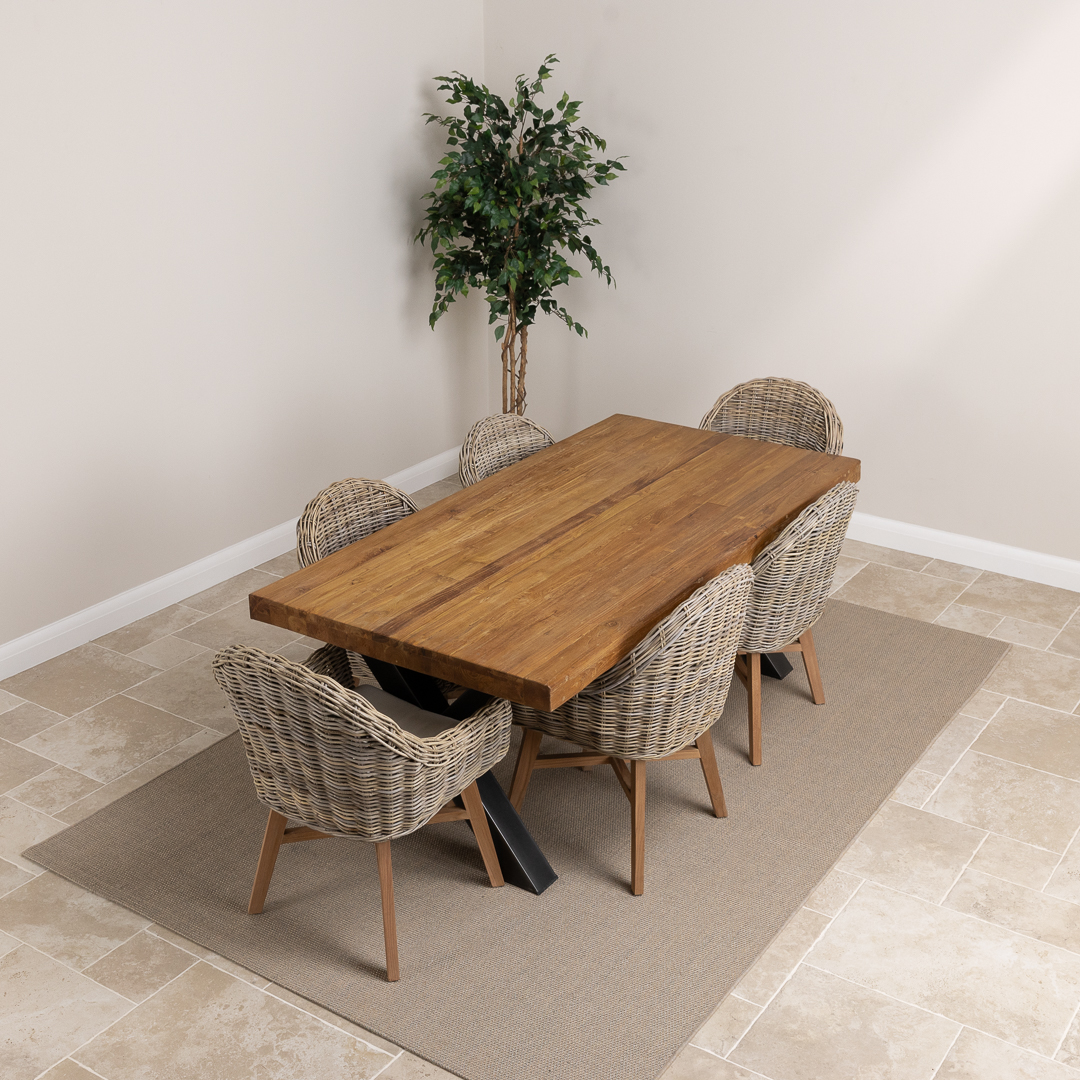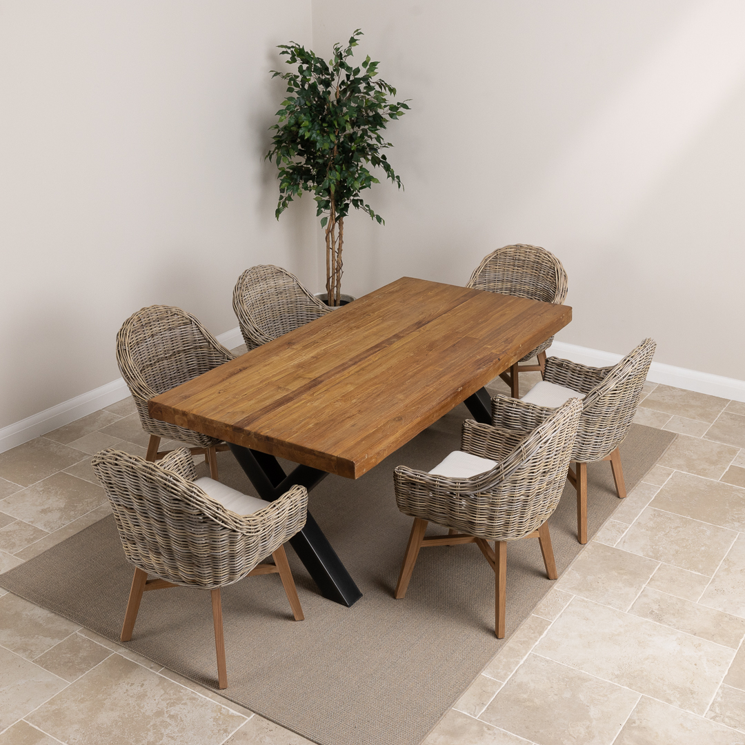200cm Rectangular Reclaimed Teak & Steel Cross Leg Indoor Dining Table with 4 or 6 Scandi Armchairs