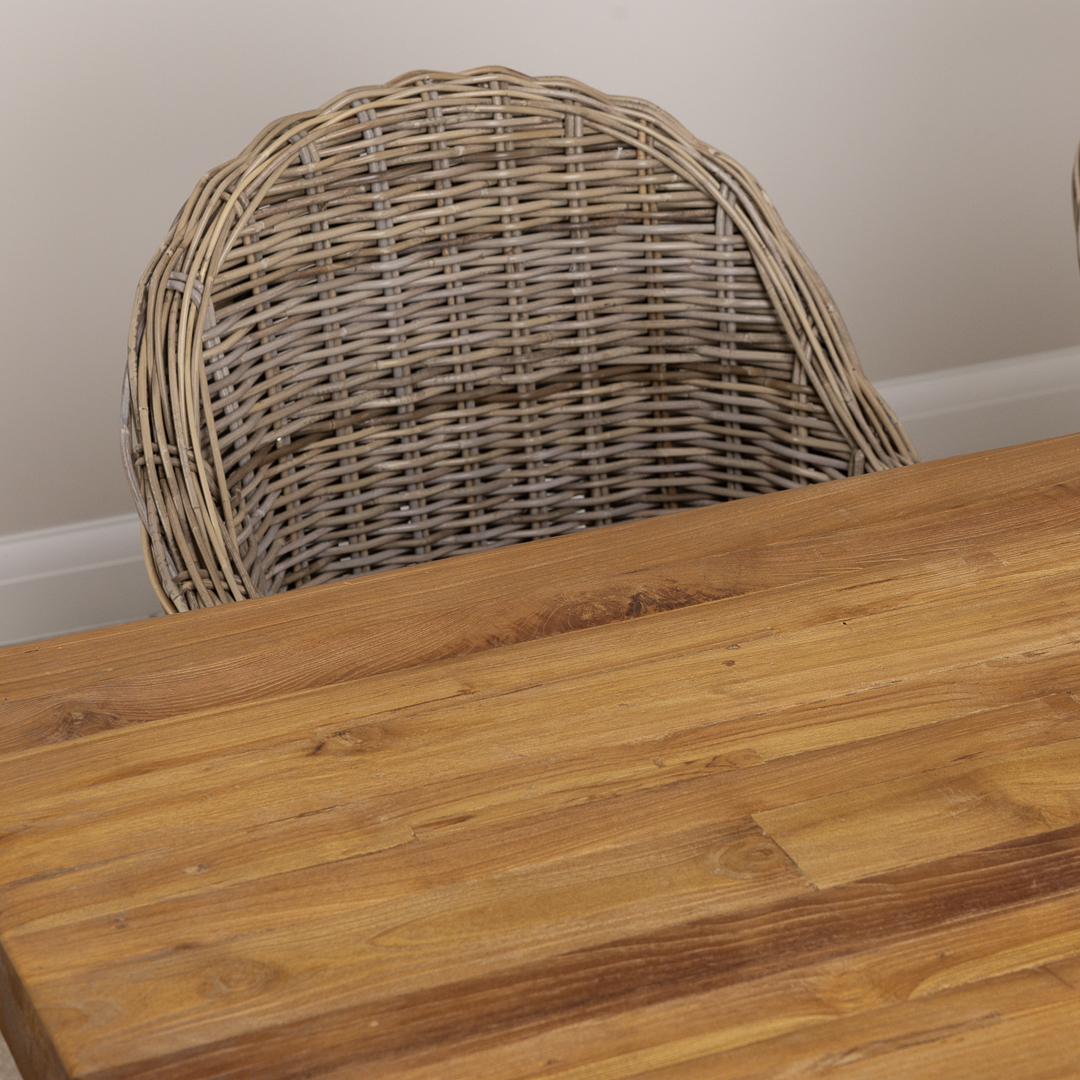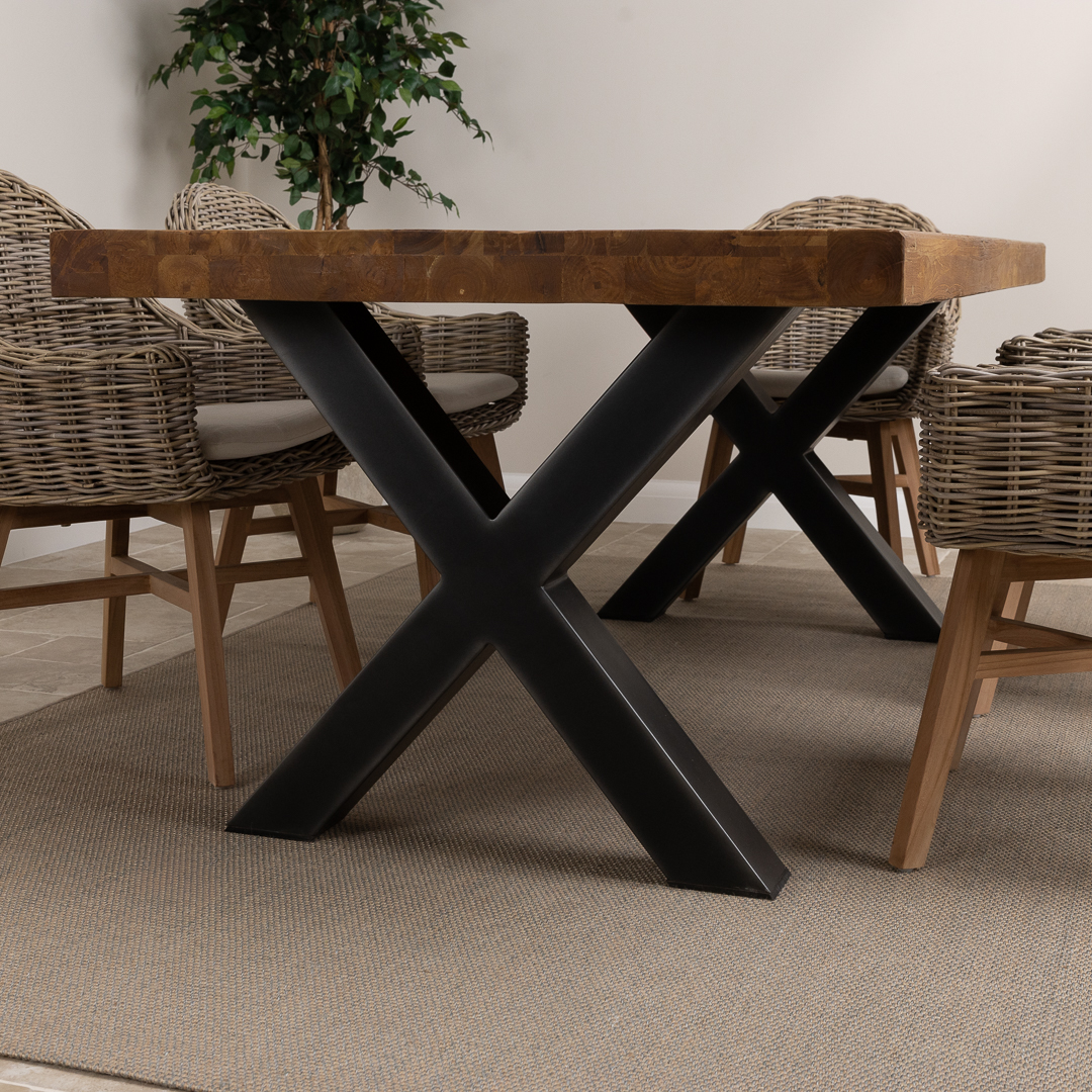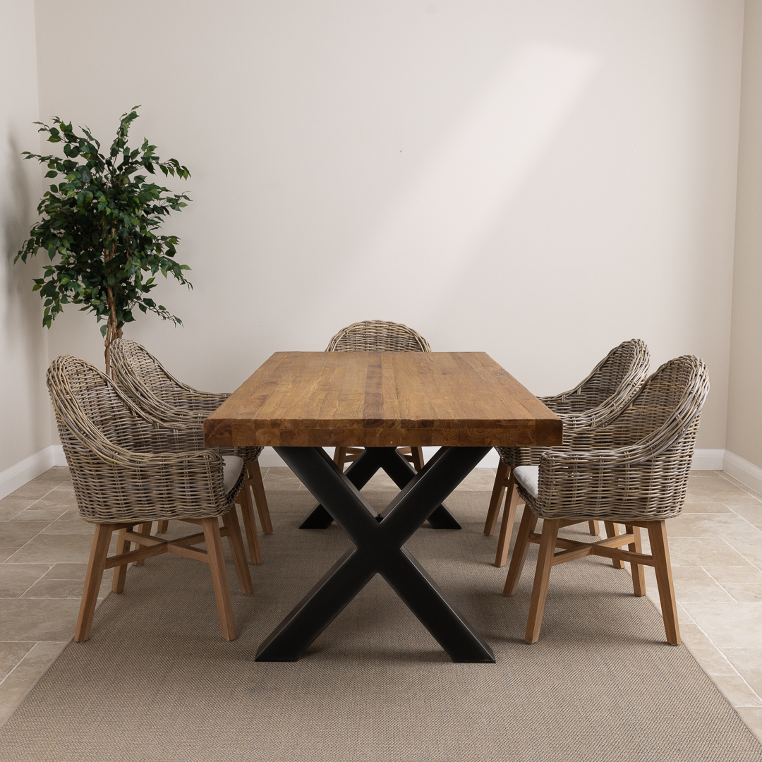 200cm Rectangular Reclaimed Teak & Steel Cross Leg Indoor Dining Table with 4 or 6 Scandi Armchairs