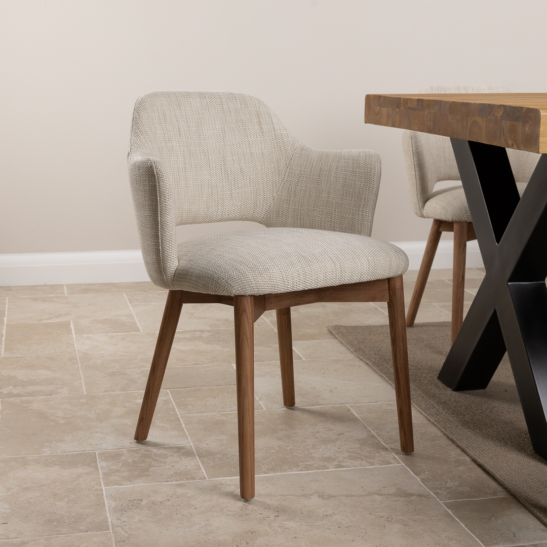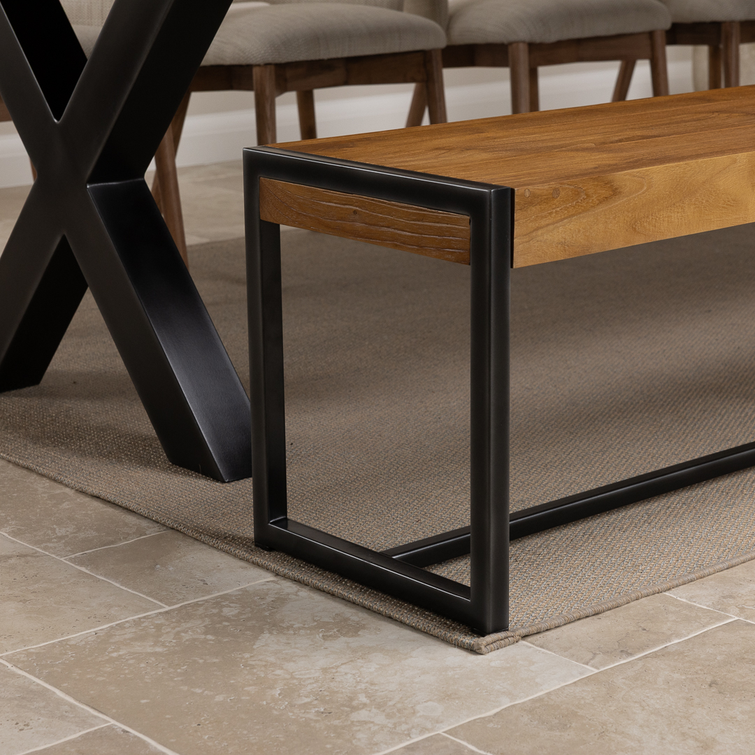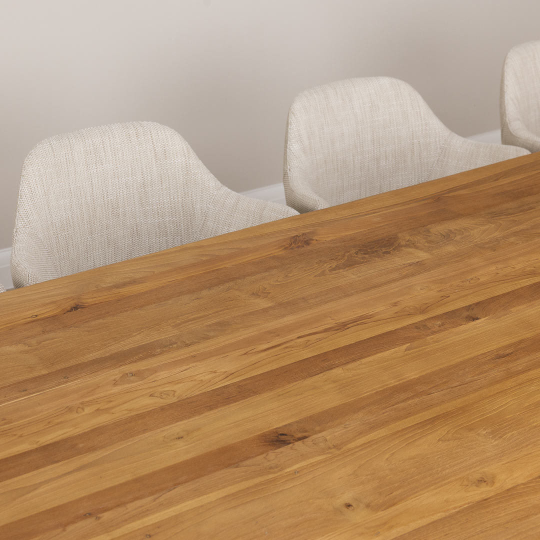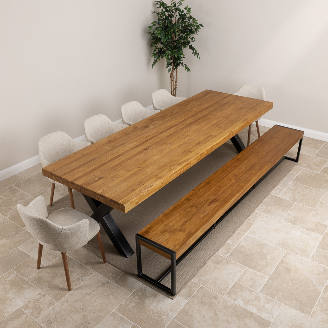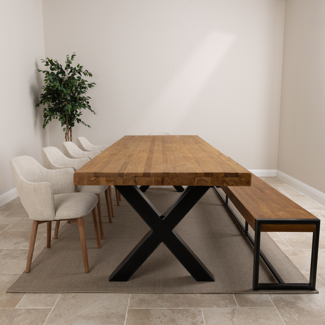 240cm Rectangular Reclaimed Teak & Steel Cross Leg Indoor Dining Table with Bench & 4 or 6 Recycled Fabric Wave Armchairs
