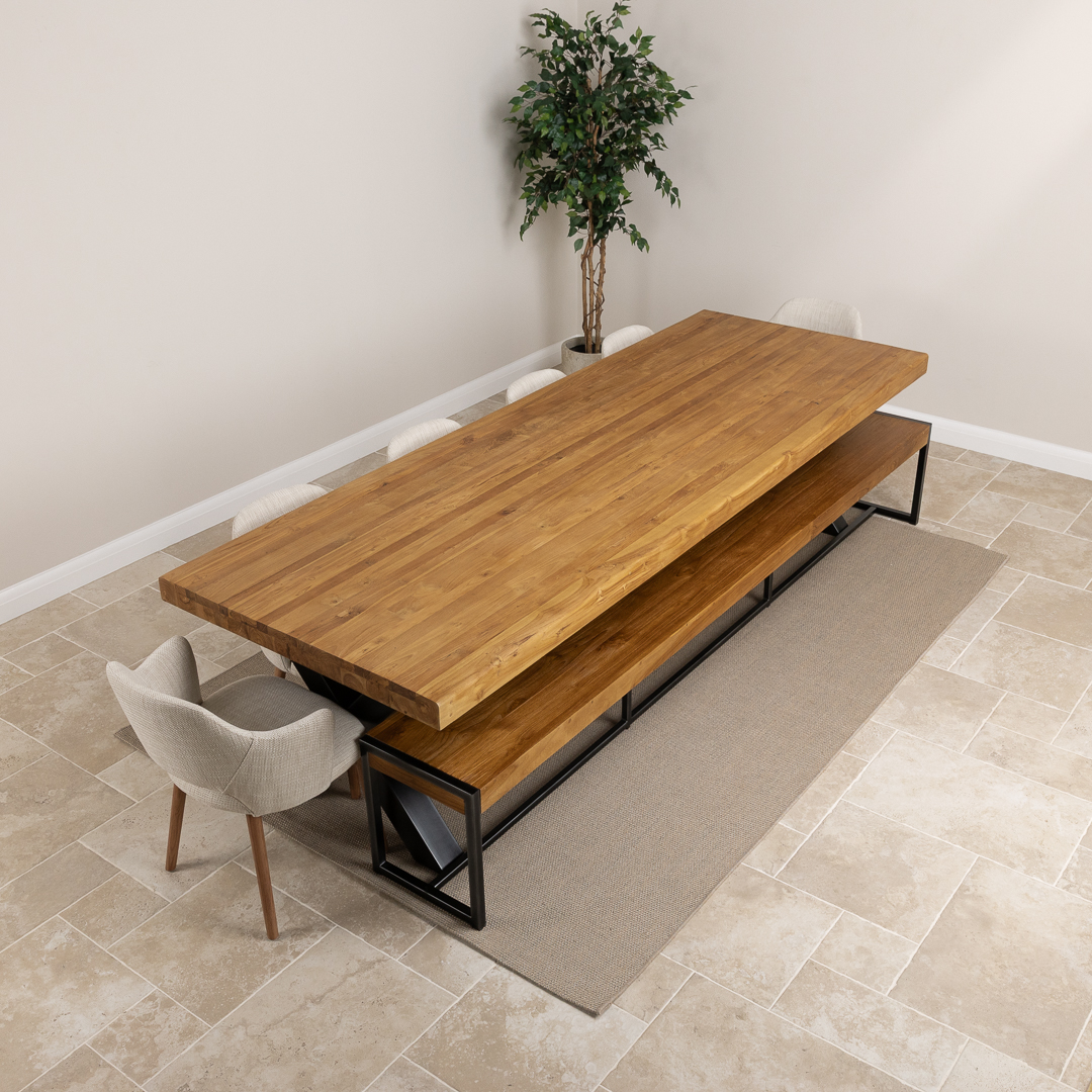 The Urban Fusion Dining Set pairs a spacious 300cm reclaimed teak and steel cross‑leg table with a matching bench and 4 or 6 recycled‑fabric Wave Armchairs. Combining industrial strength with contemporary comfort, this versatile set offers generous seating, sustainable materials, and a striking modern centerpiece ideal for family dining and entertaining.