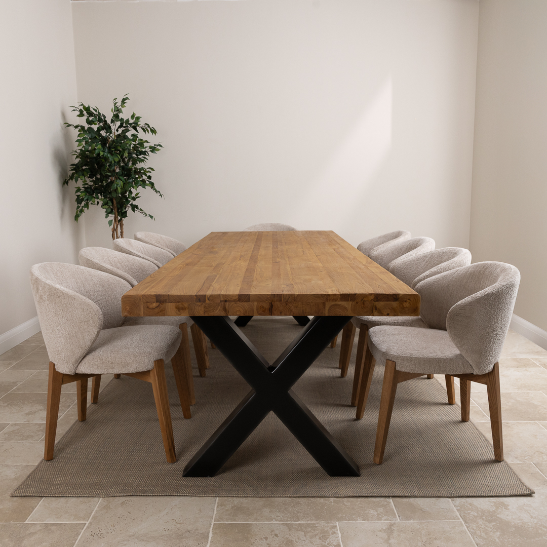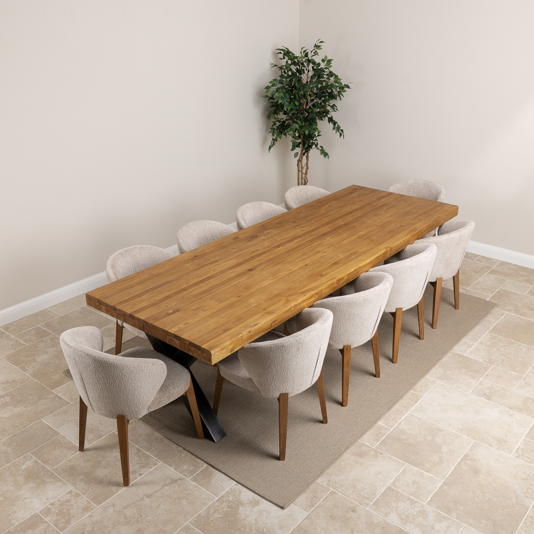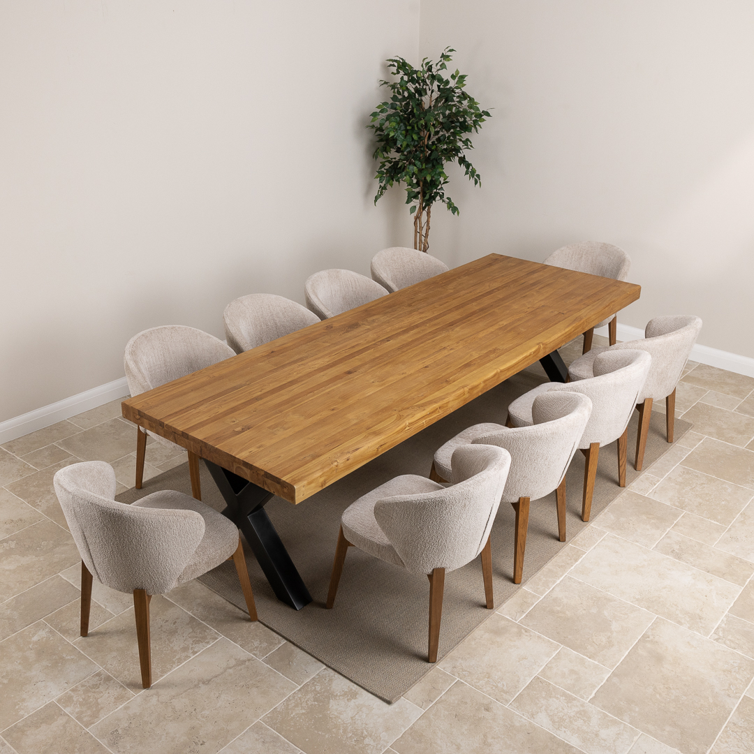 The Urban Fusion Dining Set showcases a generous 300cm reclaimed teak and steel cross‑leg table paired with 8 or 10 upholstered Cove Chairs. Offering a blend of industrial strength and modern comfort, this spacious set creates a striking, contemporary centerpiece ideal for family gatherings, entertaining, and everyday dining.