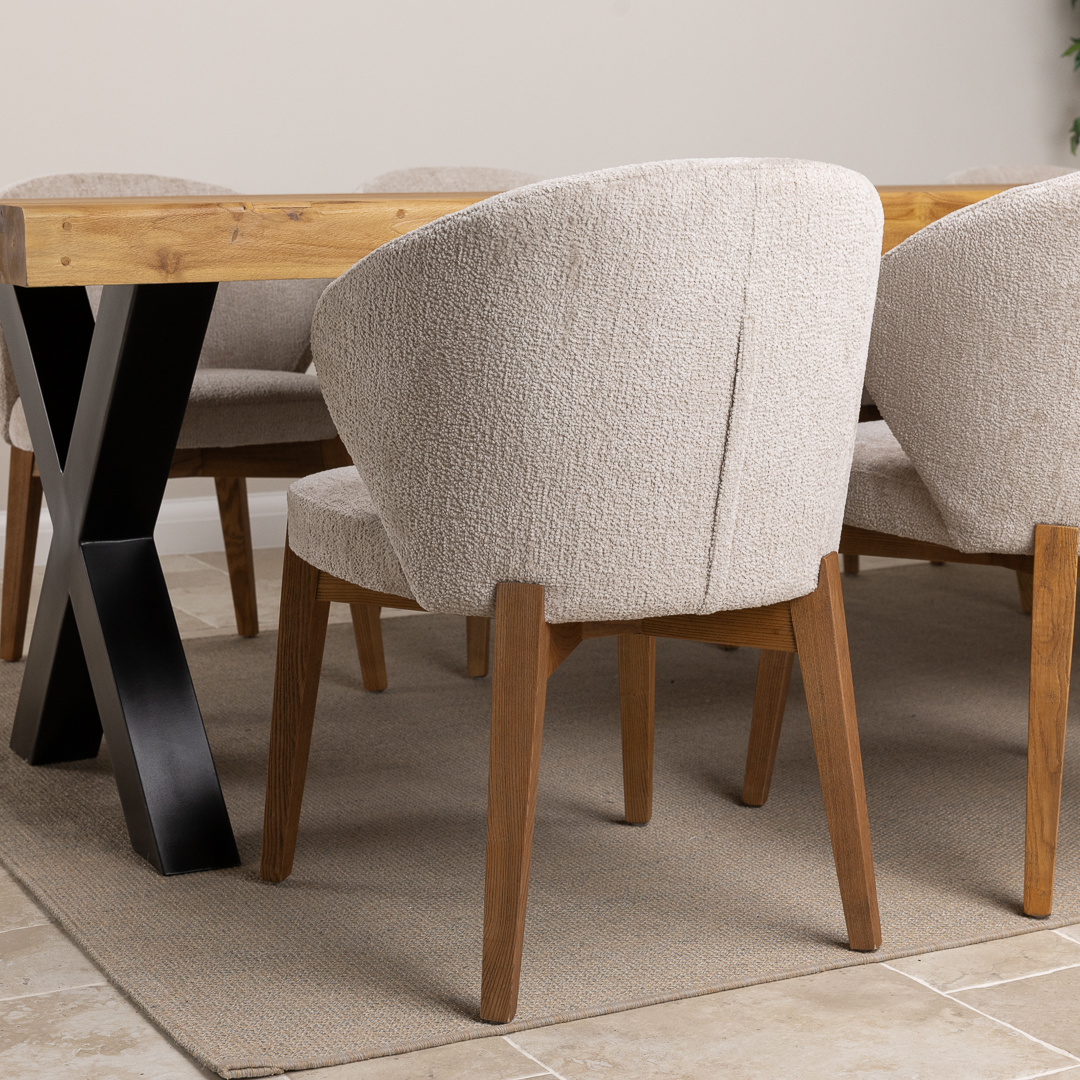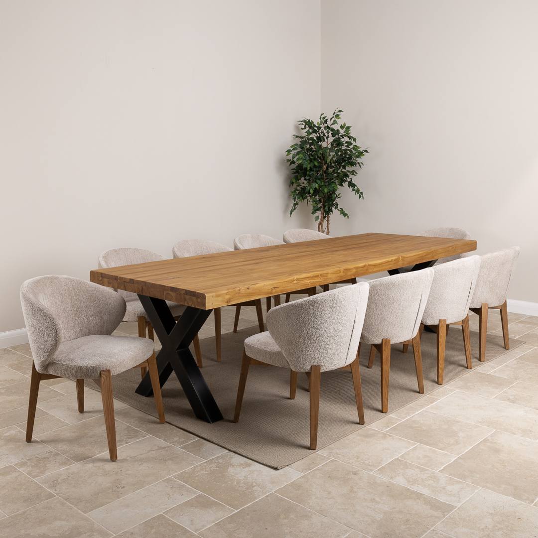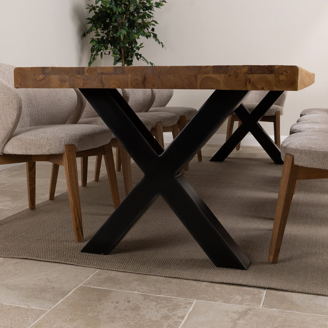 The Urban Fusion Dining Set showcases a generous 300cm reclaimed teak and steel cross‑leg table paired with 8 or 10 upholstered Cove Chairs. Offering a blend of industrial strength and modern comfort, this spacious set creates a striking, contemporary centerpiece ideal for family gatherings, entertaining, and everyday dining.