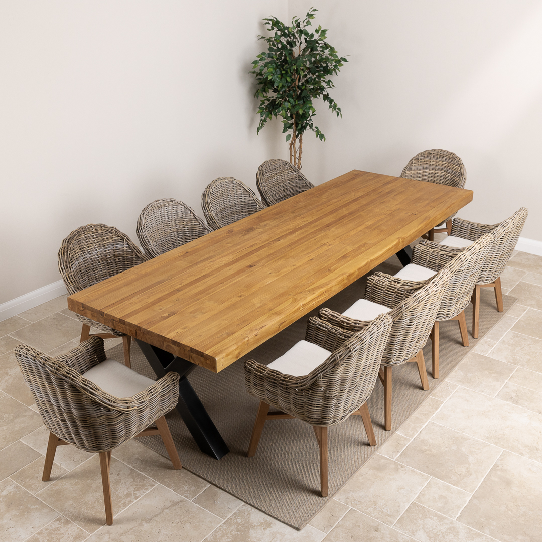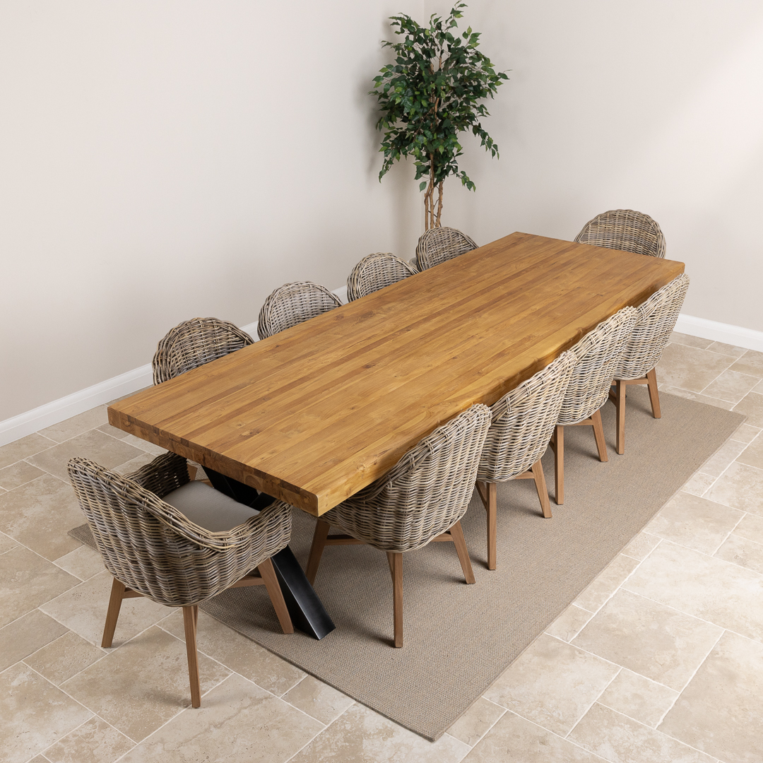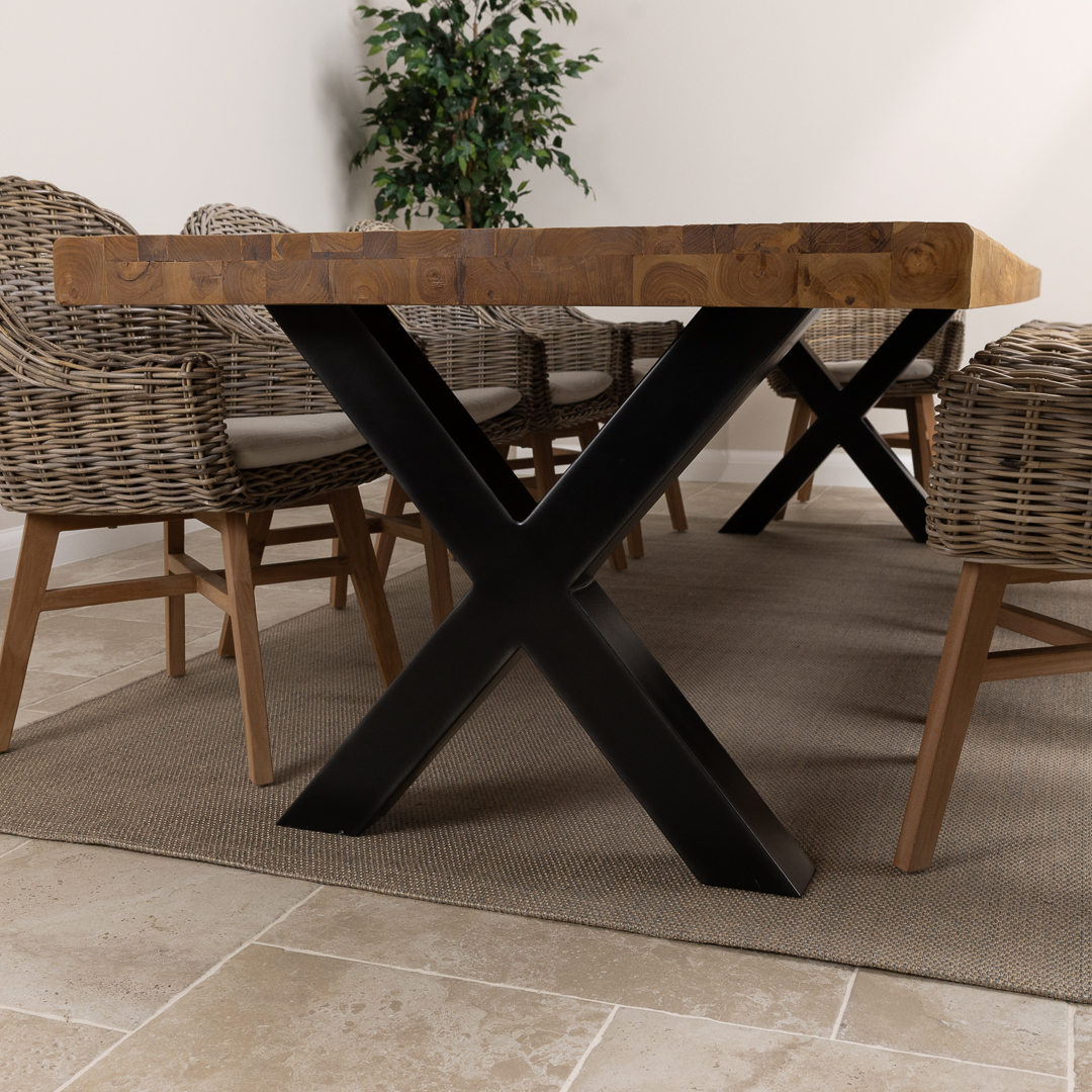 Pairing a 300cm reclaimed teak and steel cross‑leg table with handwoven Kubu wicker Scandi armchairs, this set blends modern silhouettes with rustic‑industrial materials. A contemporary, spacious dining solution designed for style, comfort, and social gatherings.