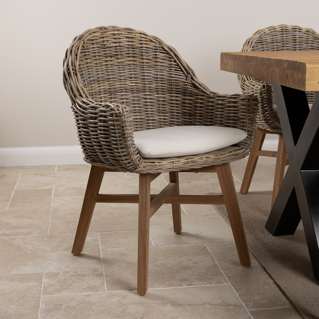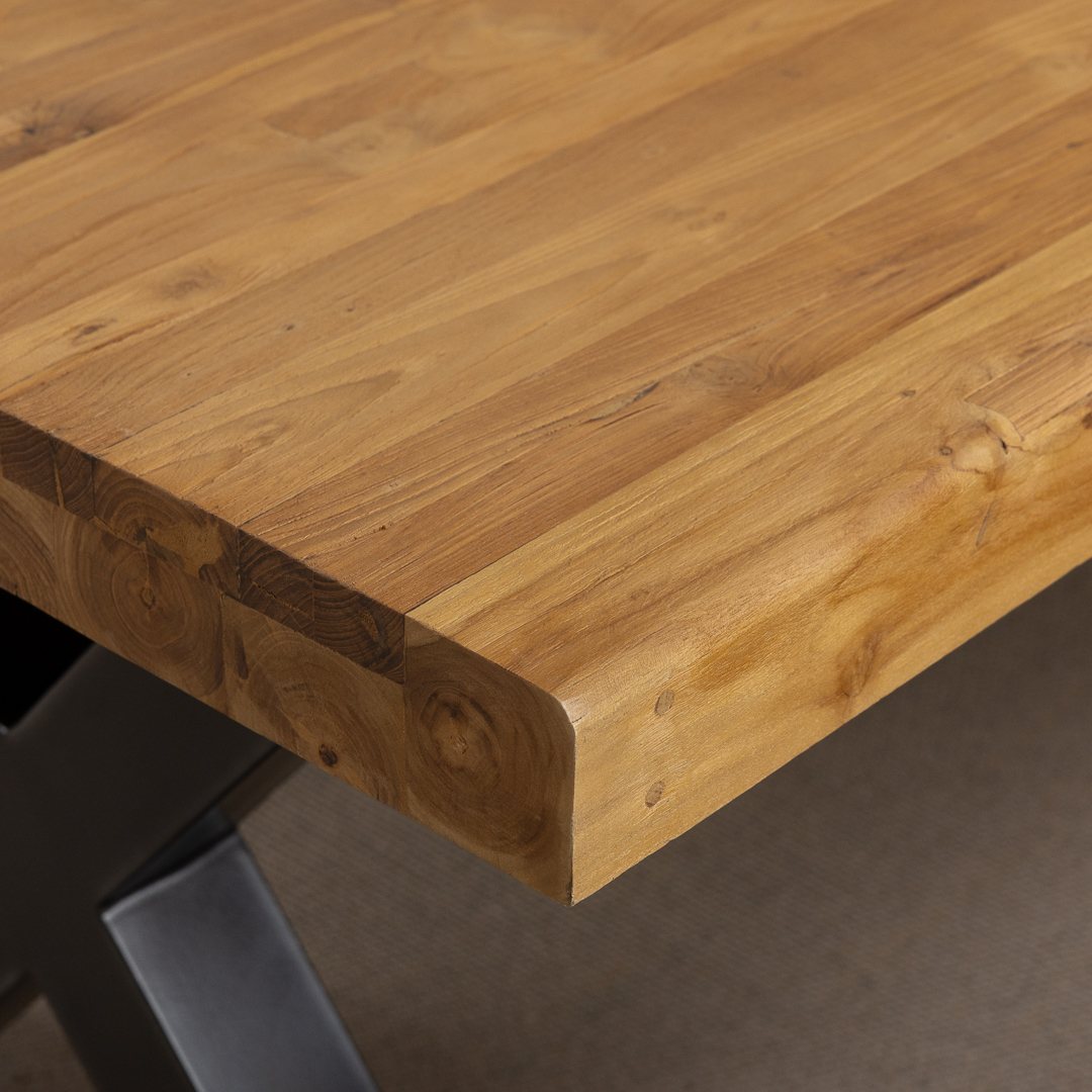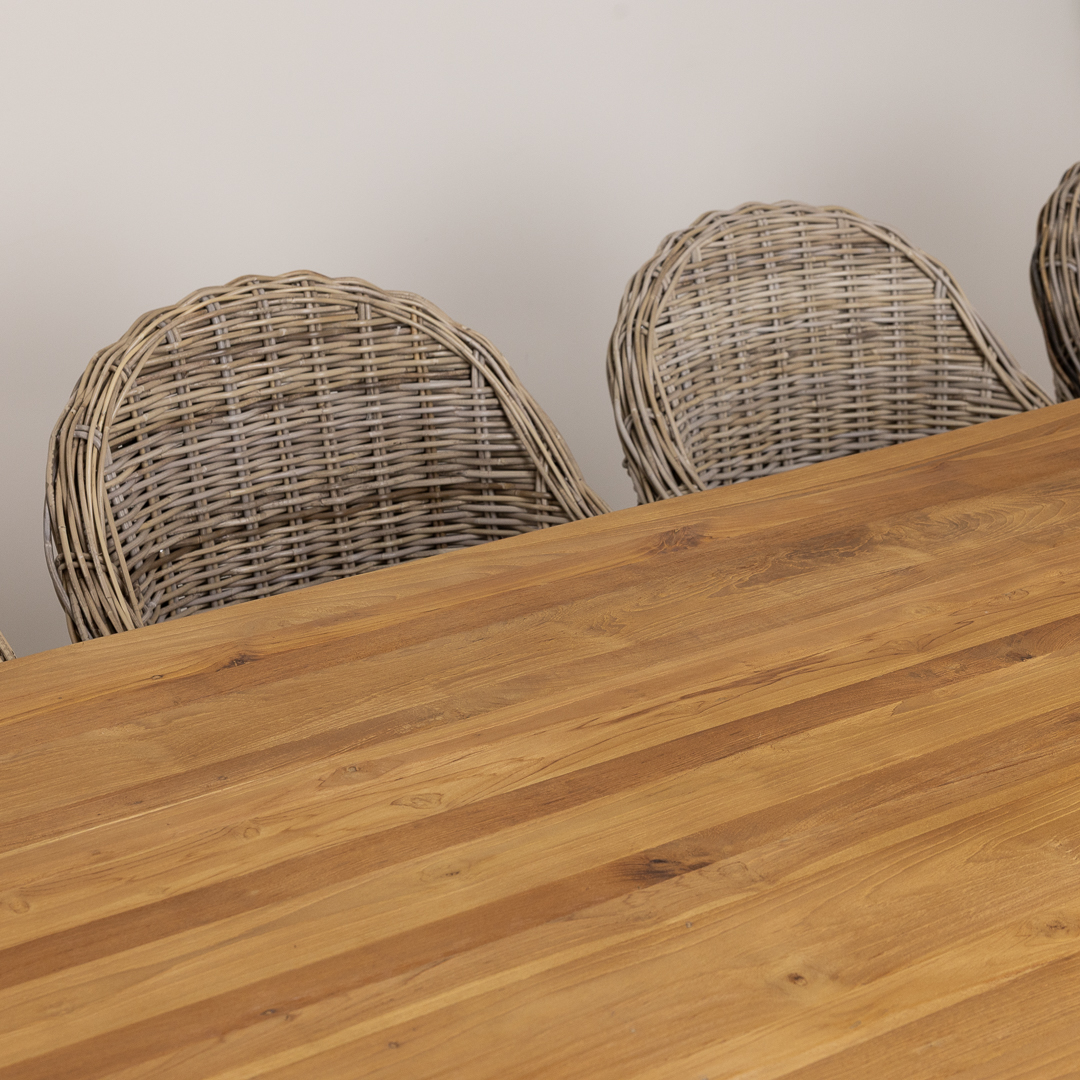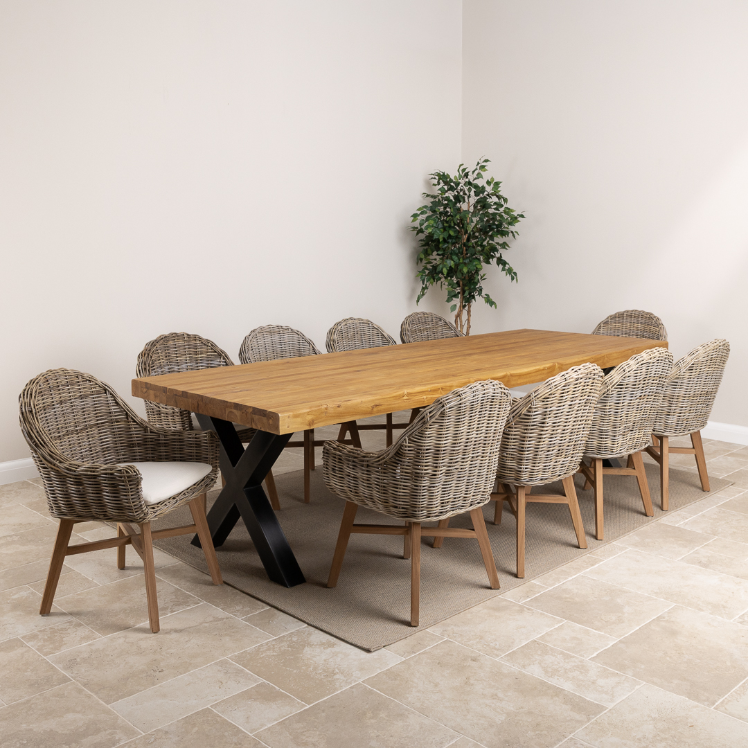 Pairing a 300cm reclaimed teak and steel cross‑leg table with handwoven Kubu wicker Scandi armchairs, this set blends modern silhouettes with rustic‑industrial materials. A contemporary, spacious dining solution designed for style, comfort, and social gatherings.