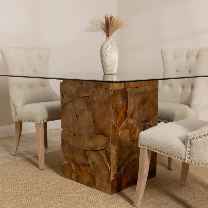 Our stunning and unique root block dining table is slightly different from our other teak root tables. This particular design is made up of root pieces which have been placed together to form a more contemporary-style pedestal base. Manufactured from reclaimed teak root, this is a solid and strong centre piece for any dining area! Each root is very unique, and you will never see the same root detailing twice. Excavating the roots encourages the regrowth of forests and promotes sustainable livelihoods for local people. When creating these wonderful masterpieces, there is no waste, as any smaller pieces of teak root are sculpted into amazing individual mirror designs, stunning bowls or even root balls that can be used for various things.