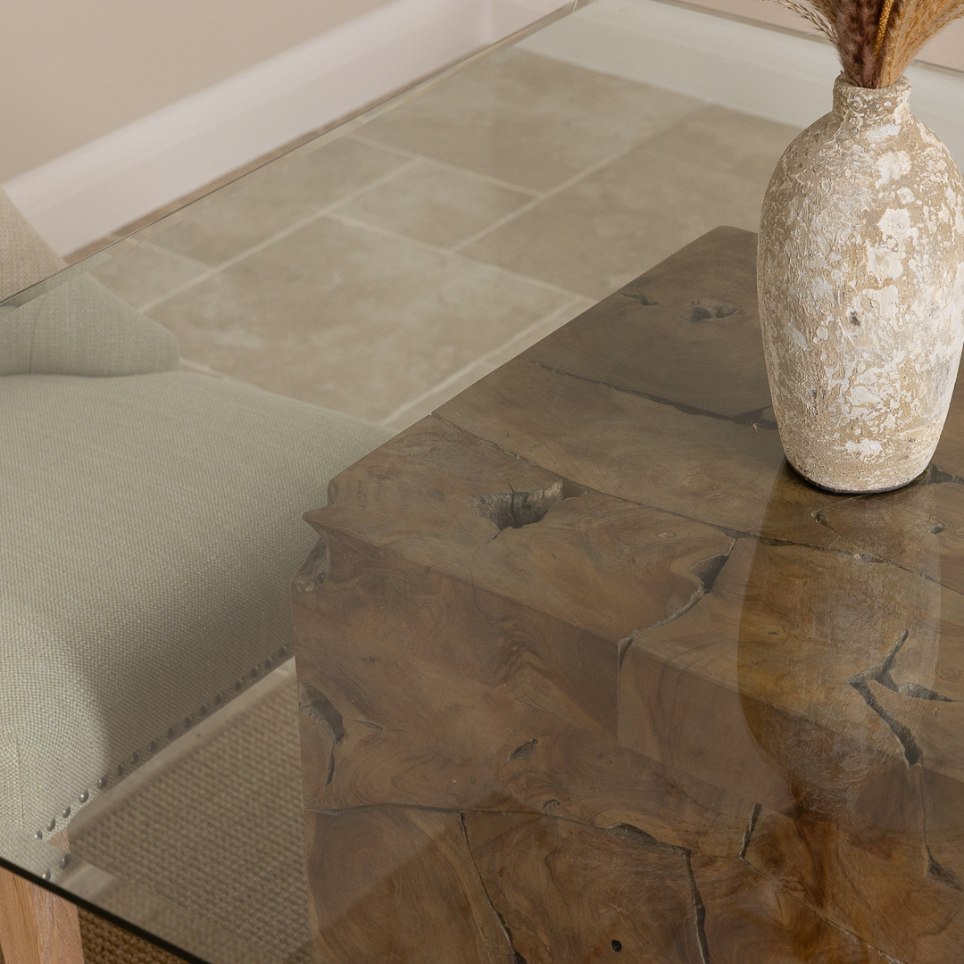 The glass we use is toughened safety glass that is 10mm thick with bevelled edges, which makes this glass top extremely heavy. It simply rests on top of the root and is supported very safely by the structure of the root base underneath. If required, we can provide small rubber dots or suckers to place between the glass and the root to add some extra friction and peace of mind, but most people find these are not necessary and that they detract from the natural look of the table.