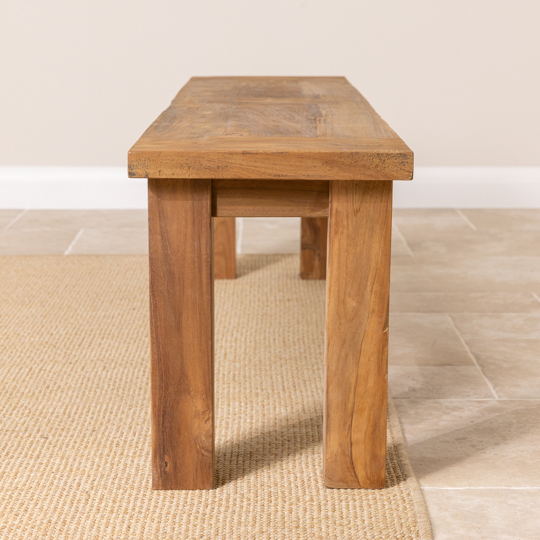 Our Mexico dining bench is made from solid reclaimed teak and is perfect to complement our Mexico dining table or any of our other reclaimed teak dining tables. A really solid bench, perfect for squeezing the whole family around the table. The wood is well-seasoned and reclaimed from old colonial buildings. The timbers are then crafted into beautiful pieces of furniture, such as these benches. A hard-wearing piece that will last your family for generations and can easily handle the wear and tear of everyday life.