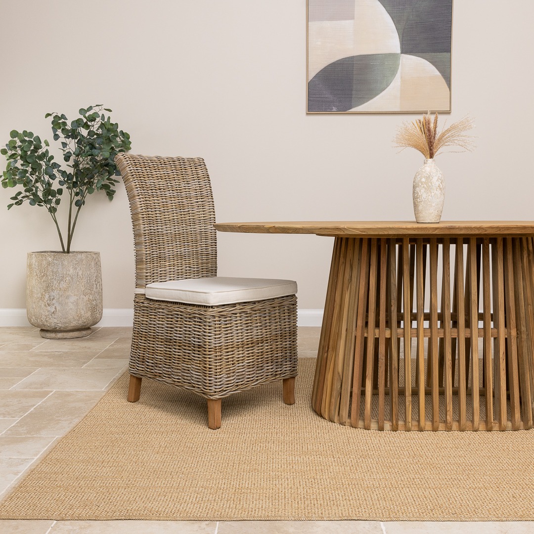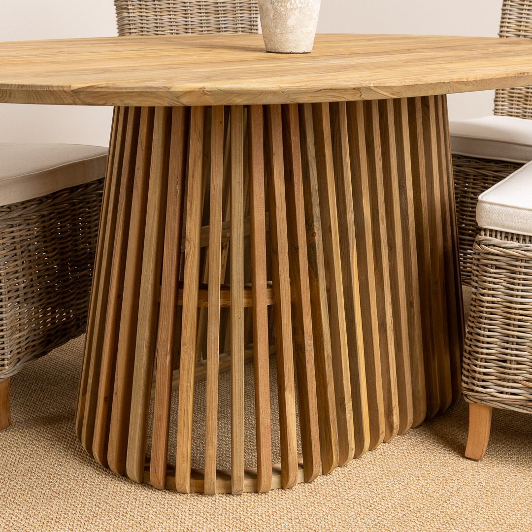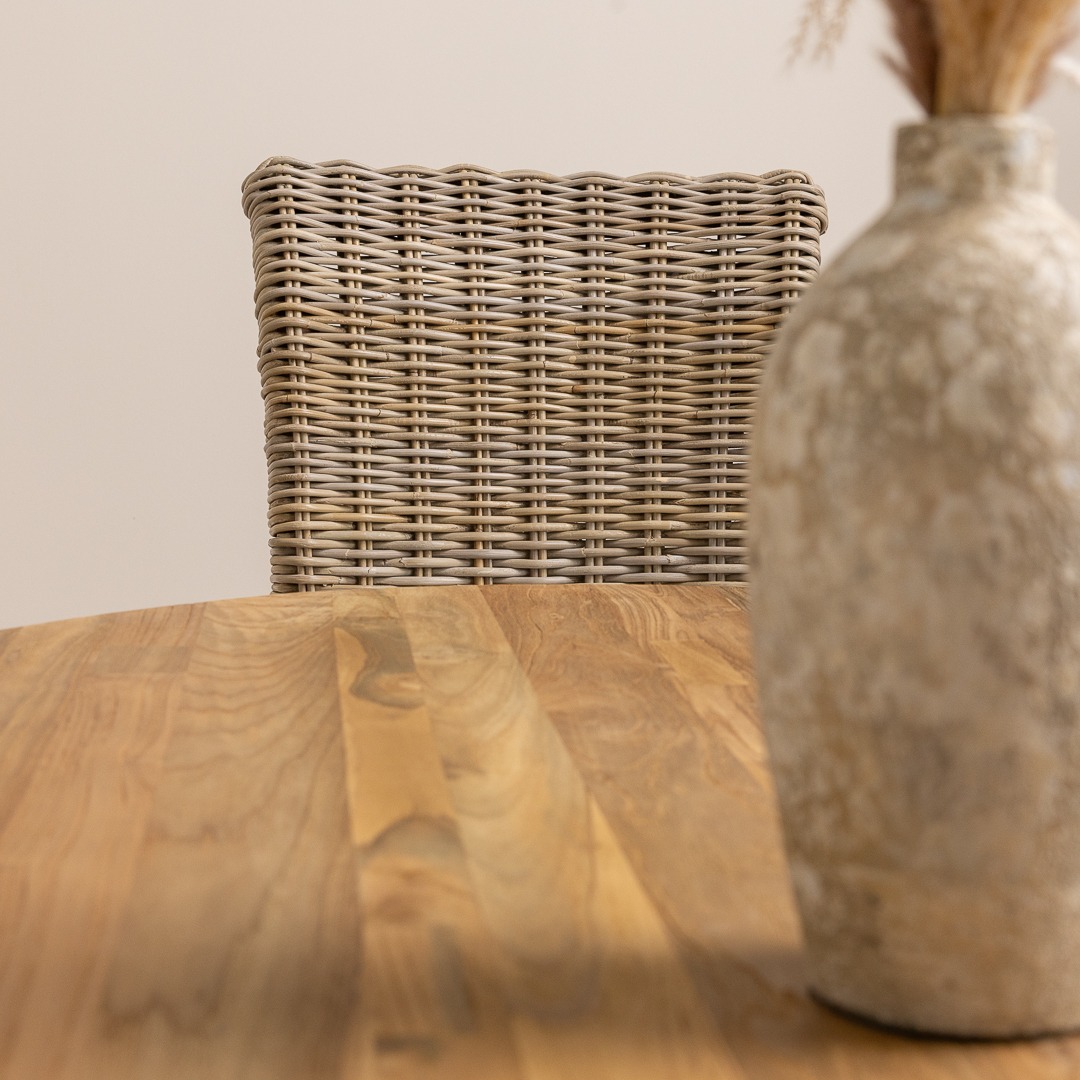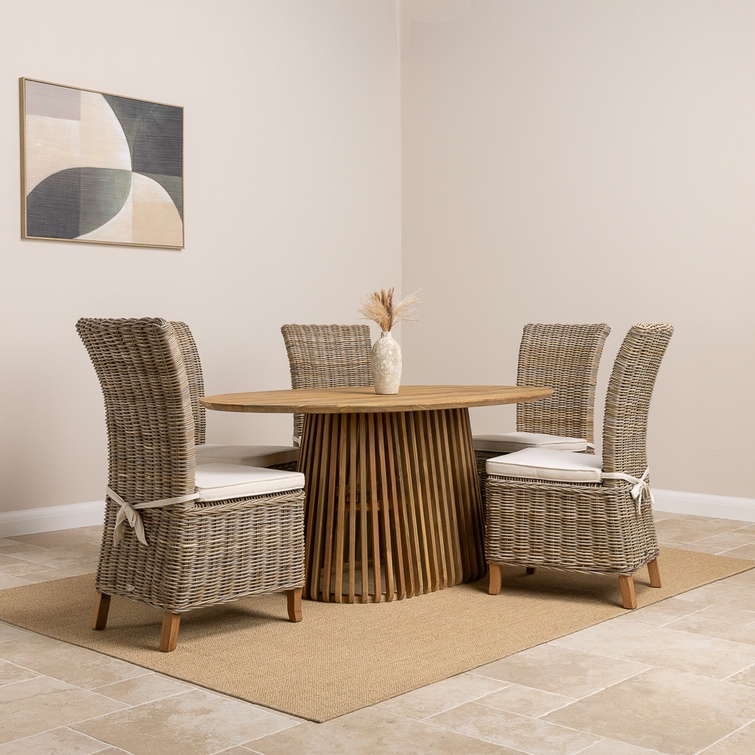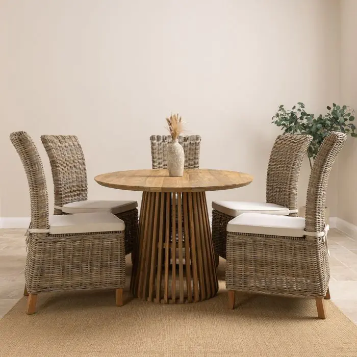 The Reclaimed Teak Eclipse Dining Table with Ribbed Cylindrical Base is a striking fusion of organic beauty and modern craftsmanship. Featuring a beautifully crafted tabletop made from sustainably sourced reclaimed Teak, this table highlights the rich, natural grain patterns and warm, earthy tones unique to each piece. The standout slatted base adds a contemporary twist to the traditional charm of reclaimed teak, offering your space a dynamic texture and visual interest. Paired with six Natural Wicker Latifa Dining Chairs, this set strikes the perfect balance between comfort and style. Together, the table and chairs create a welcoming atmosphere that seamlessly blends rustic warmth with contemporary design.