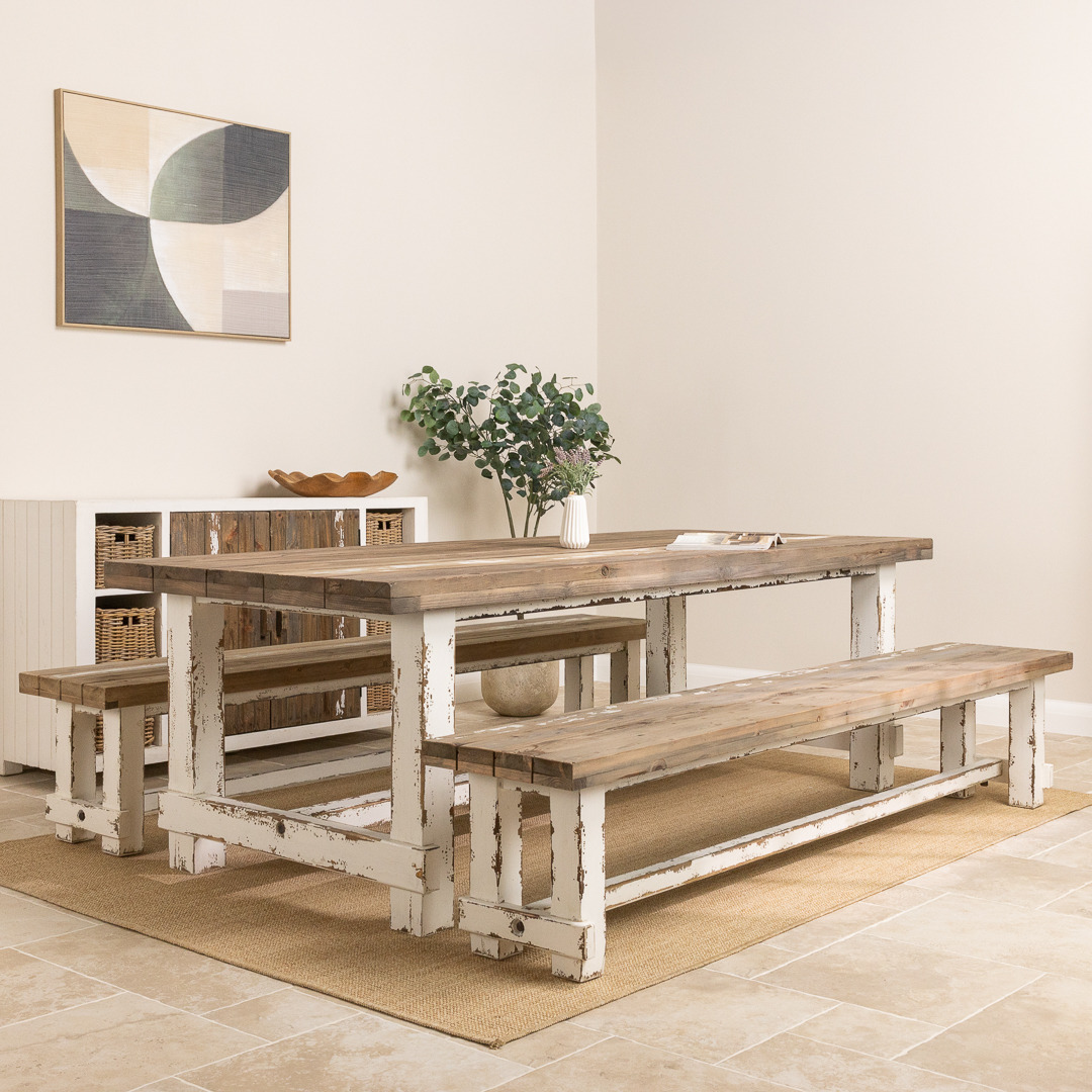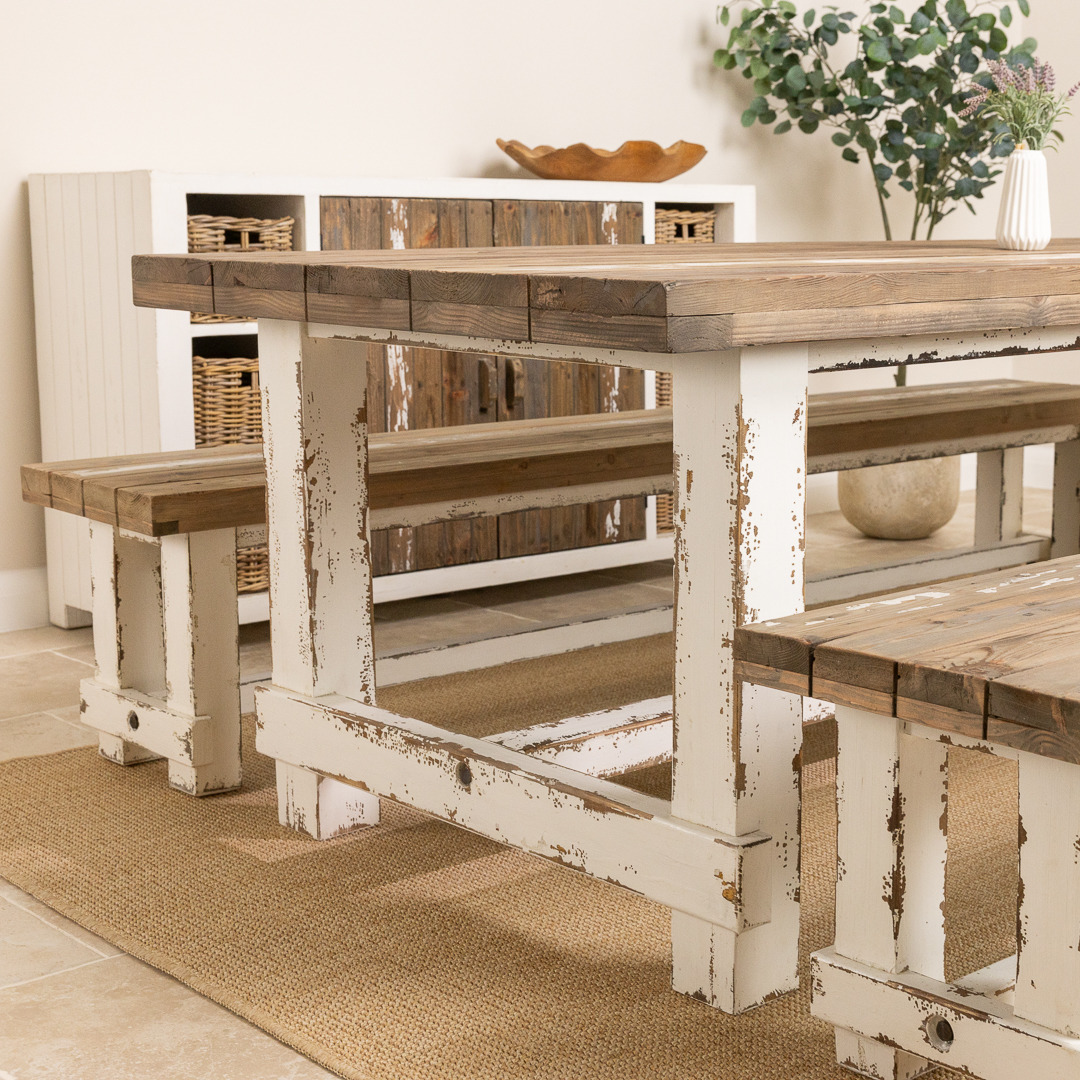 We just love our distressed Coastal range, so much so, we are sure that you will inevitably fall in love with it too. Our stunning coastal range is inspired by casual and carefree lifestyles, along with the rest of the collection. With a thick reclaimed pine tabletop and chunky legs, this weighty table will be the heart of your home and fit for all occasions. The substantial and stylish coastal table paired with our matching dining benches creates a casual dining set-up that will suit everyday dining or dress it up for your dinner party needs. Manufactured from sustainably sourced reclaimed pine with a distressed rustic finish that is bang on-trend.