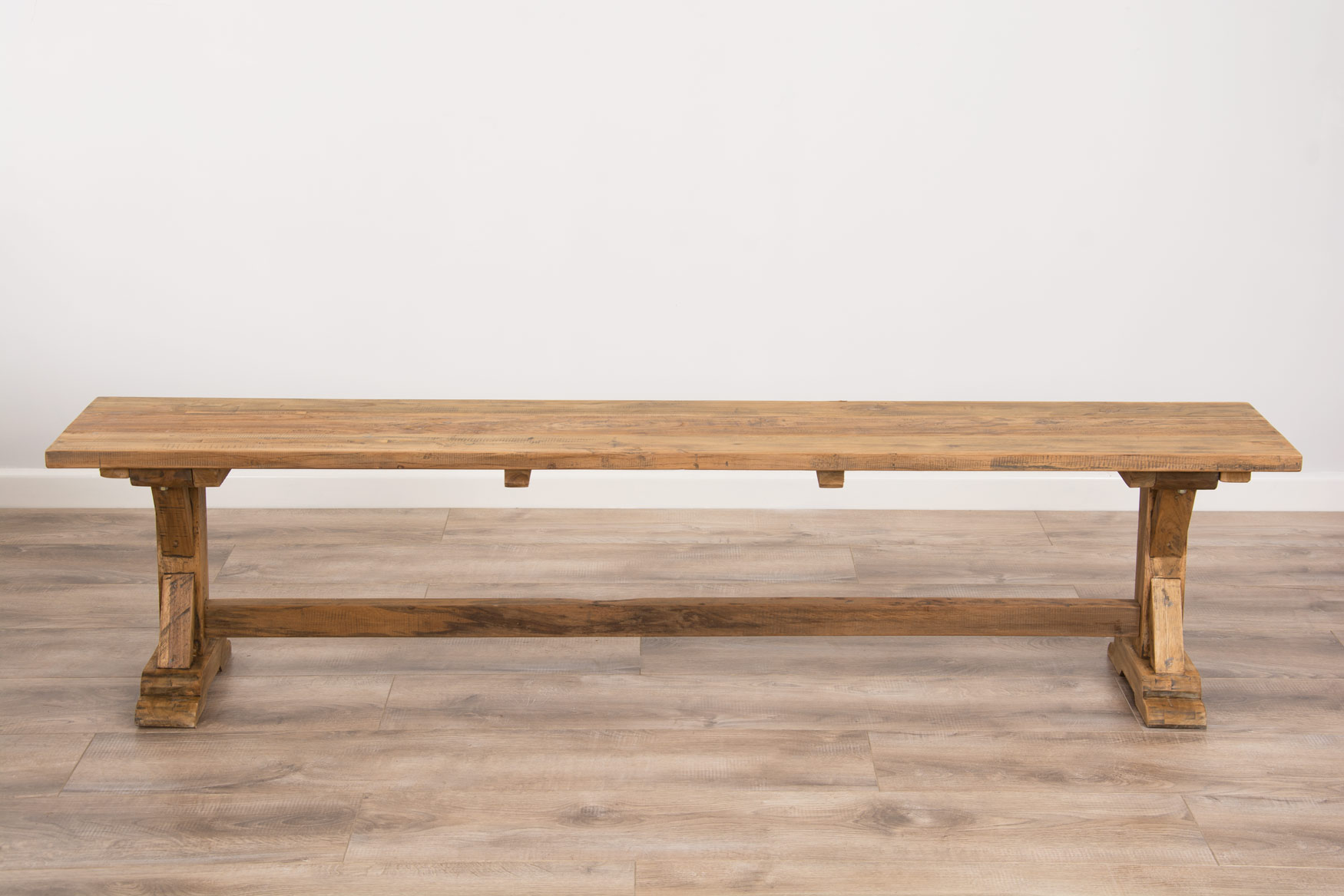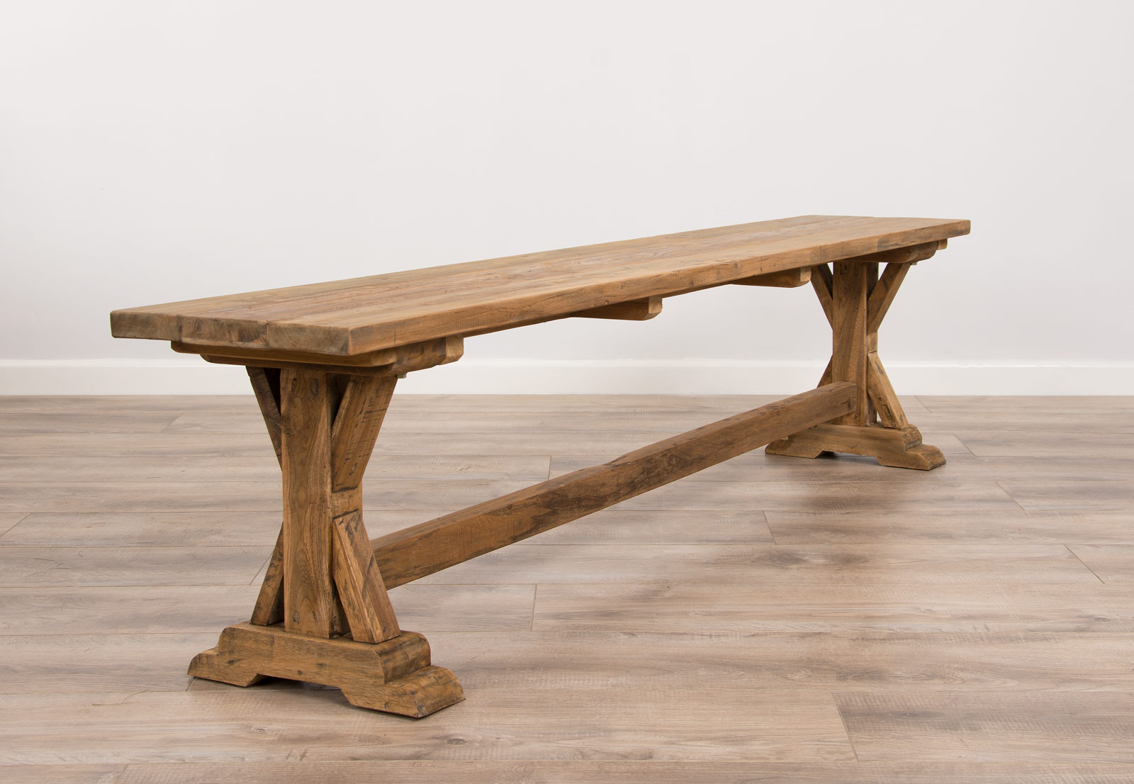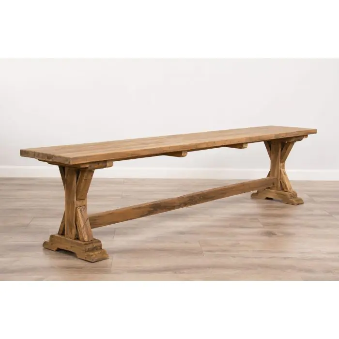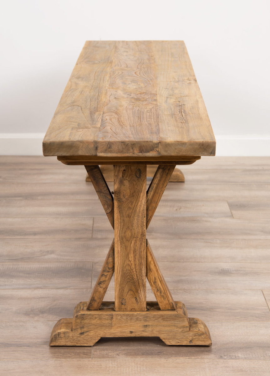 Our Refectory dining bench is a truly rustic farmhouse-style bench that has a detailed cross pedestal base, this bench has been manufactured from solid reclaimed teak and can be married together with our Refectory dining tables, or any of our other reclaimed teak dining tables. This solid bench is perfect for squeezing the whole family around the table with a smooth finish that will wipe clean. This wood is extremely well seasoned and is reclaimed from old colonial buildings, the timbers are then crafted into beautiful pieces of furniture, such as these benches. A hard-wearing piece that will last your family for generations and can easily handle the wear and tear of everyday life.