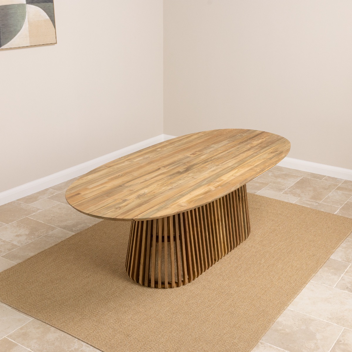 The Reclaimed Teak Eclipse Dining Table with Ribbed Cylindrical Base is a striking fusion of organic beauty and modern craftsmanship. Featuring a beautifully crafted tabletop made from sustainably sourced reclaimed Teak, this table highlights the rich, natural grain patterns and warm, earthy tones unique to each piece. The standout slatted base adds a contemporary twist to the traditional charm of reclaimed teak, offering your space a dynamic texture and visual interest.