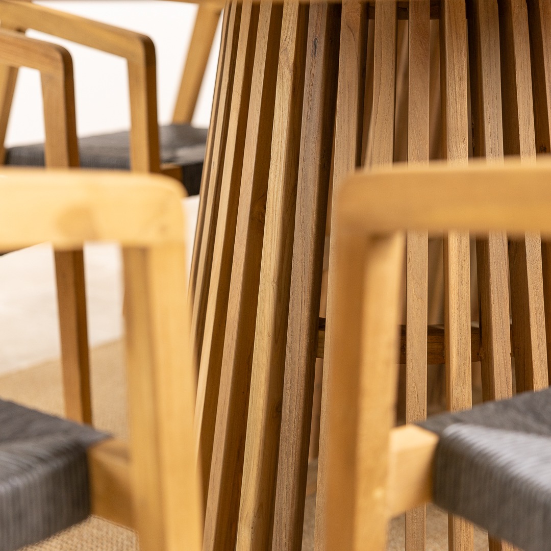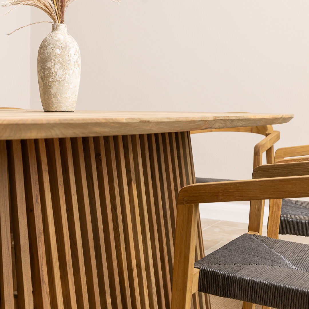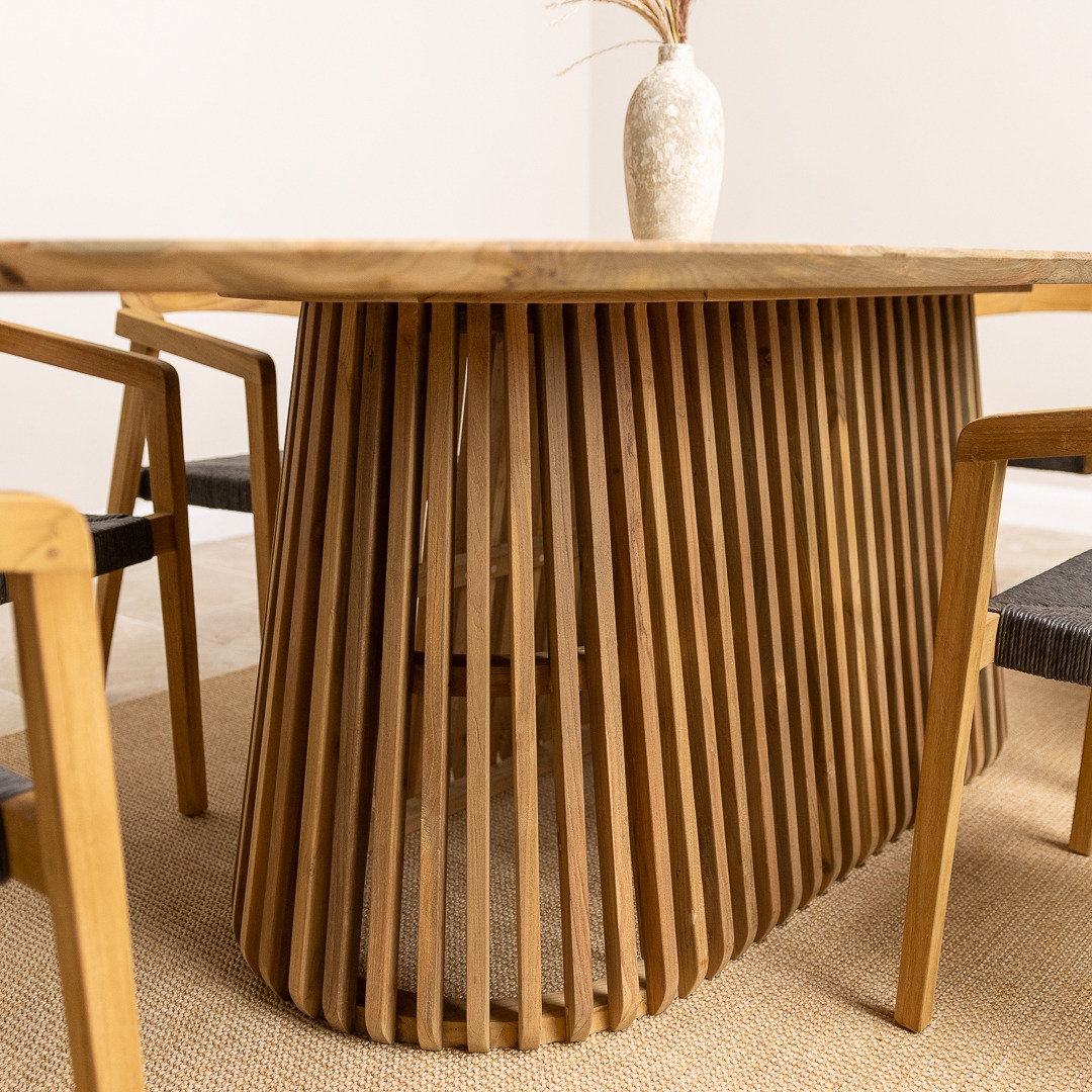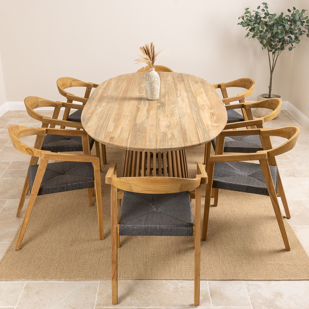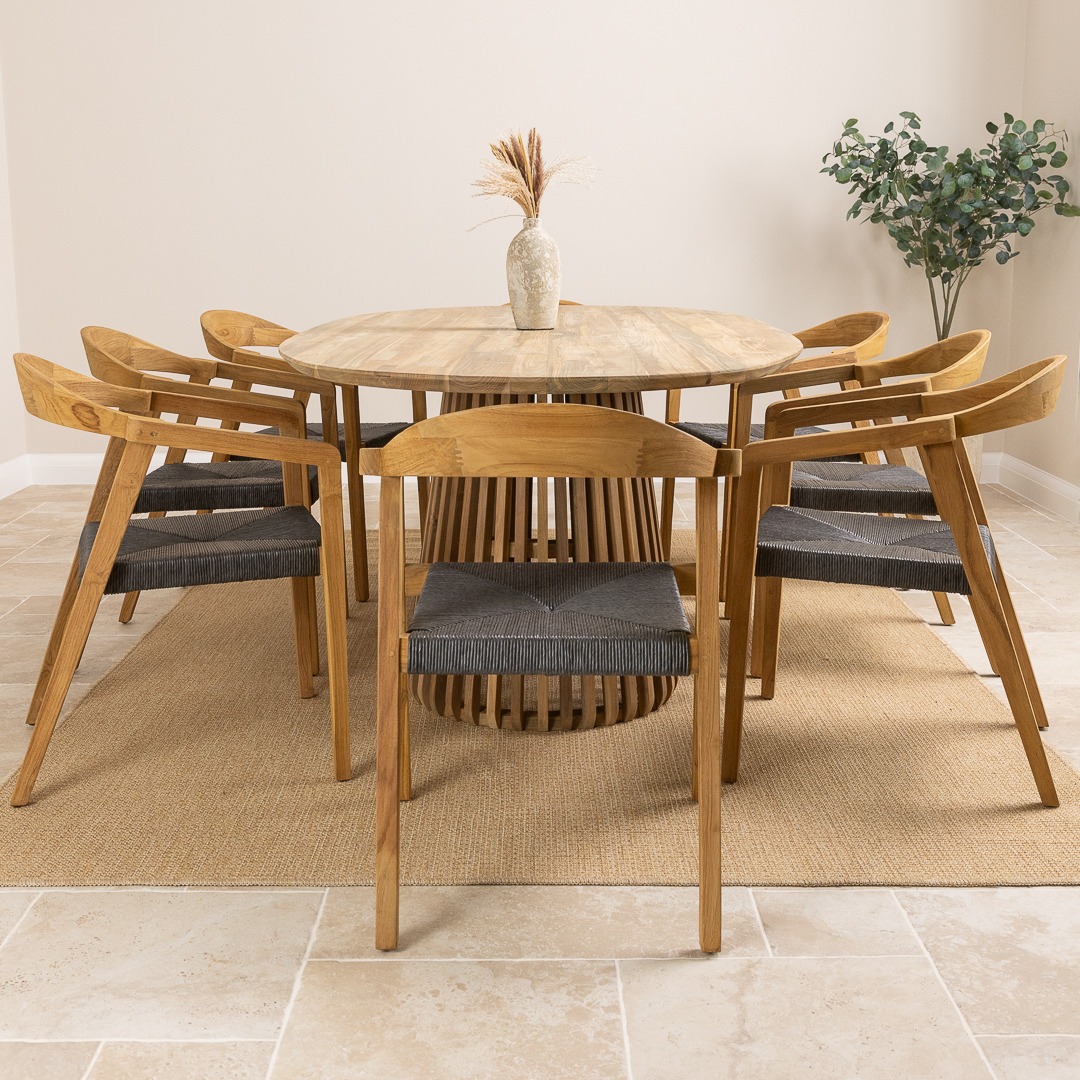 The Reclaimed Teak Eclipse Dining Table with Ribbed Cylindrical Base is a stunning blend of natural elegance and modern design. Crafted from sustainably sourced reclaimed teak, the tabletop showcases the wood’s rich grain patterns and warm, earthy tones, ensuring every piece is truly one-of-a-kind. Its sculptural ribbed base introduces a contemporary edge, adding depth and texture to your dining space. Paired with eight reclaimed teak dining chairs, the set embodies both comfort and style. The chairs enhance the table’s natural warmth and pair easily with its clean, modern lines, creating a relaxed blend of rustic charm and contemporary style.