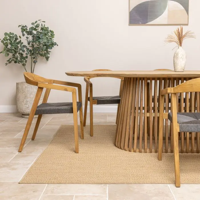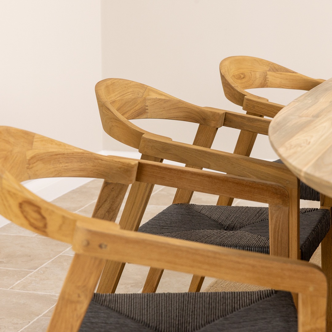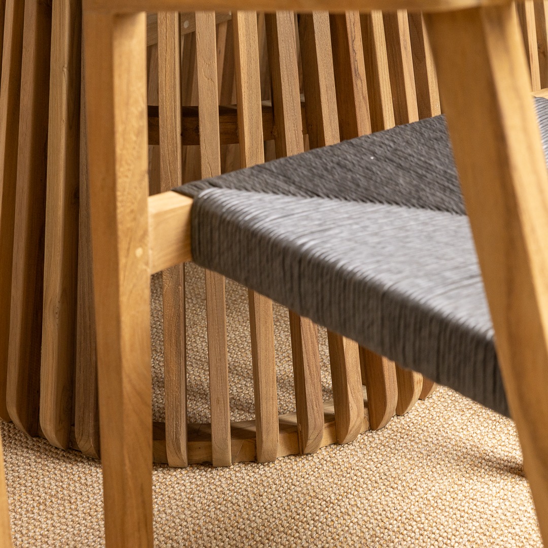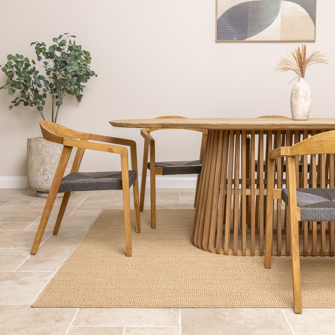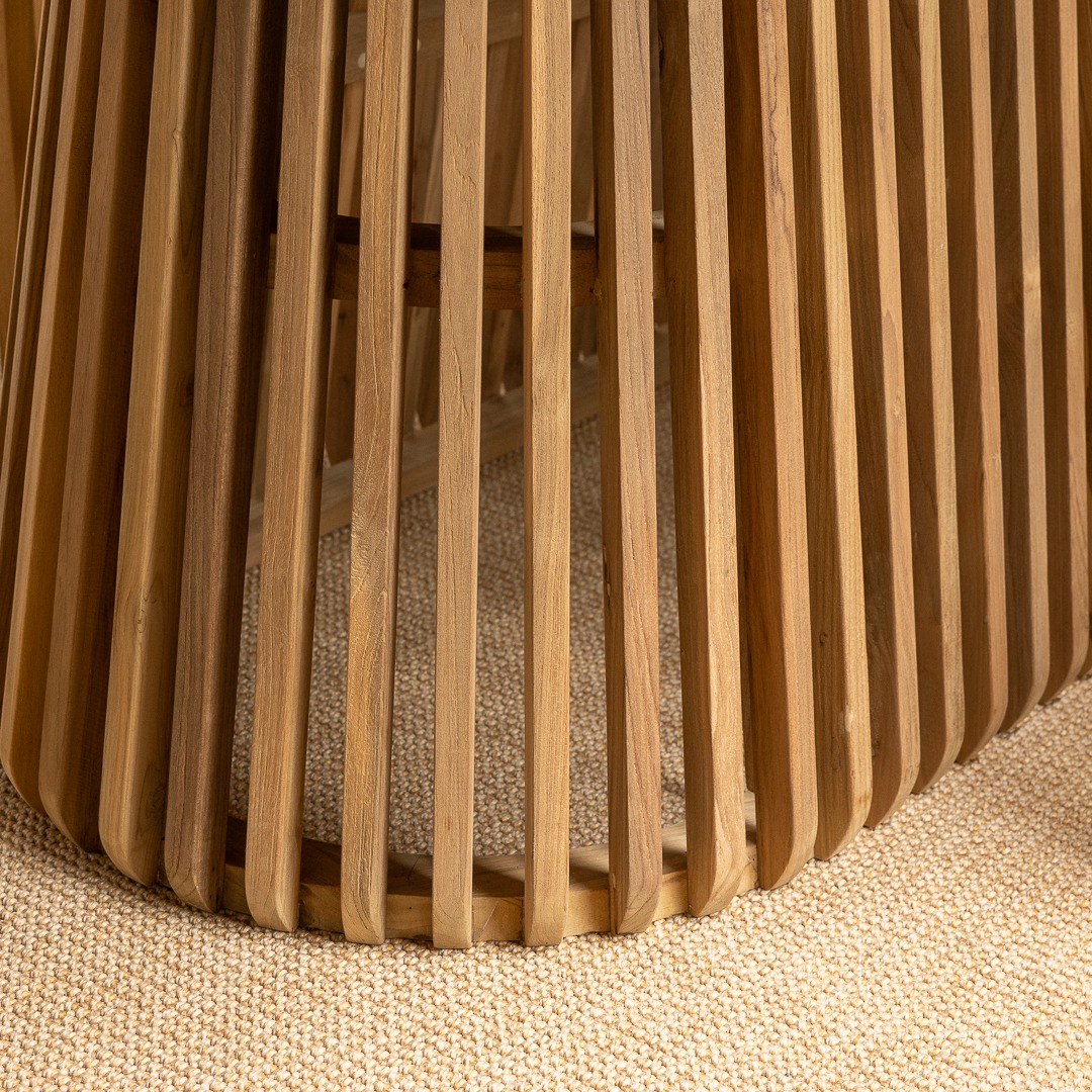 The Reclaimed Teak Eclipse Dining Table with Ribbed Cylindrical Base is a stunning blend of natural elegance and modern design. Crafted from sustainably sourced reclaimed teak, the tabletop showcases the wood’s rich grain patterns and warm, earthy tones, ensuring every piece is truly one-of-a-kind. Its sculptural ribbed base introduces a contemporary edge, adding depth and texture to your dining space. Paired with eight reclaimed teak dining chairs, the set embodies both comfort and style. The chairs enhance the table’s natural warmth and pair easily with its clean, modern lines, creating a relaxed blend of rustic charm and contemporary style.