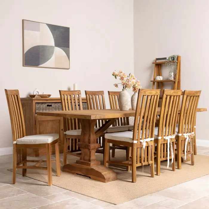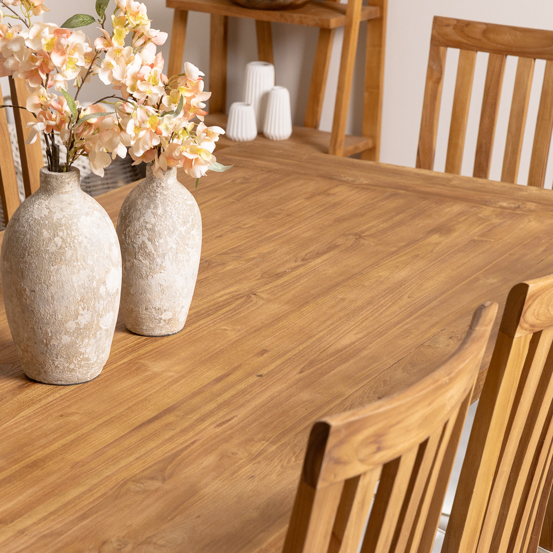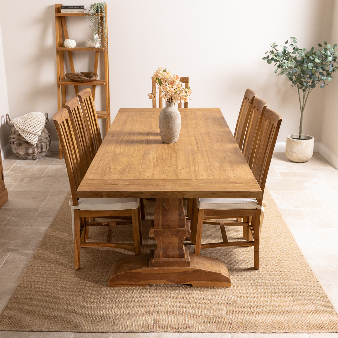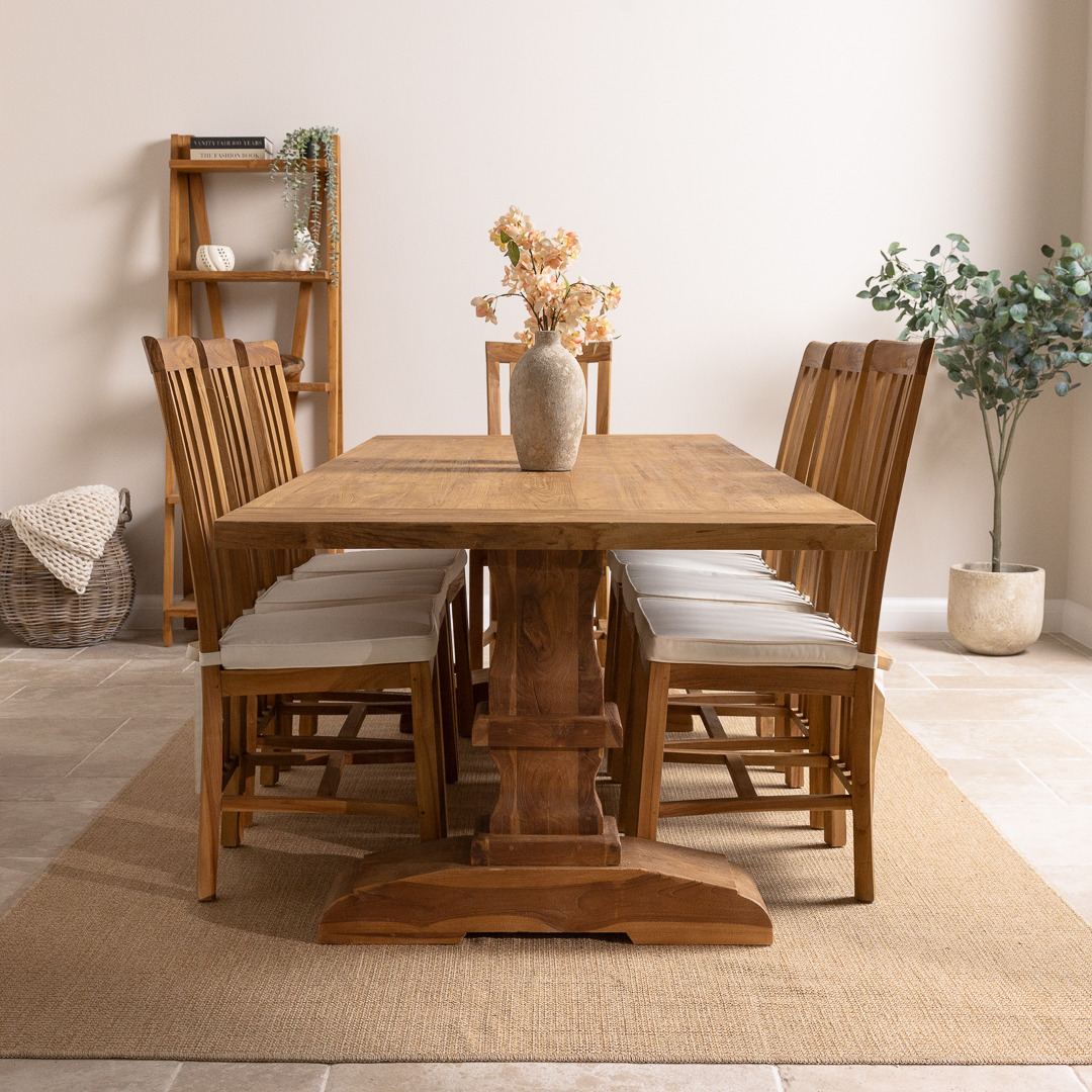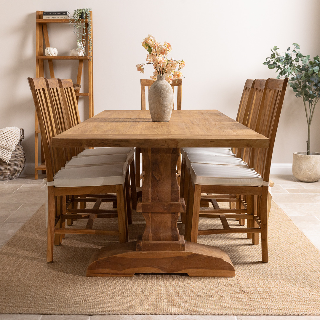 Our delightful Monastery reclaimed teak table has been manufactured from timber sourced from old Colonial buildings. It has a very stylish and natural-looking appearance, which makes it great for a dining room or conservatory. The beautiful Monastery table has been reworked by craftsmen using traditional joinery methods to form a chunky pedestal-legged base. The Monastery reclaimed teak dining table matches our Santos dining chairs perfectly, which makes a lovely set in your home. The Santos chair has an extra brace in between the legs, giving the chair its sturdy finish. The Santos' high back adds style to your dining room and will really impress your guests. Handcrafted from sustainably sourced Teak using traditional joinery techniques.