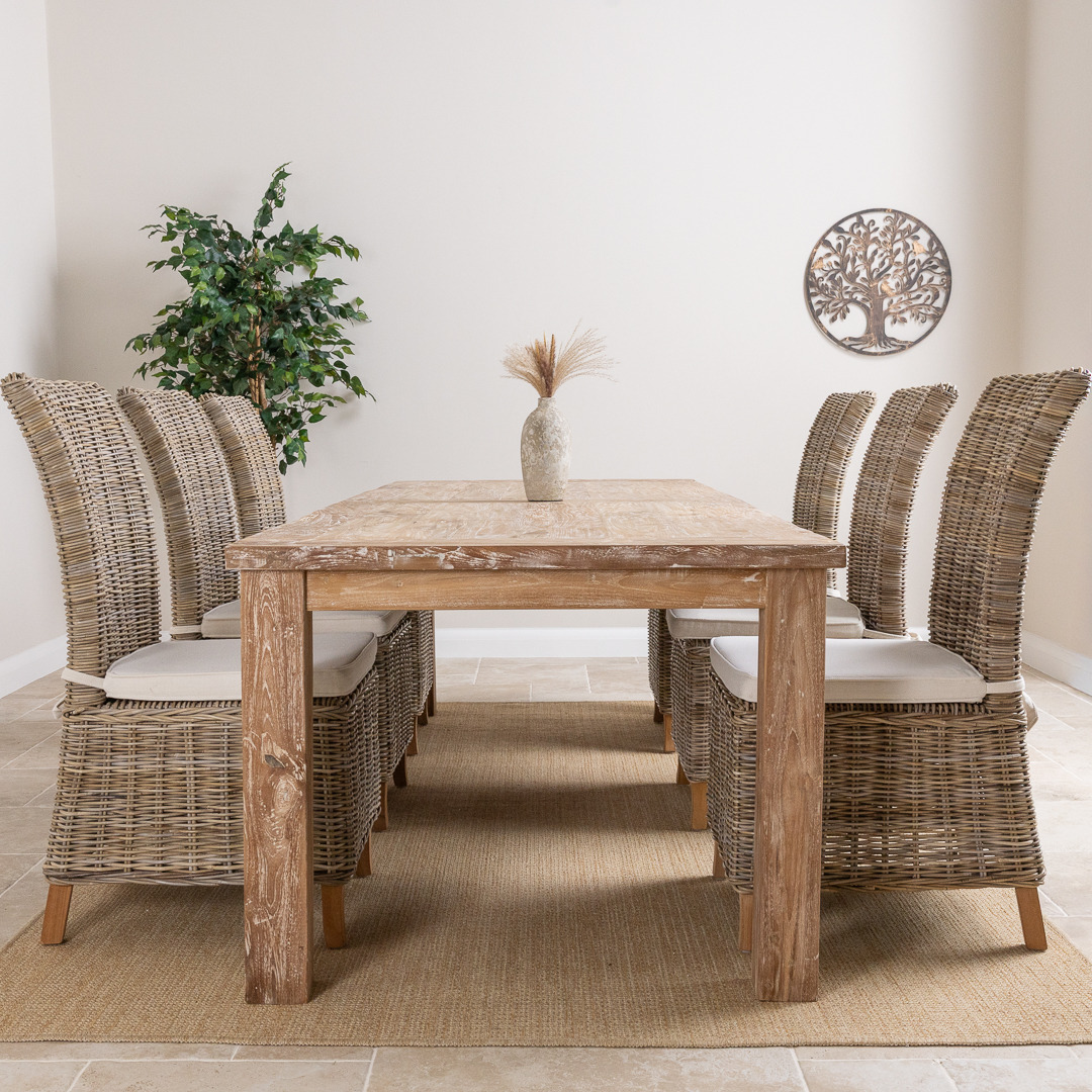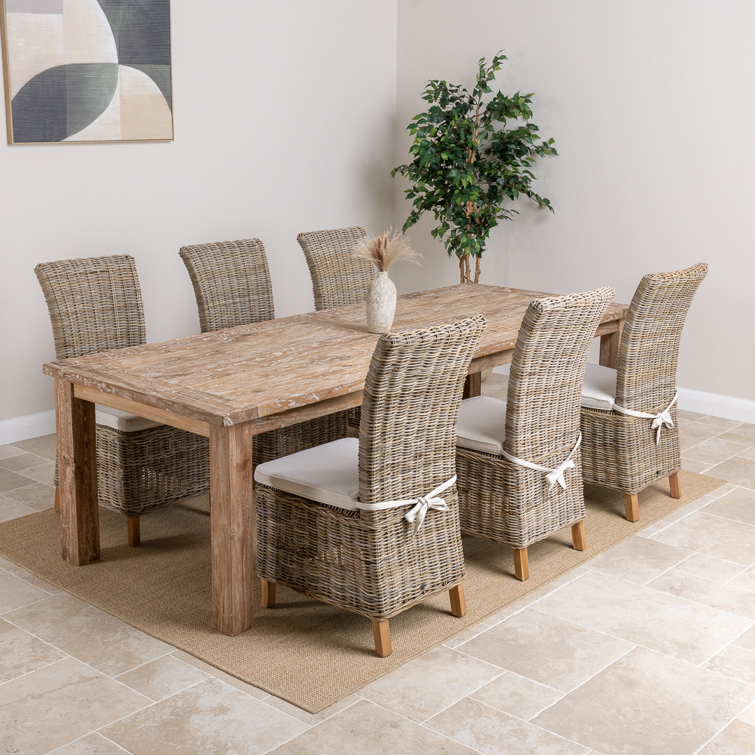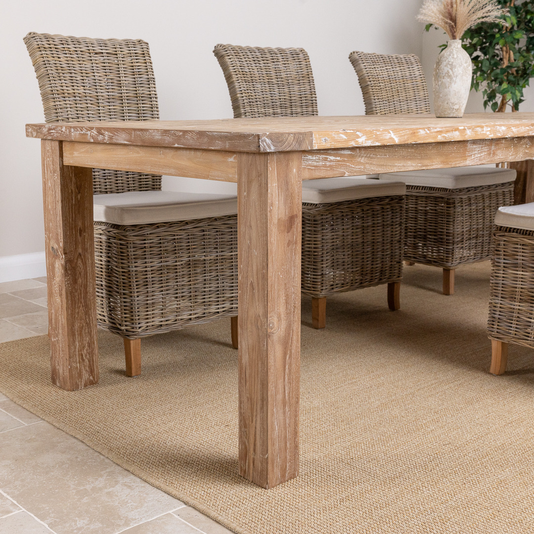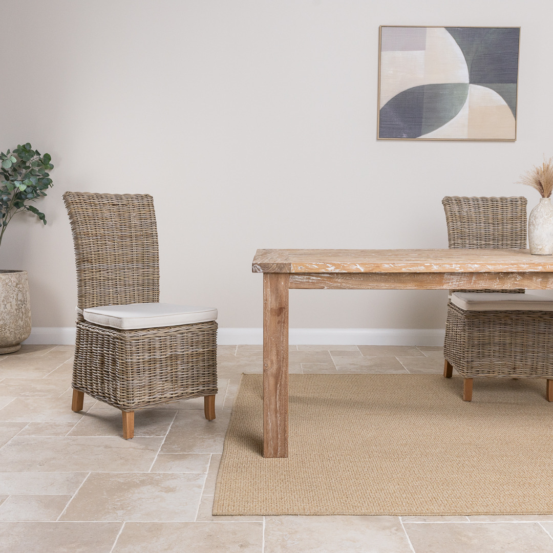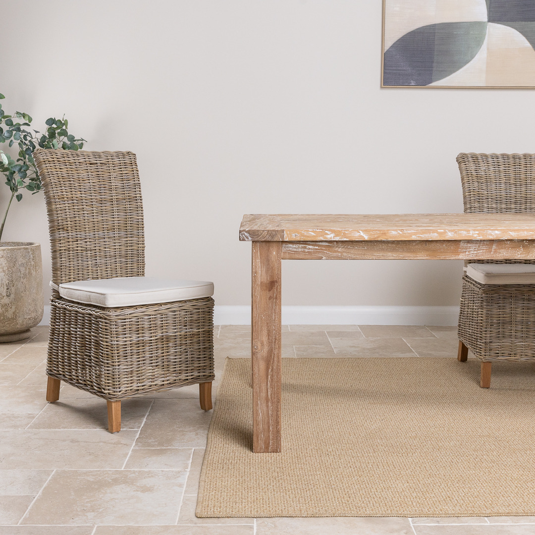 Our simply stunning Mexico dining table is manufactured from solid reclaimed Teak and features a smooth sanded finish that really makes the natural grain of the beautiful timber stand out with the whitewash finish embedded in the grain of the timber. The Mexico table carries its chunky legs, making this table perfect for a farmhouse kitchen to combine style and functionality. The Teak used to build the table is sourced from old Colonial buildings in West Java, Indonesia, and is manufactured using traditional joinery methods. Each table is unique and tells its own fascinating story. The Mexico table has been paired with our popular Latifa dining chairs, which have an elegant appearance, with their stylish high backs and comfortable feather-like cushions that tie neatly around the back of the chair. Each chair comes with a cushion in natural linen, which is zip-removable.