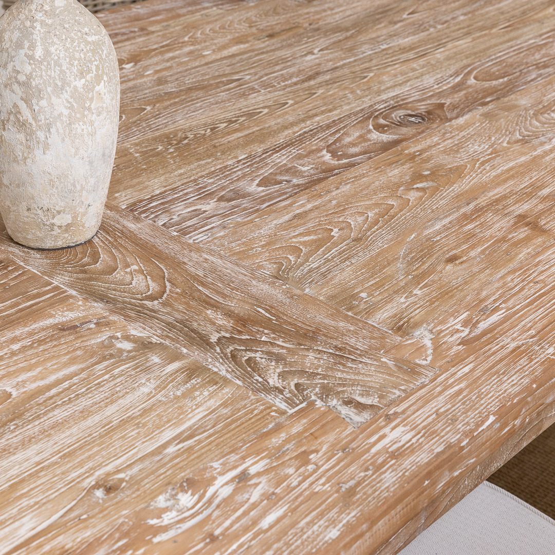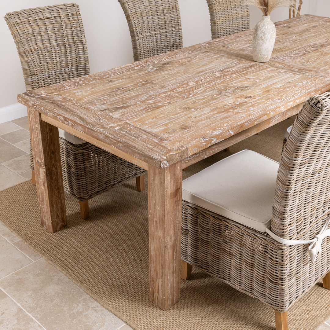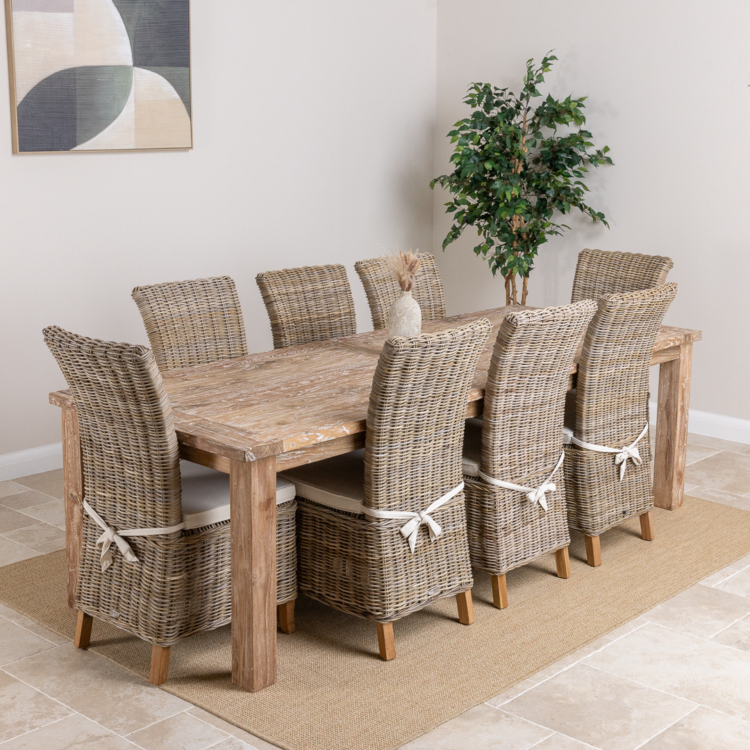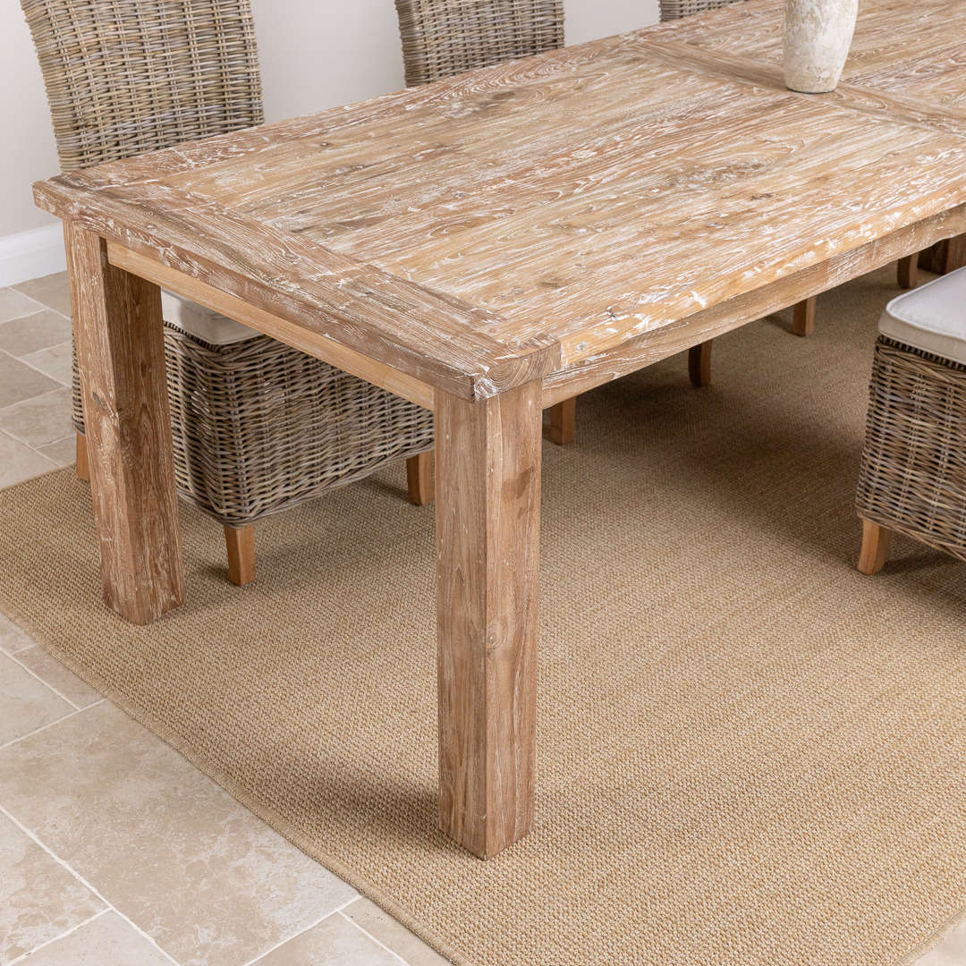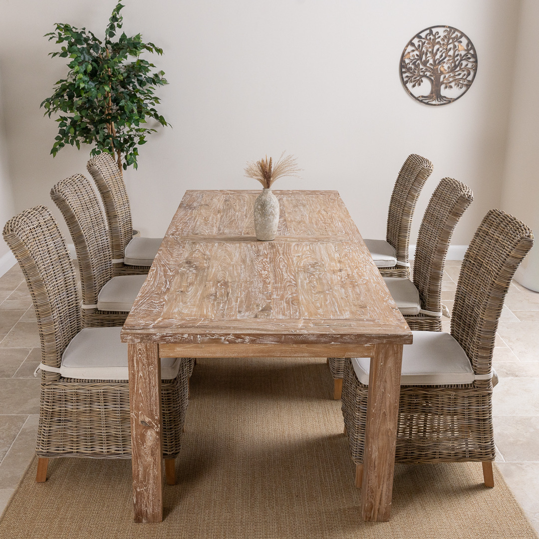 Our simply stunning Mexico dining table is manufactured from solid reclaimed Teak and features a smooth sanded finish that really makes the natural grain of the beautiful timber stand out with the whitewash finish embedded in the grain of the timber. The Mexico table carries its chunky legs, making this table perfect for a farmhouse kitchen to combine style and functionality. The Teak used to build the table is sourced from old Colonial buildings in West Java, Indonesia, and is manufactured using traditional joinery methods. Each table is unique and tells its own fascinating story. The Mexico table has been paired with our popular Latifa dining chairs, which have an elegant appearance, with their stylish high backs and comfortable feather-like cushions that tie neatly around the back of the chair. Each chair comes with a cushion in natural linen, which is zip-removable.