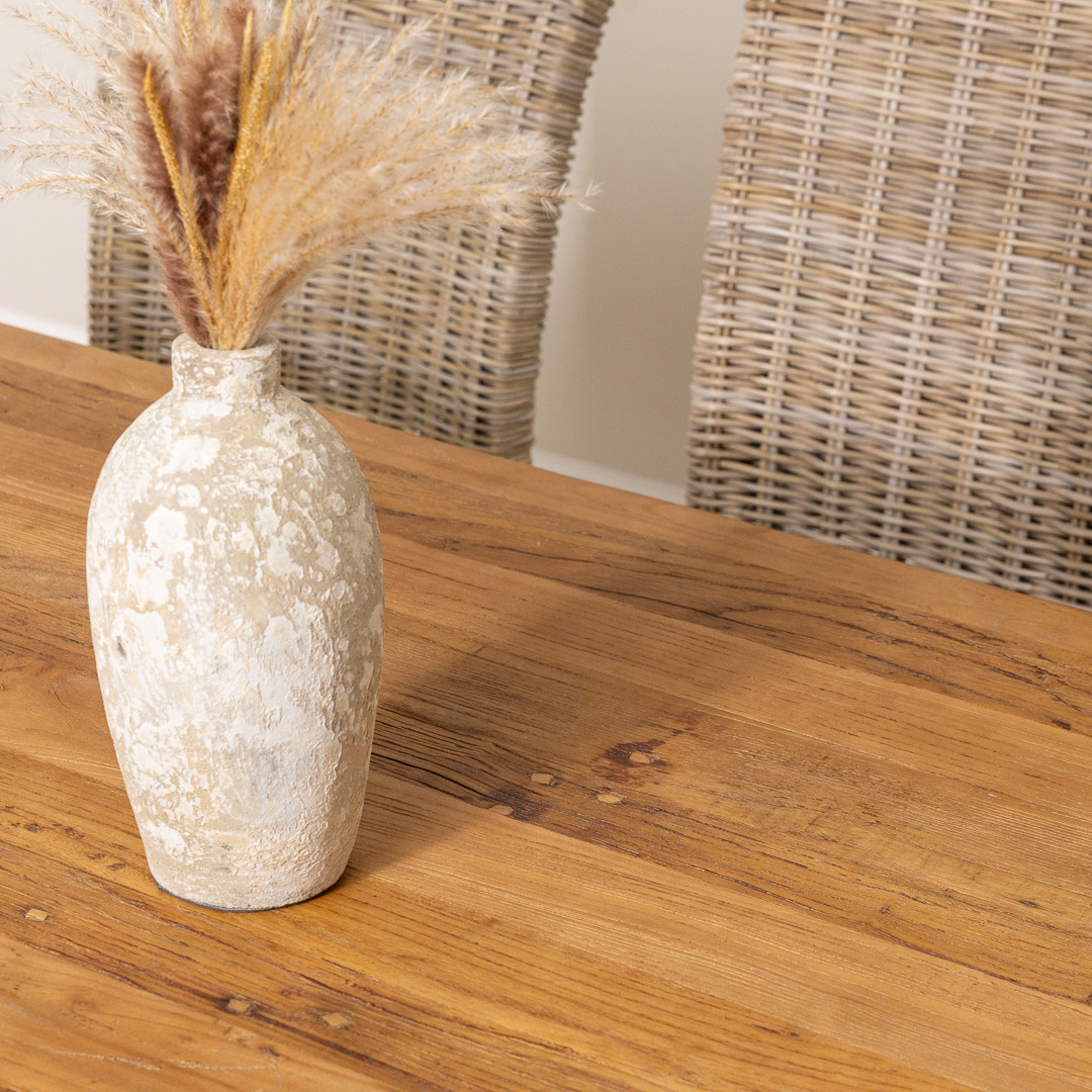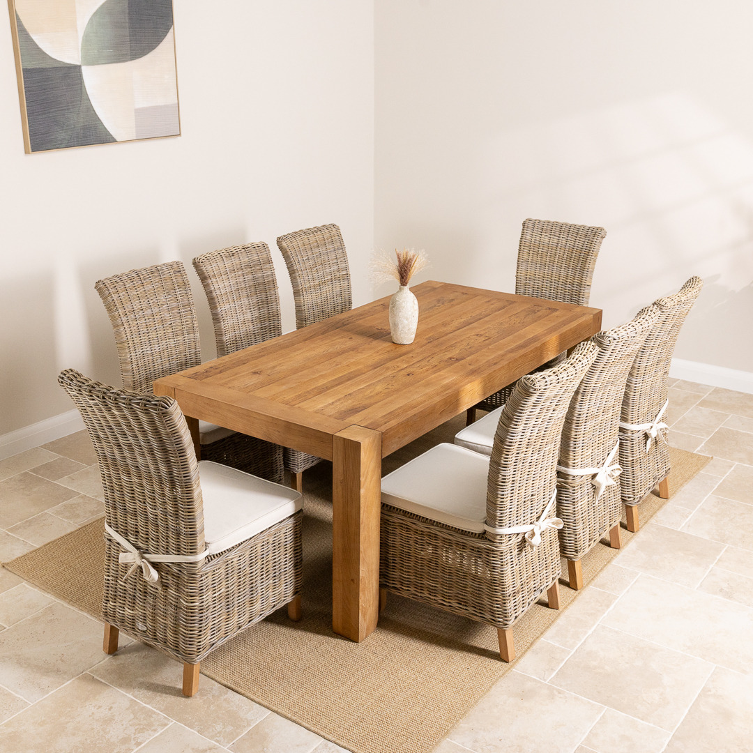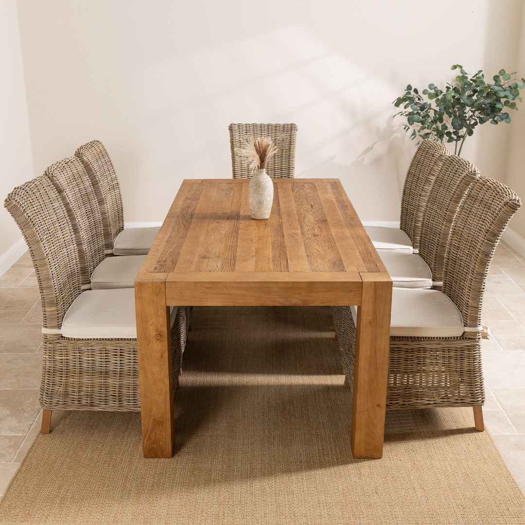 Our rustic and chunky Elm dining table is a must-have in our opinion; it’s the perfect all-rounder! The fabulous chunky reclaimed Elm dining table offers a stylish and contemporary dining experience that will last for years to come, and it's at an affordable price - what more could you want? The chunky Elm dining table would look great in a larger dining area when paired with 8 Latifa chairs, perfect for those great get-togethers with family and friends. Although a very sturdy chair, this does not detract from the elegant appearance of the Latifa, with its stylish high backs and comfortable, feather-like cushions that tie neatly around the back of the chair. Each chair comes with a cushion in natural linen, which is zip-removable. Elm has long been seen as an extremely expensive and luxurious timber; we hope to bridge that gap and make Elm the wood of choice for many of our luxurious dining sets.