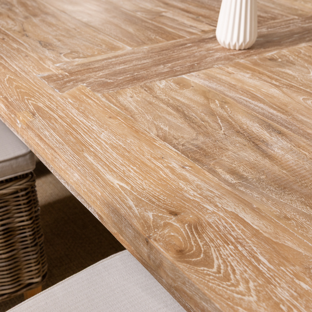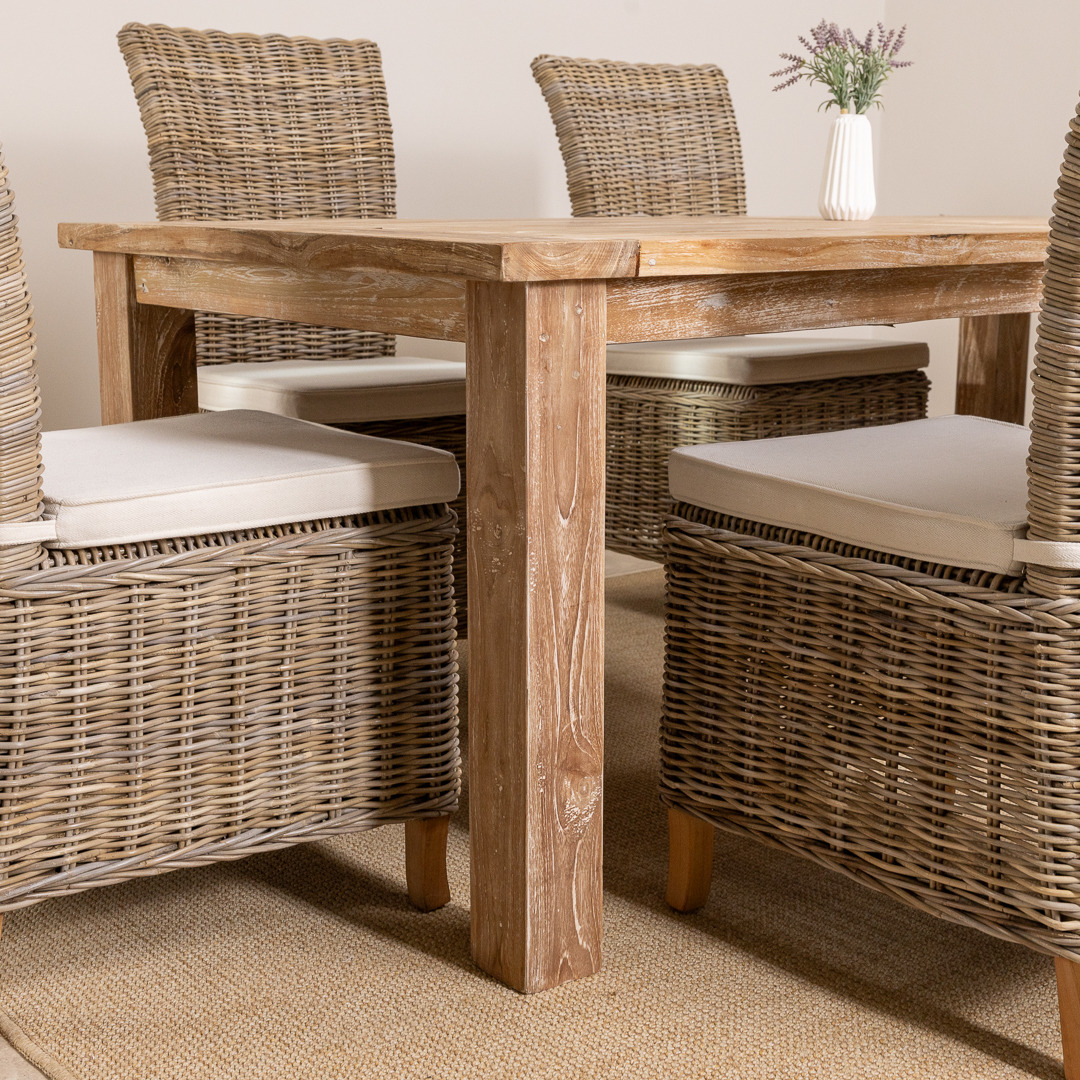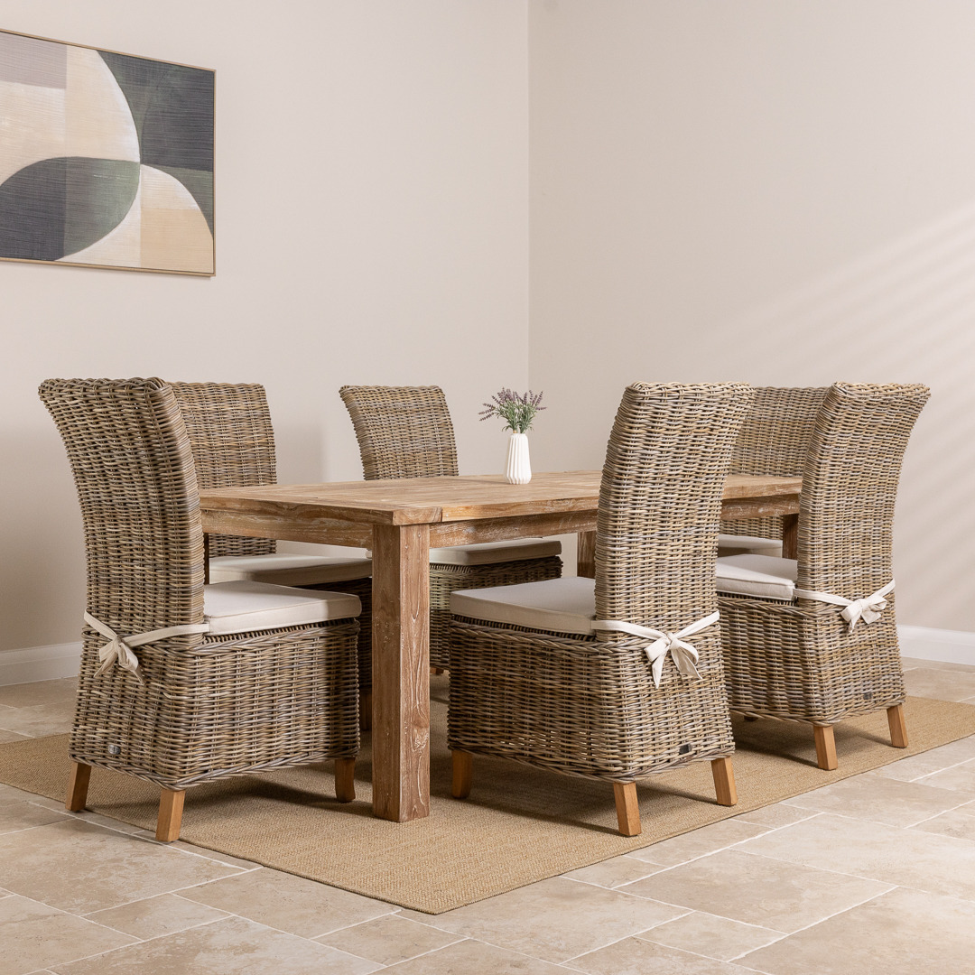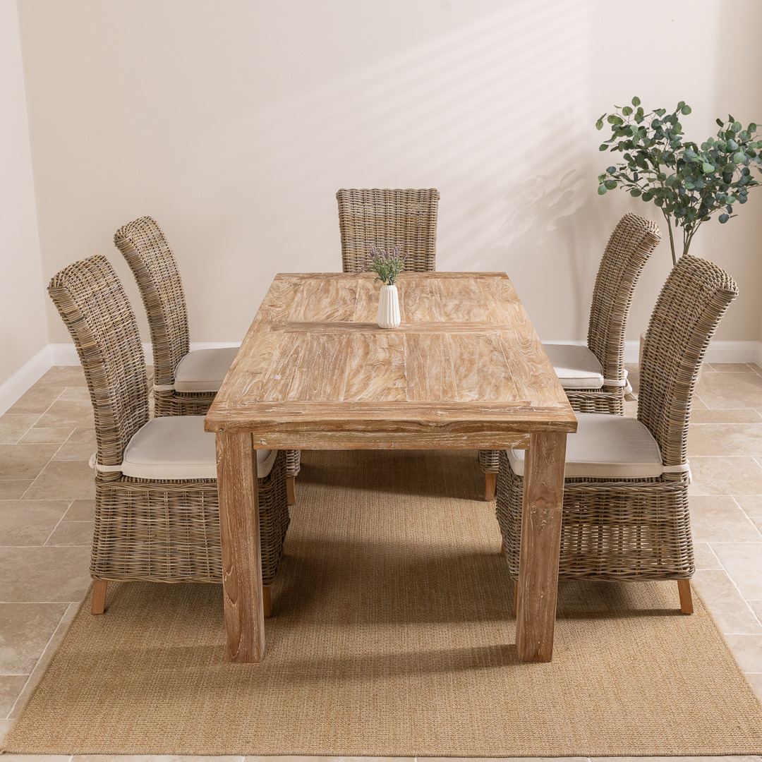 Our stylish Mexico dining table is well-suited to busy family life, making this table practical and functional for many spaces, the table also has a characterful rustic finish, where the warmth of the grain in the timber can really be appreciated and adds a warm ambience to the room with its whitewash finish. The Mexico table has been paired with our popular Latifa dining chairs, which have an elegant appearance, with their stylish high backs and comfortable feather-like cushions that tie neatly around the back of the chair. Each chair comes with a cushion in natural linen, which is zip-removable. Manufactured from sustainably sourced Reclaimed Teak, then handcrafted into these stunning pieces of furniture. The table and chair set is both hard-wearing, durable and long-lasting - what more could you want in a dining set?
