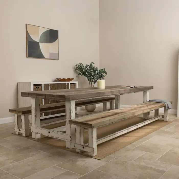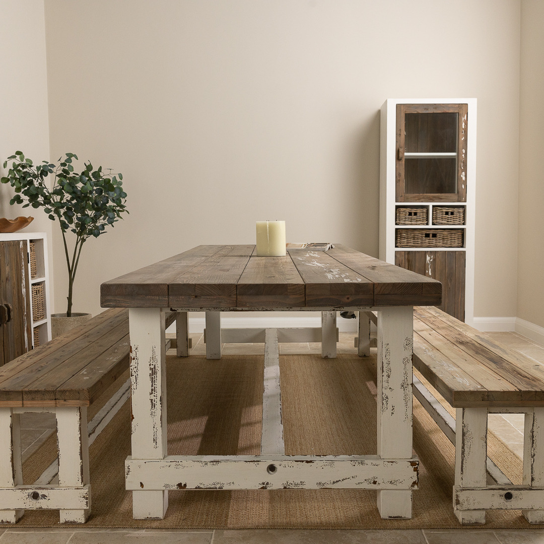 We just love our distressed Coastal range, so much so, we are sure that you will inevitably fall in love with it too. Our stunning coastal range is inspired by casual and carefree lifestyles, along with the rest of the collection. With a thick reclaimed pine tabletop and chunky legs, this weighty table will be the heart of your home and fit for all occasions. The substantial and stylish coastal table paired with our matching dining benches creates a casual dining set up that will suit everyday dining or dress it up for your dinner party needs. Manufactured from sustainably sourced reclaimed pine with a distressed rustic finish that is bang on-trend.