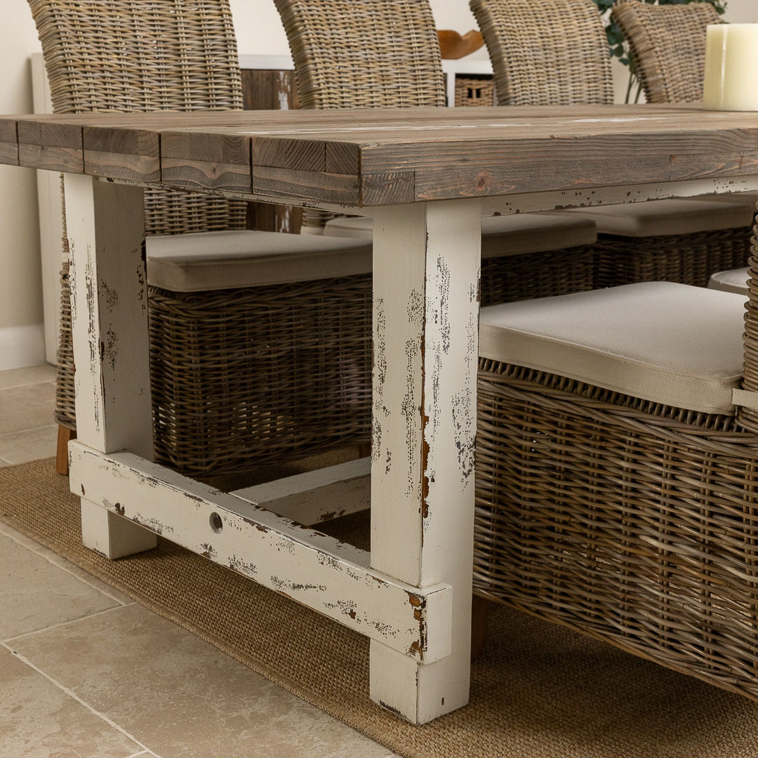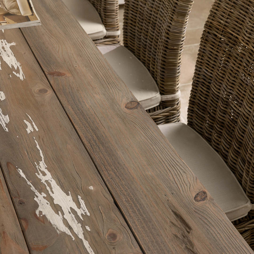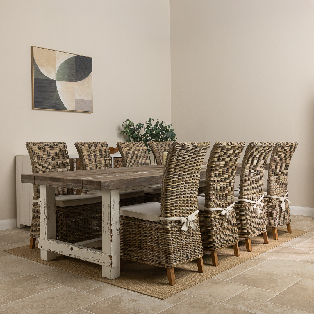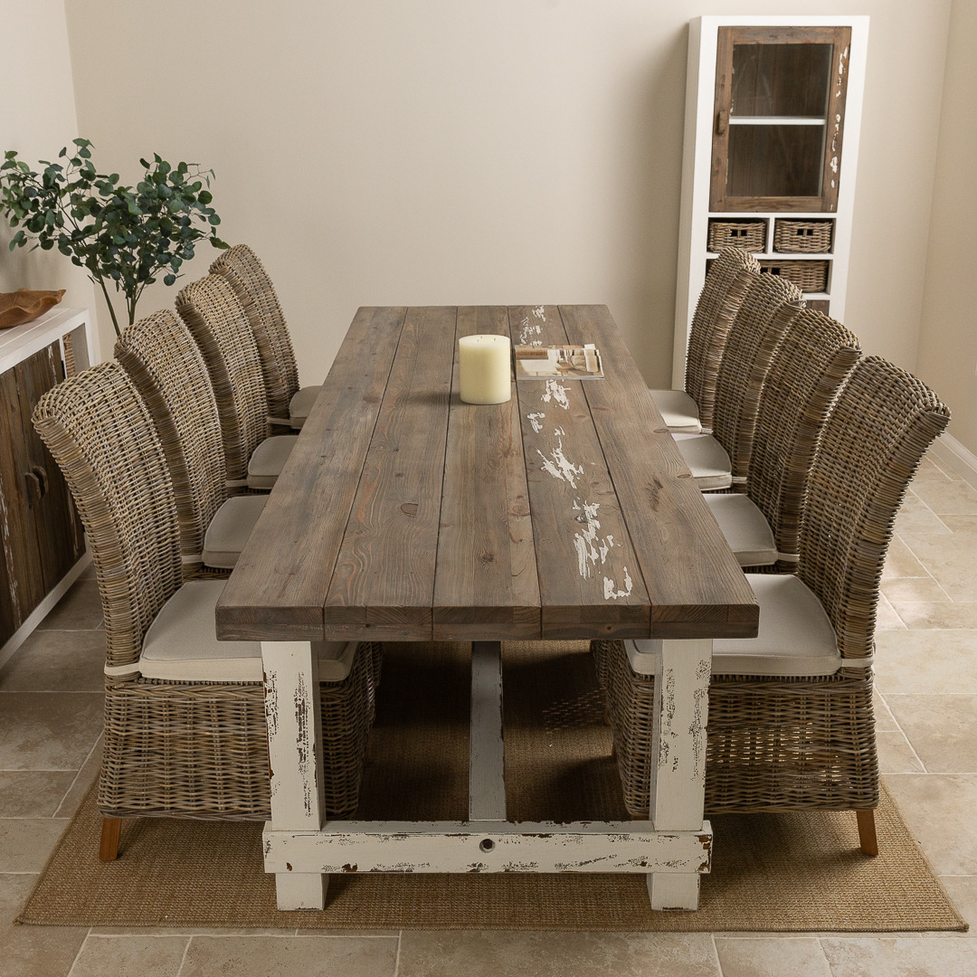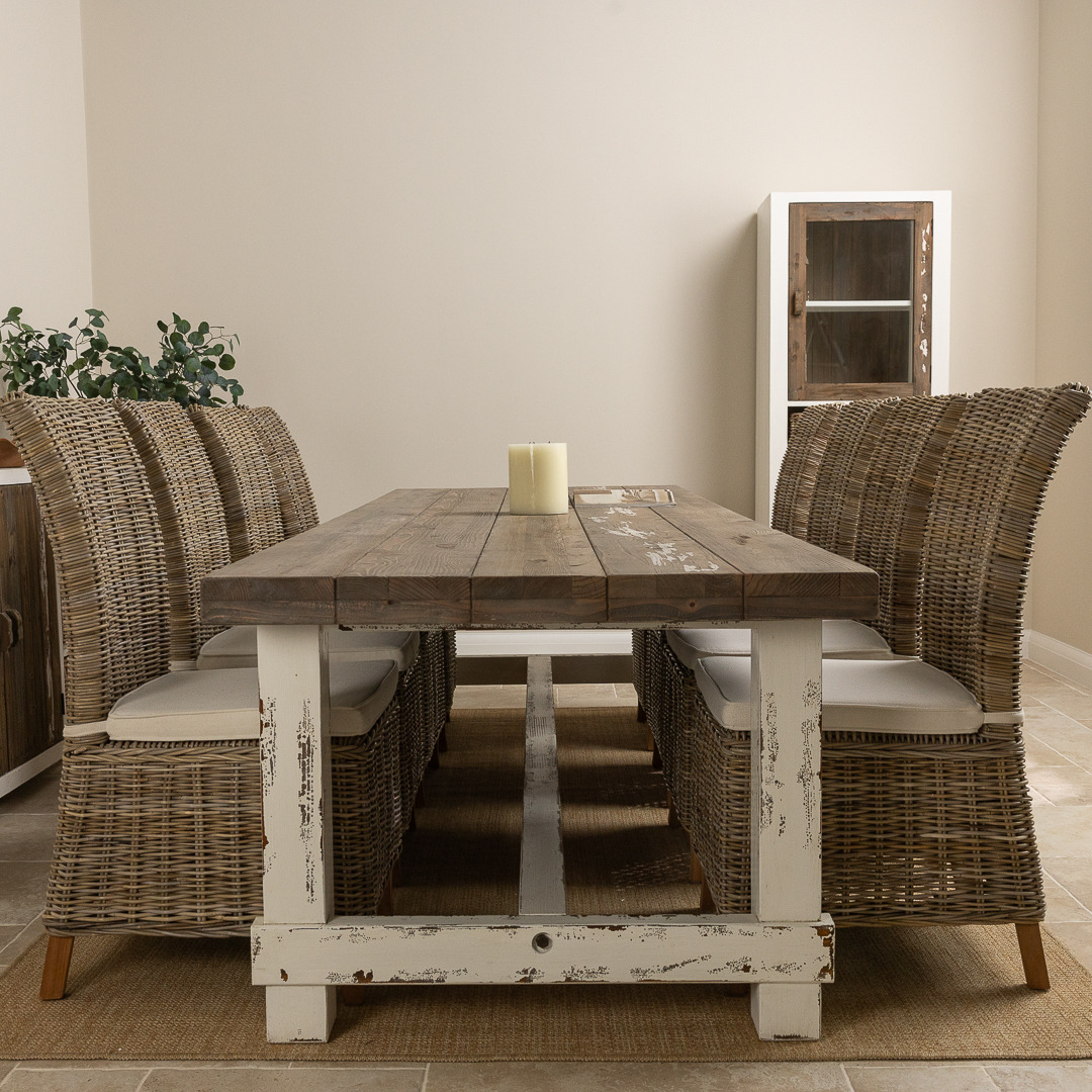 We just love our distressed Coastal range, so much so, we are sure that you will inevitably fall in love with it too. Our stunning coastal range is inspired by casual and carefree lifestyles, along with the rest of the collection. With a thick reclaimed pine tabletop and chunky legs, this weighty table will be the heart of your home and fit for all occasions. The substantial and stylish coastal table can be teamed with 8 of our charming Latifa chairs with high, elegant backs, made from natural Kubu grey wicker. The coastal table has been manufactured from sustainably sourced reclaimed pine with a distressed rustic finish that is bang on-trend.