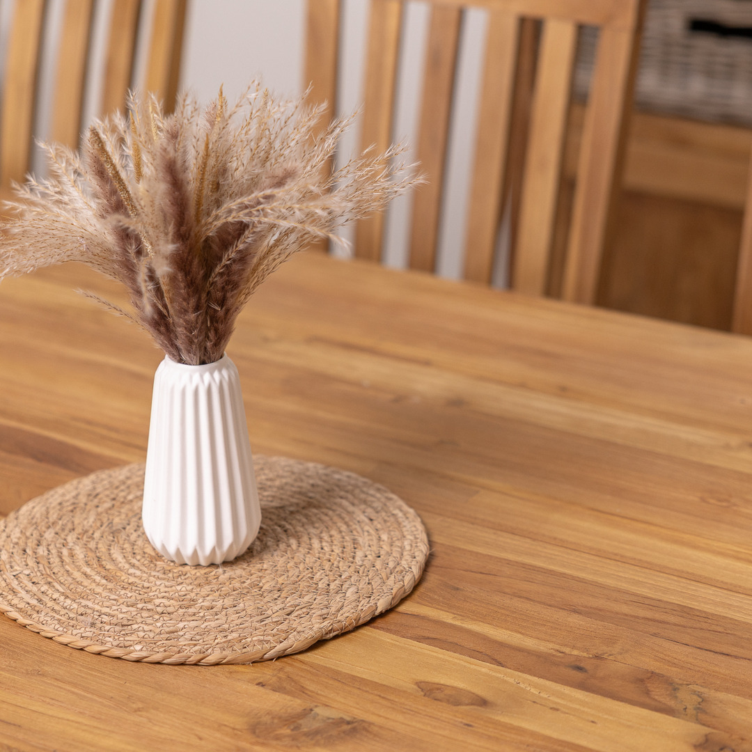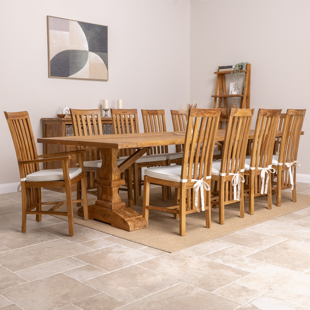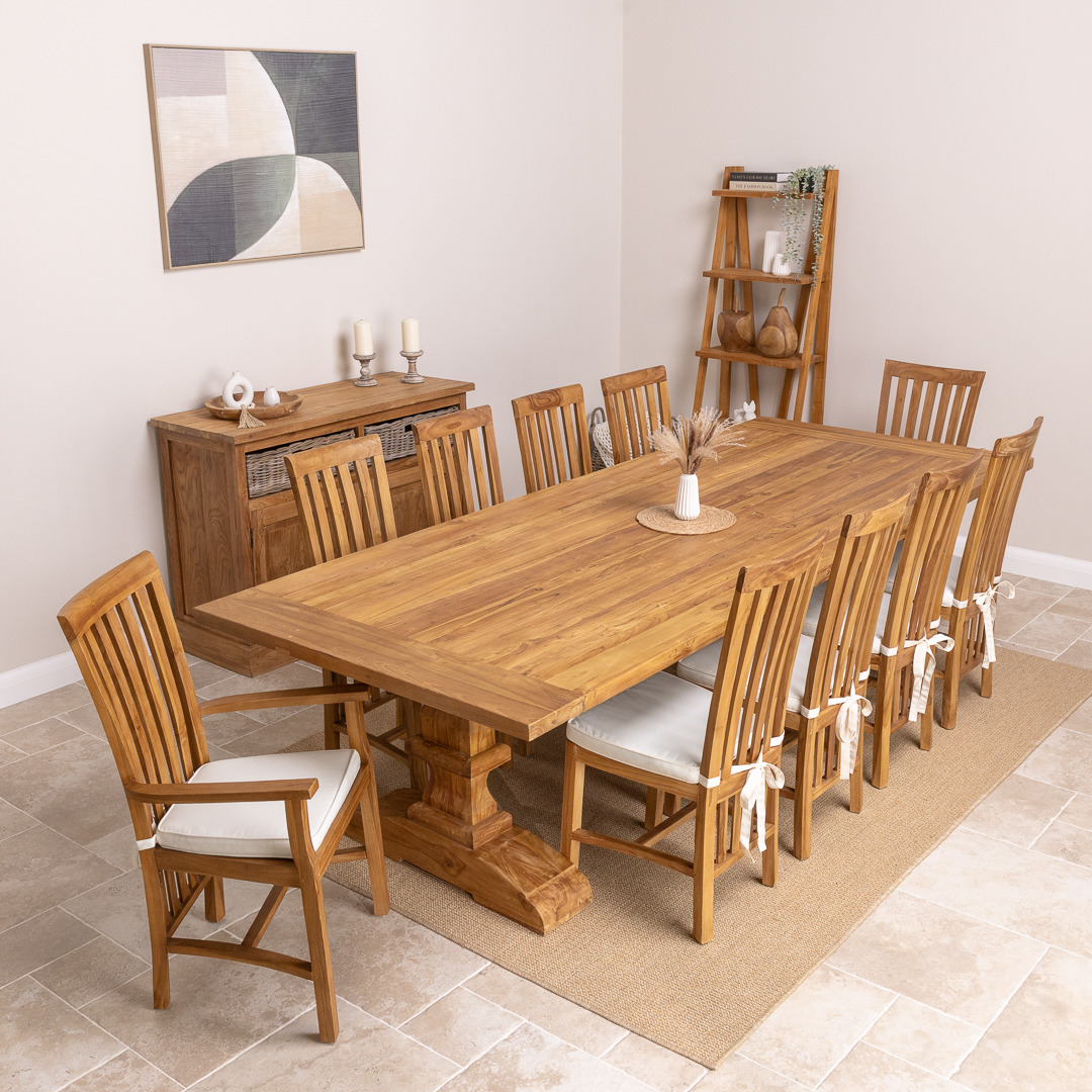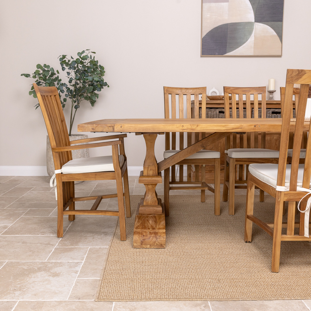 Our delightful Monastery reclaimed teak table has been manufactured from timber sourced from old Colonial buildings. It has a very stylish and natural-looking appearance which makes it great for a dining room or conservatory. The beautiful Monastery table has been reworked by craftsmen using traditional joinery methods to form this table with a chunky pedestal-legged base. The Monastery reclaimed teak dining table matches our Santos dining chairs and armchairs perfectly, which makes a lovely set in your home. The Santos chairs have an extra brace in between the legs, giving the chair its sturdy finish. The Santos' high back adds style to your dining room and will really impress your guests. Handcrafted from sustainably sourced Teak using traditional joinery techniques.