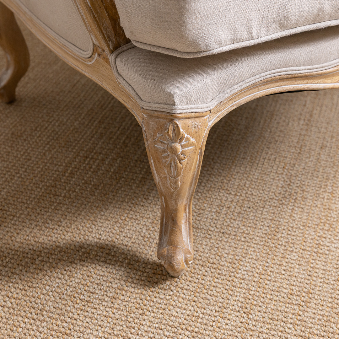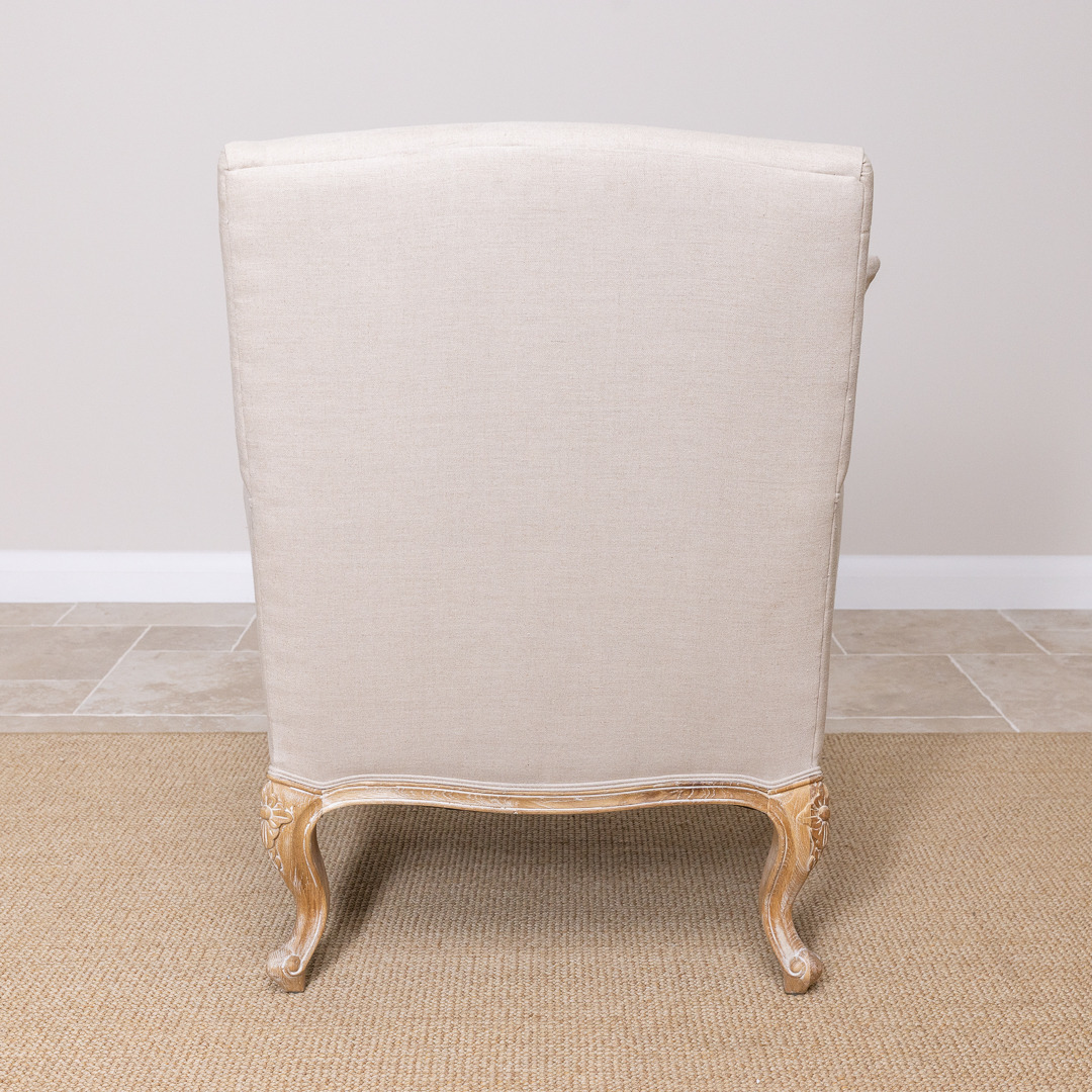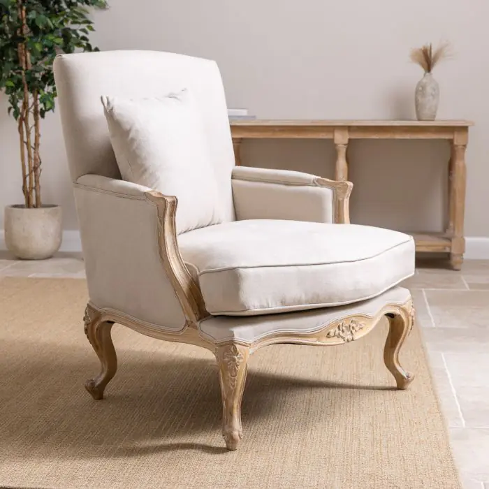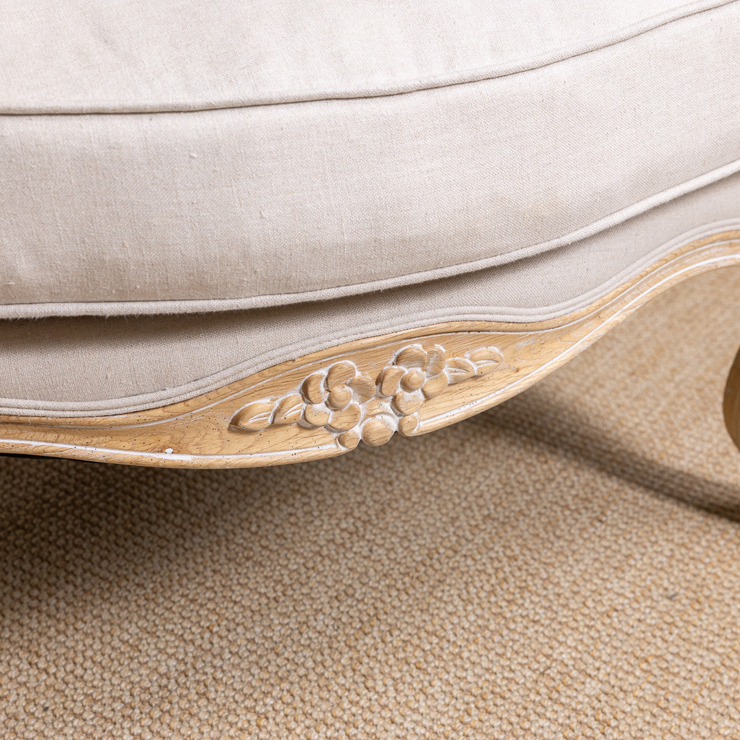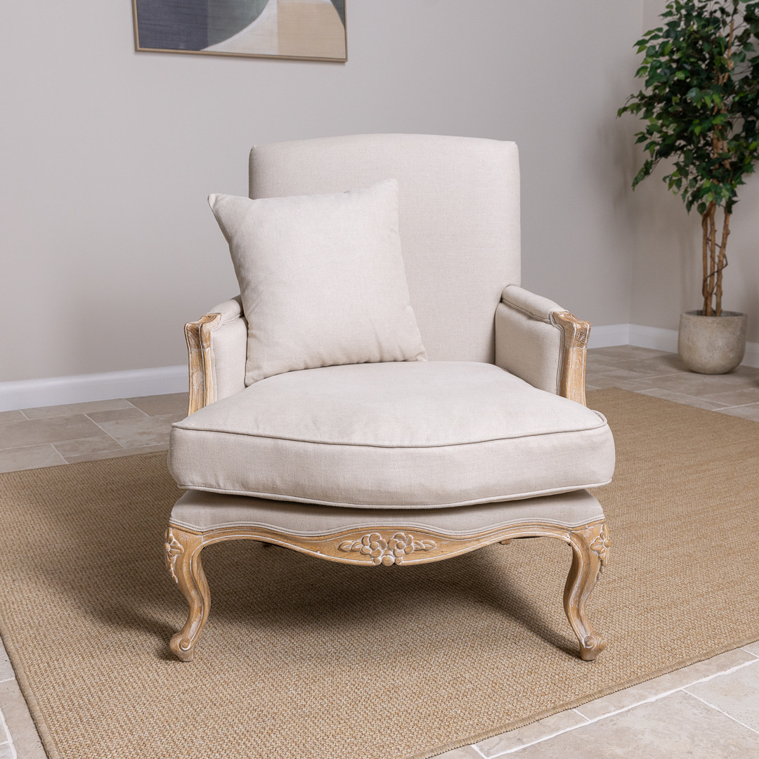 Classy French-styled armchair yet perfect for an elegant English setting in either a lounge, dining room, bedroom, or another area where you are wanting to create an opulent quality feel. This beautiful comfortable classic sofa chair is manufactured from certified American Oak, finished with a charming white/grey wash. This sophisticated chair is upholstered in 100% linen material with matching scatter cushion and delicately carved legs.