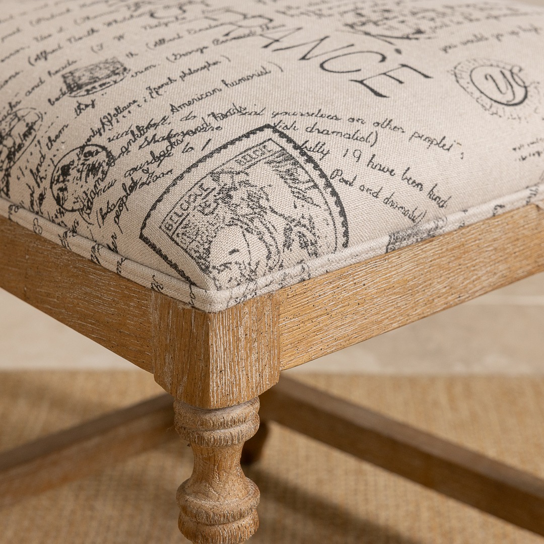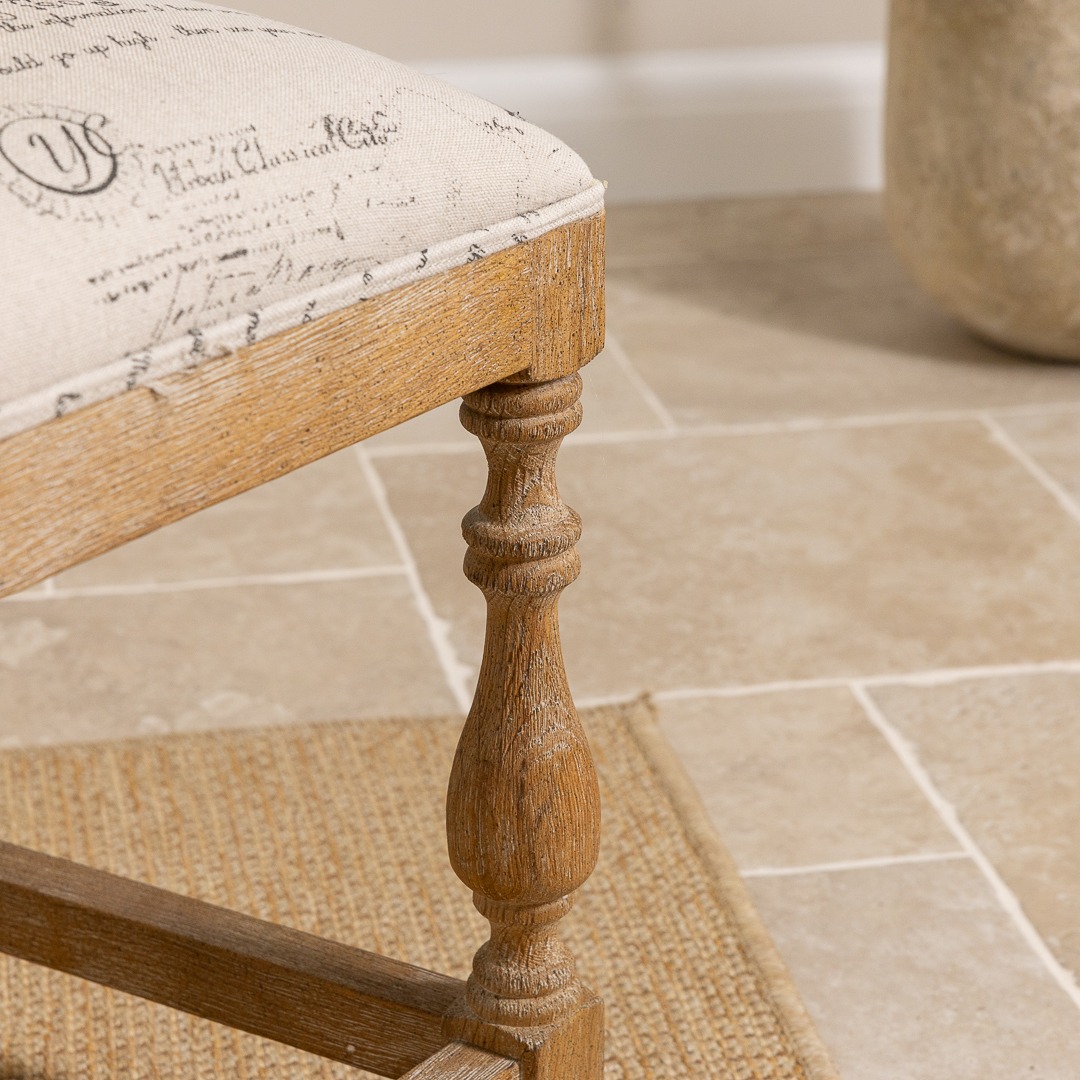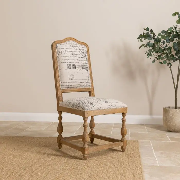 Our sophisticated American Oak dining chair is new in and is sure to be our bestseller! Made from American Oak wood and finished with gorgeous cream upholstery this chair will add elegance to any dining room. The stunning and luxurious dining chair not only boasts extreme comfort but also a charming French print linen fabric in excellent neutral colours. The lovely chair will compliment all styles and colour combinations, so, therefore, makes for a very versatile and comfy relaxing chair. The frame has a charming aged grey/white wash finish with beautifully carved legs.