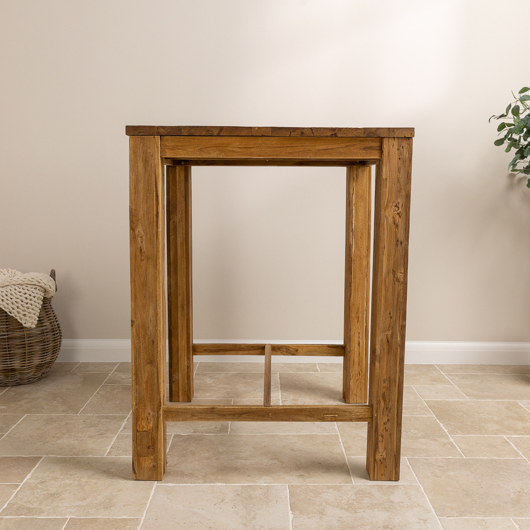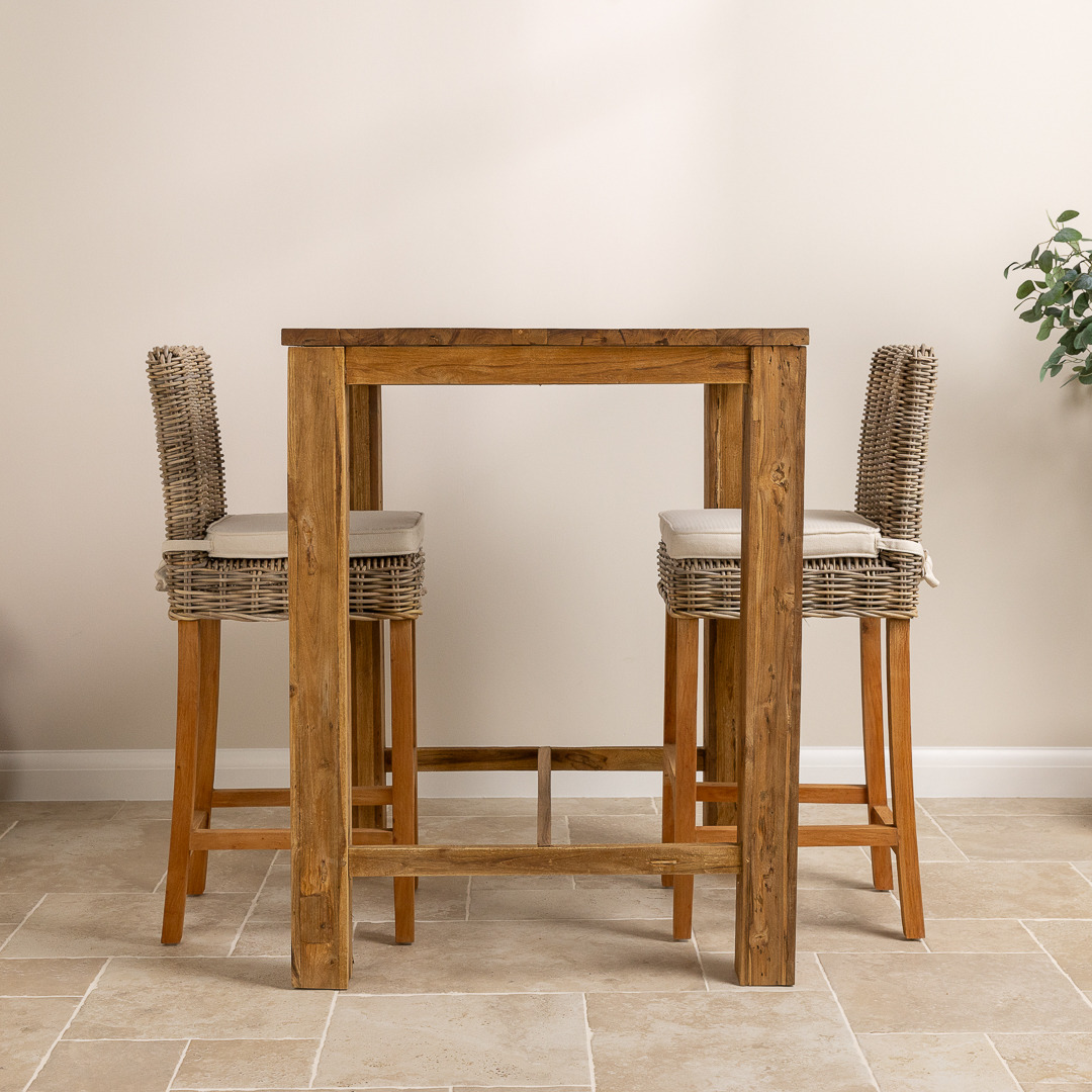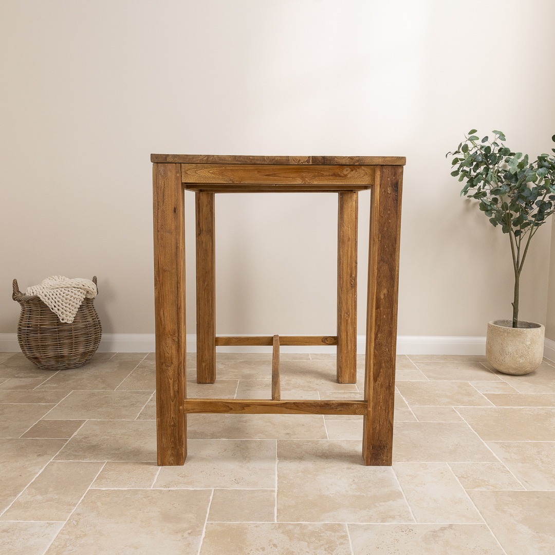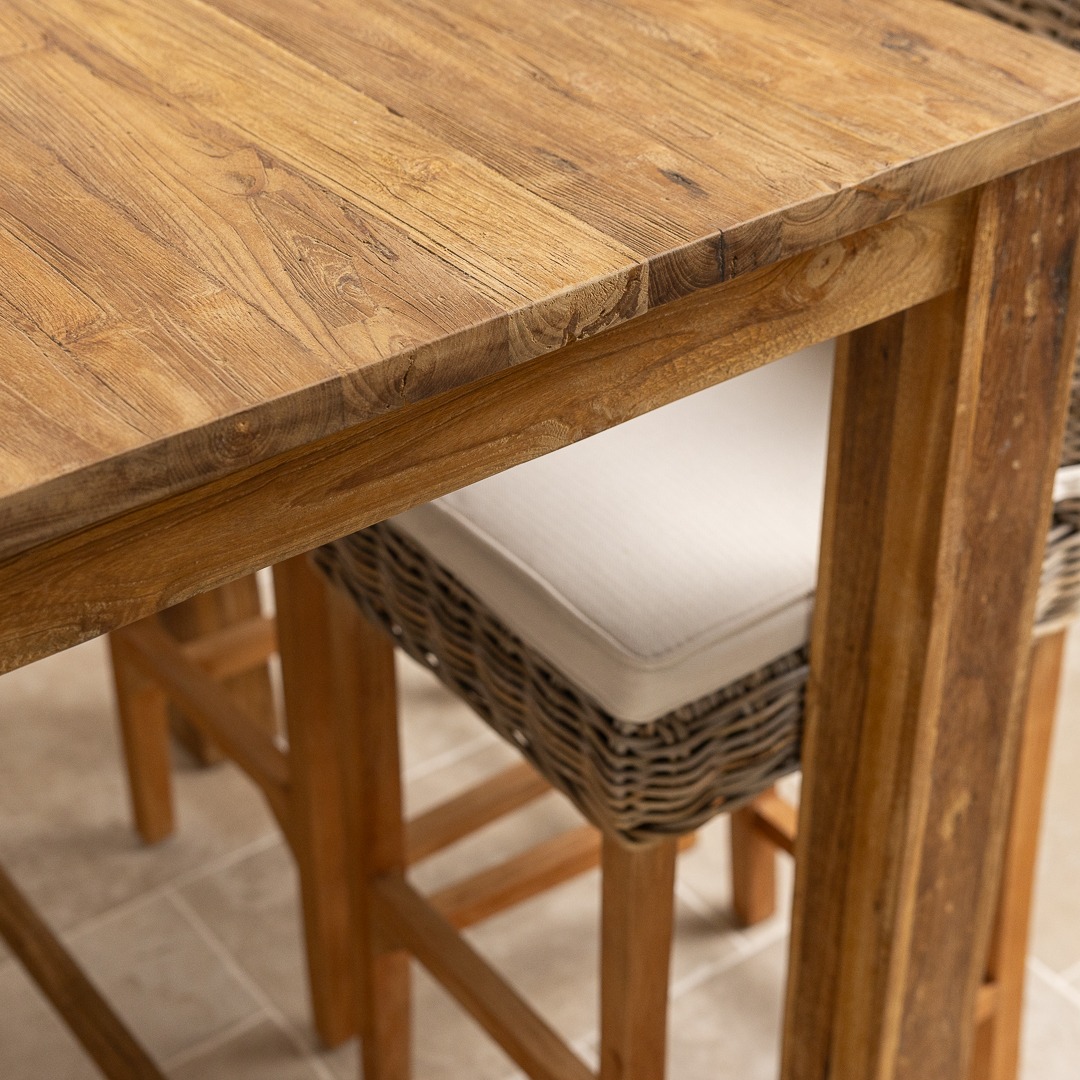 Our gorgeous farmhouse-style Reclaimed Teak Bar Table is a great addition to any dining area. Using sustainable timber sourced from old Colonial buildings, this piece is eco-friendly yet robust, strong and sturdy. This table can be used for commercial purposes in restaurants, cafes or bars. The natural grain of the wood is a strong feature of this table, providing a rustic and earthy feel. The table can also be purchased with the Natural Wicker Kubu Stools found in our Dining Chairs Section or as a set in our Dining Sets section.