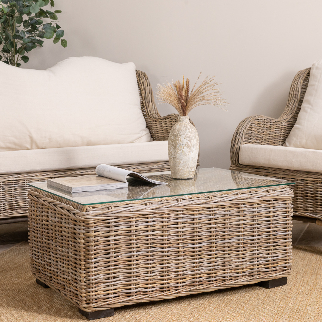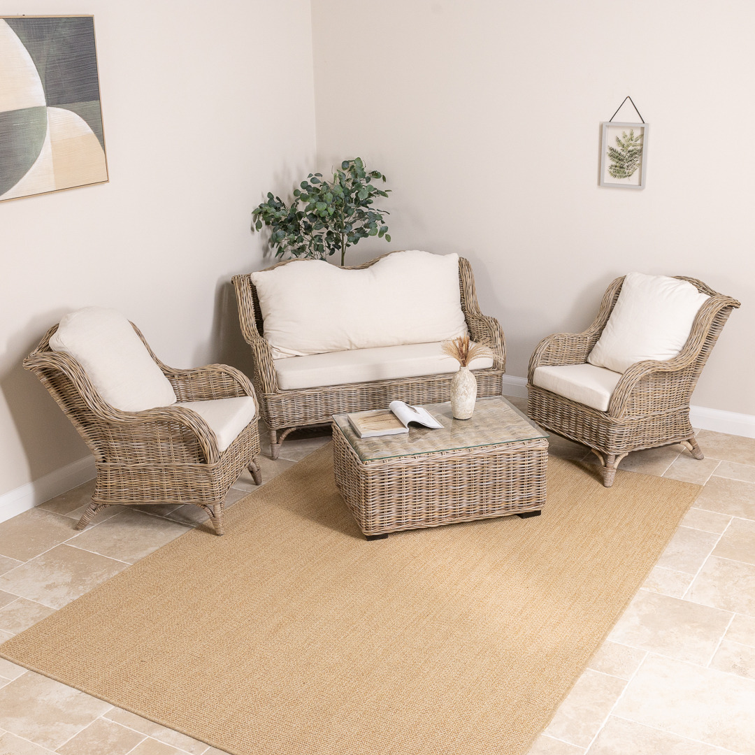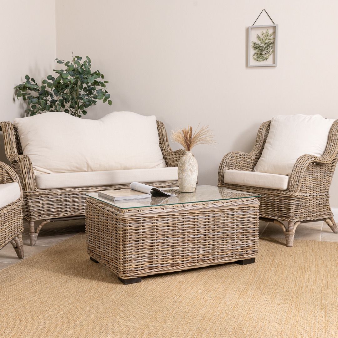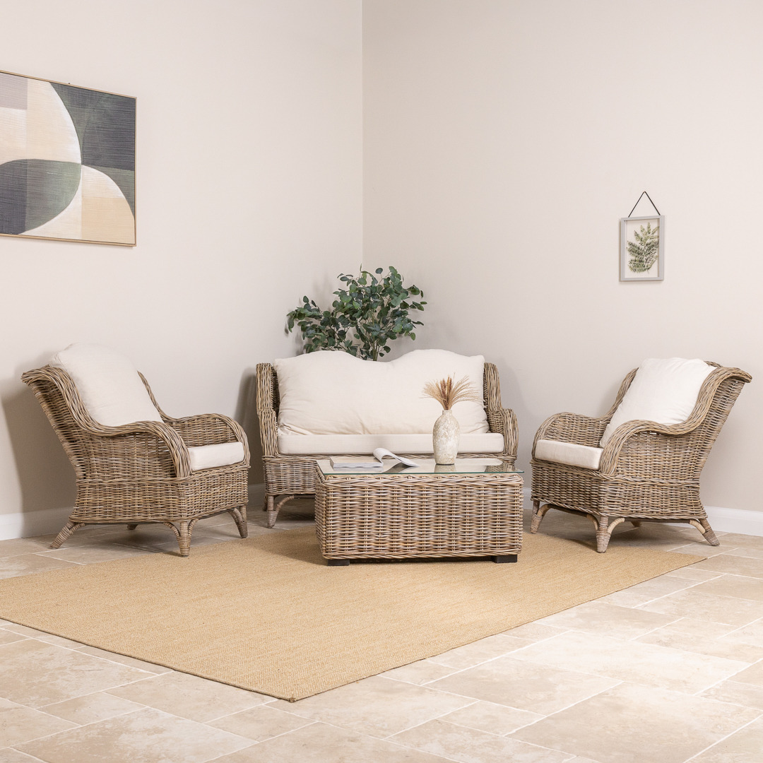 You asked and we delivered! Our Jumo sofa is finally here by popular demand, we have created a three-piece suite that includes our sought-after Jumo armchairs, enabling you to create a seating area to be proud of. Why not add our 90cm wicker coffee table to create a seamless seating area to relax with friends or to get some peace curled up with a blanket and your favourite book? We have carefully curated the Jumo sofa to keep it as traditional as possible to bring back a timeless piece with a modern flare which would have been a staple in many homes not so long ago. They are manufactured with a strong rattan framework and then covered in an attractive natural Kubu grey wicker with spectacular brown and grey hues running throughout each weave, making them extremely robust, stable and stylish. Each sofa and armchair comes with natural linen cushions which are zip removable.