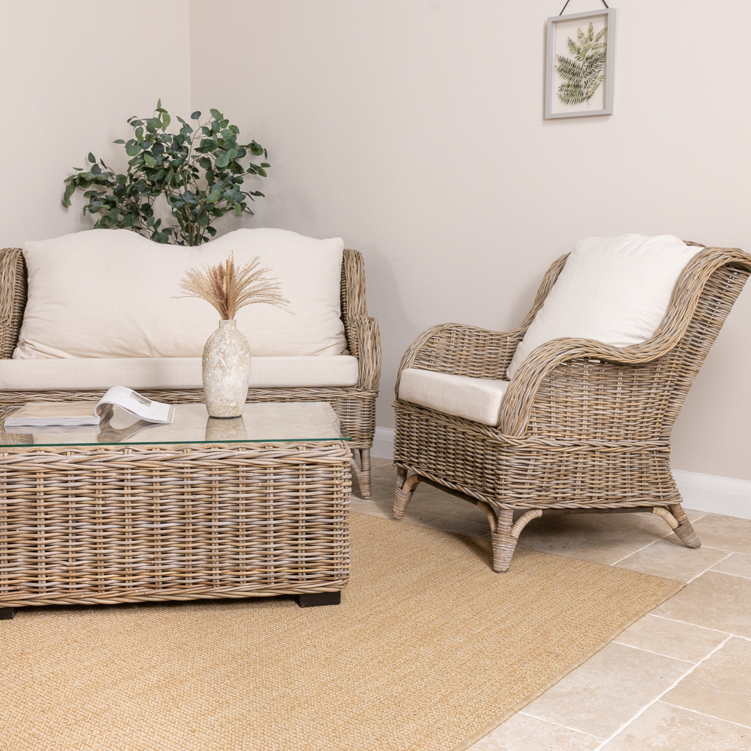 Our wicker furniture is fantastic for indoor, outdoor and commercial use. The natural wicker does not become brittle in the sunlight and can be left outside all year round when our aftercare guide is followed. The strong hardwood frame ensures you will get many years of use out of our wicker products, whether for indoor use or as part of a stunning garden seating area. When left outside, the wicker will slowly turn to a charming grey/white colour due to the weathering process, but this in no way affects the product's structural integrity. The greying effect is the same as seen on wooden outdoor furniture but occurs much more slowly. The cushions must be stored in wet/damp weather as they are not water-resistant.