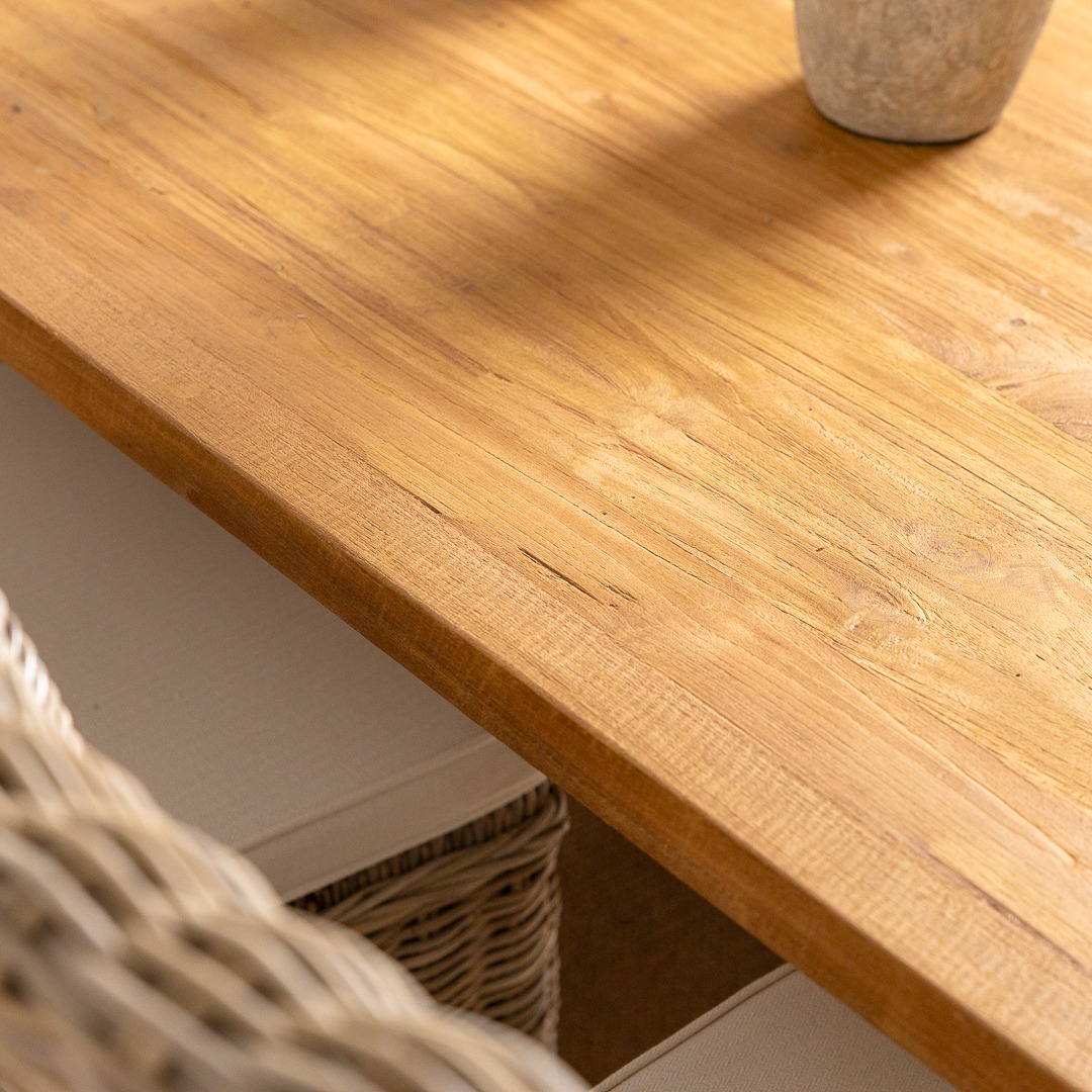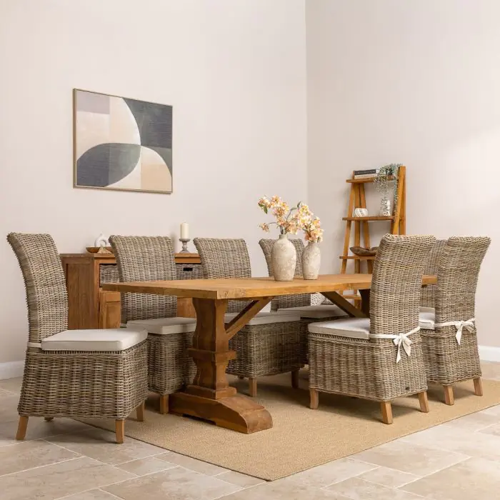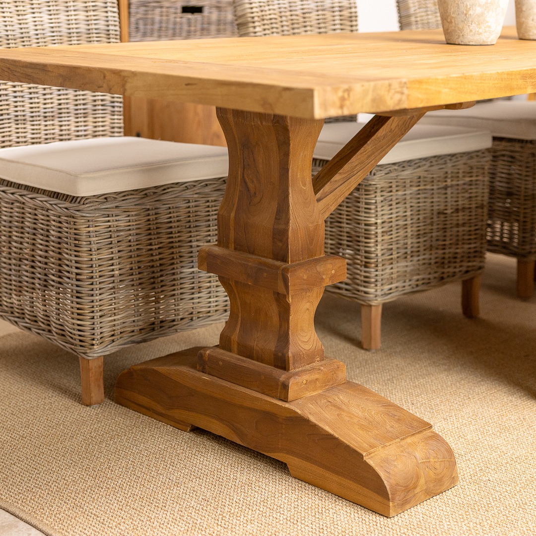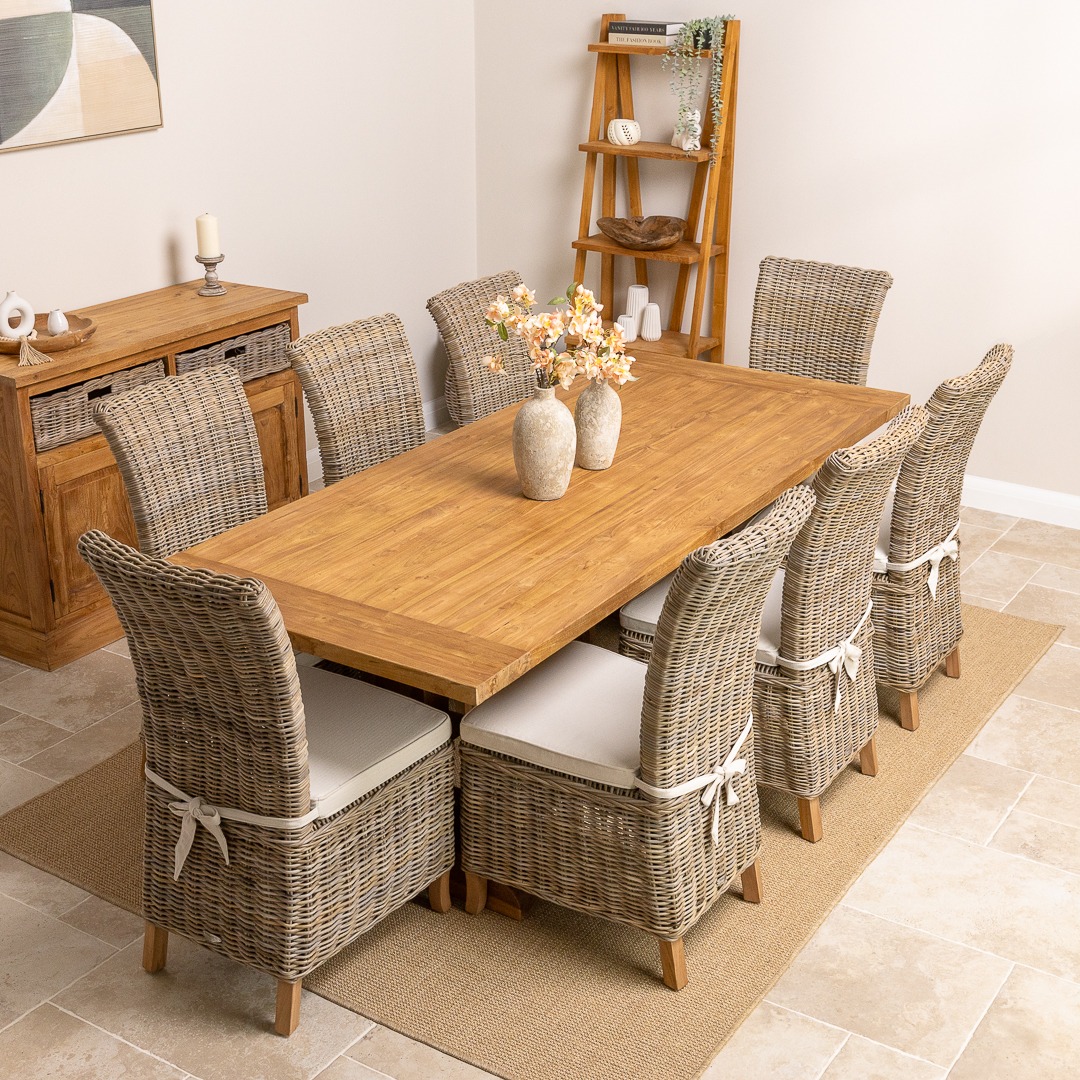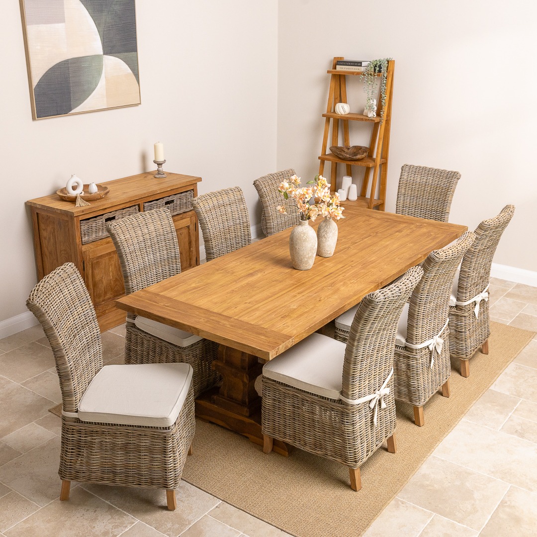Our beautiful 2.4m Monastery Reclaimed Teak Table is both stylish and naturally looking, making it suitable for any dining room or conservatory. Our delightful reclaimed teak table has been reworked by craftsmen using traditional joinery methods to form this beautiful table with its chunky pedestal-legged base. Our Latifa chairs would accompany the monastery teak table perfectly. The Latifa chairs are an elegant and sustainable addition to any dining room, thanks to their stylish high backs, which make these chairs incredibly comfortable. Our Latifa chairs are extremely robust and ideal for the hustle and bustle of family life or any commercial setting. Each chair comes with a cushion that ties neatly around the back of the chair, in a natural linen which is zip-removable.