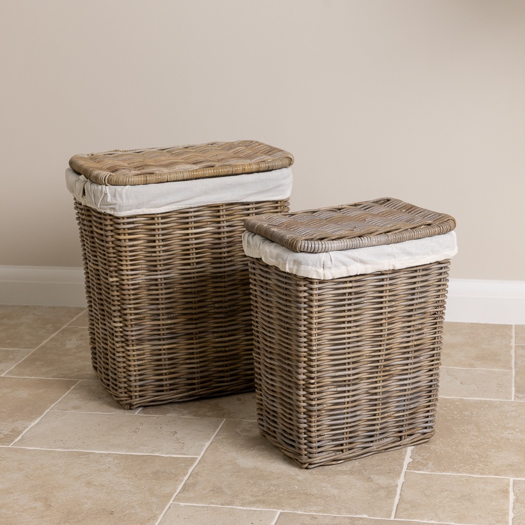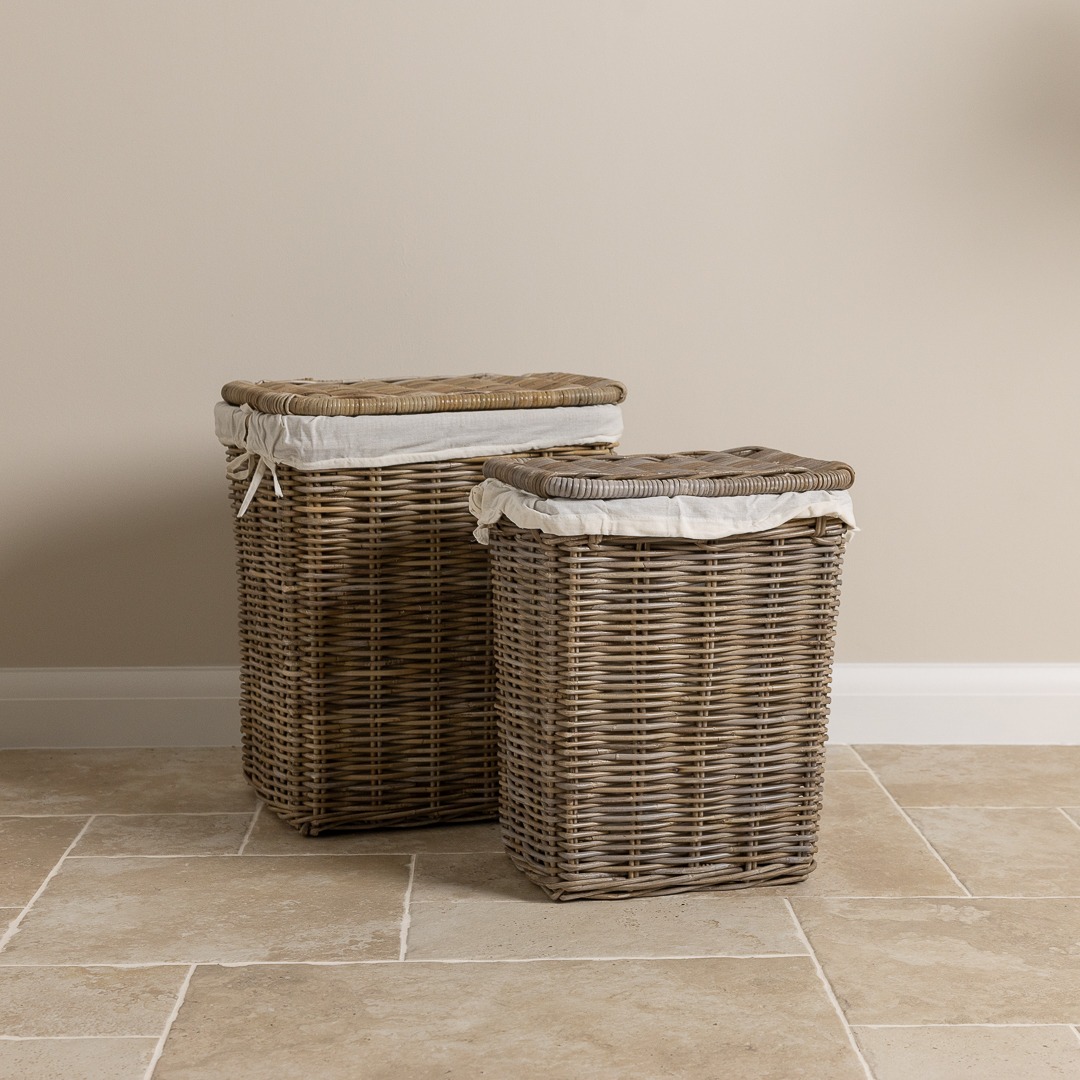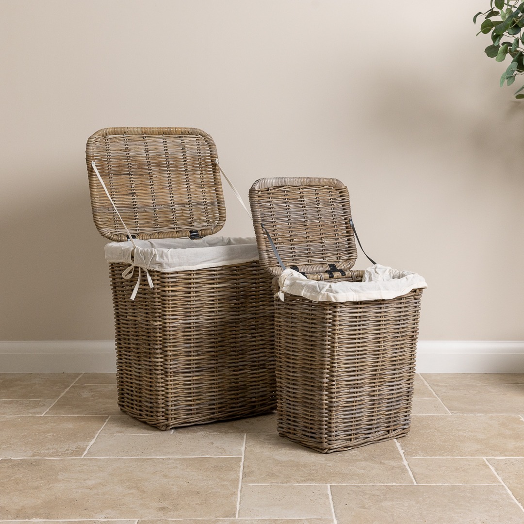 Set of 2 laundry baskets manufactured from sustainable natural wicker. Keep your dirty laundry out of sight with this pair of useful and stylish laundry baskets, which will look great in the bathroom or the corner of your bedroom. Also useful for putting toys in and keeping them tidy or can also be used as a log basket. Both baskets come with natural linen inserts which are removable and machine washable at 30°.