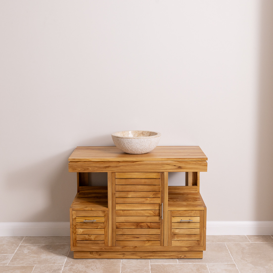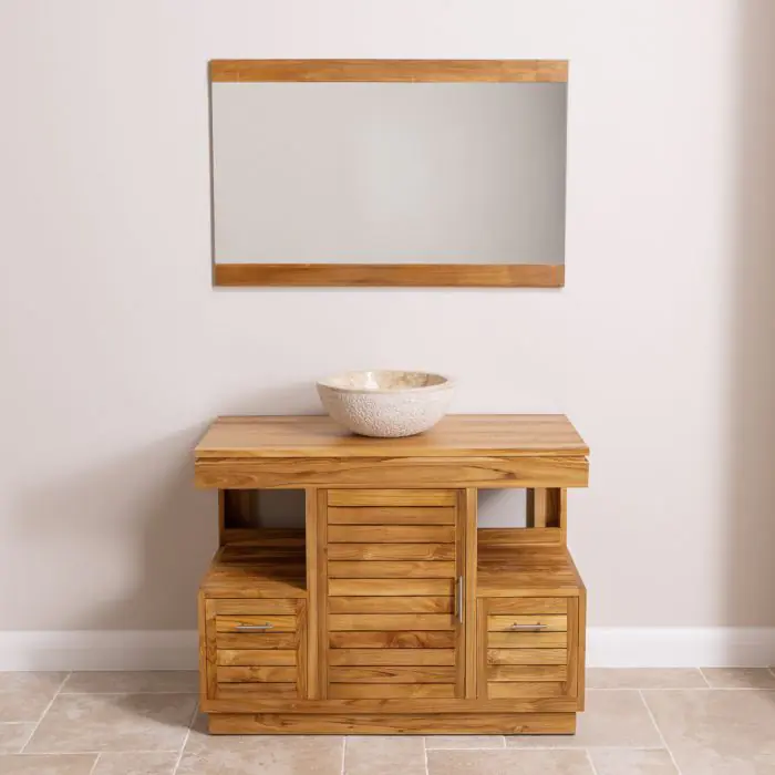 Teak naturally repels water, but to keep your new bathroom furniture looking its best, we recommend applying a clear sealer to the exposed timber. This will prevent watermarks and scratches whilst maintaining the natural colour of the furniture.