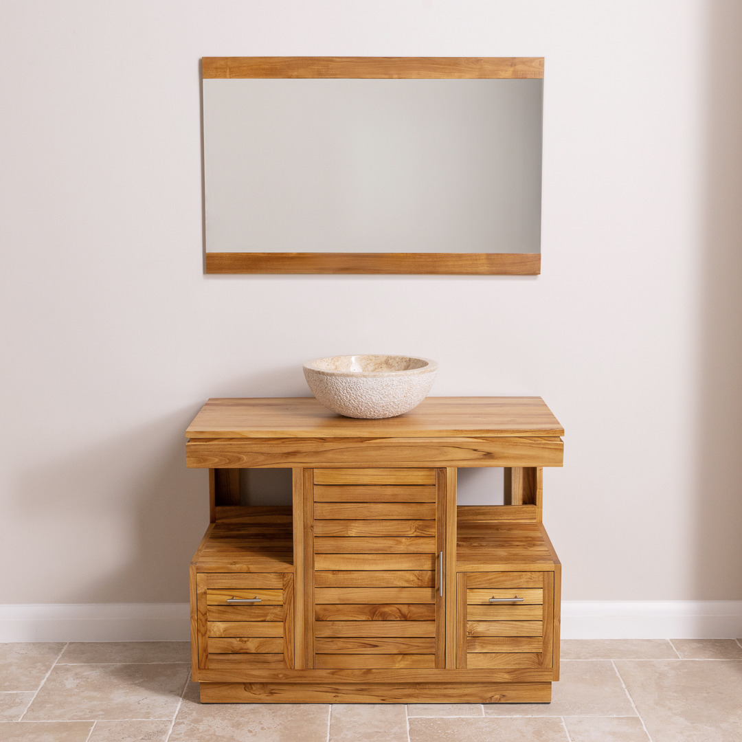 Our Oasis bathroom range combines rich Teak with luxury contemporary styling to create a range that will fit seamlessly into your room. We've carefully selected a range of vanity cabinets, mirrors, washstands and storage cabinets to help you find the perfect combination to suit your space. The Oasis vanity cabinet is manufactured from solid Grade A Teak and features a cupboard and two drawers for handy storage. The shelves are perfect for displaying towels, toiletries or a basket full of bath toys for your little ones.