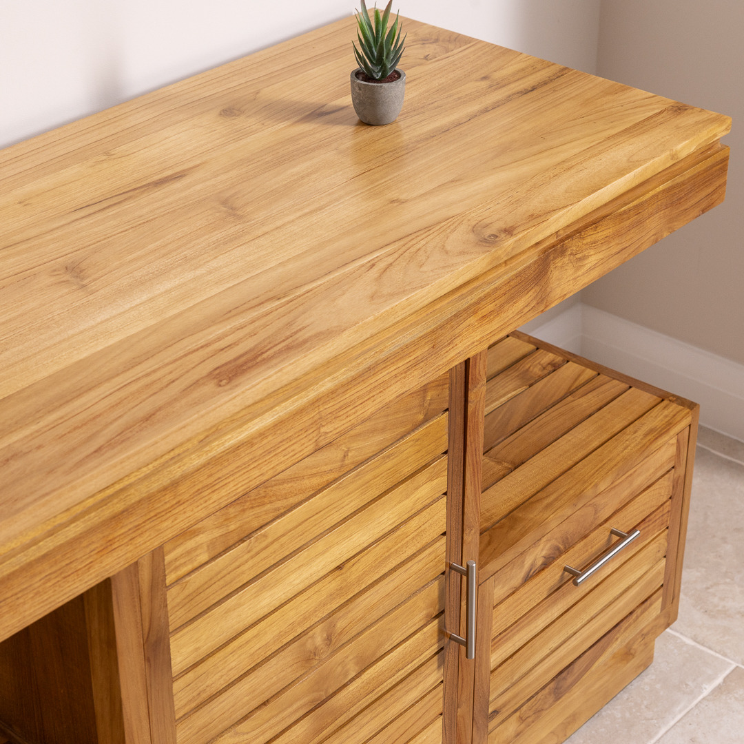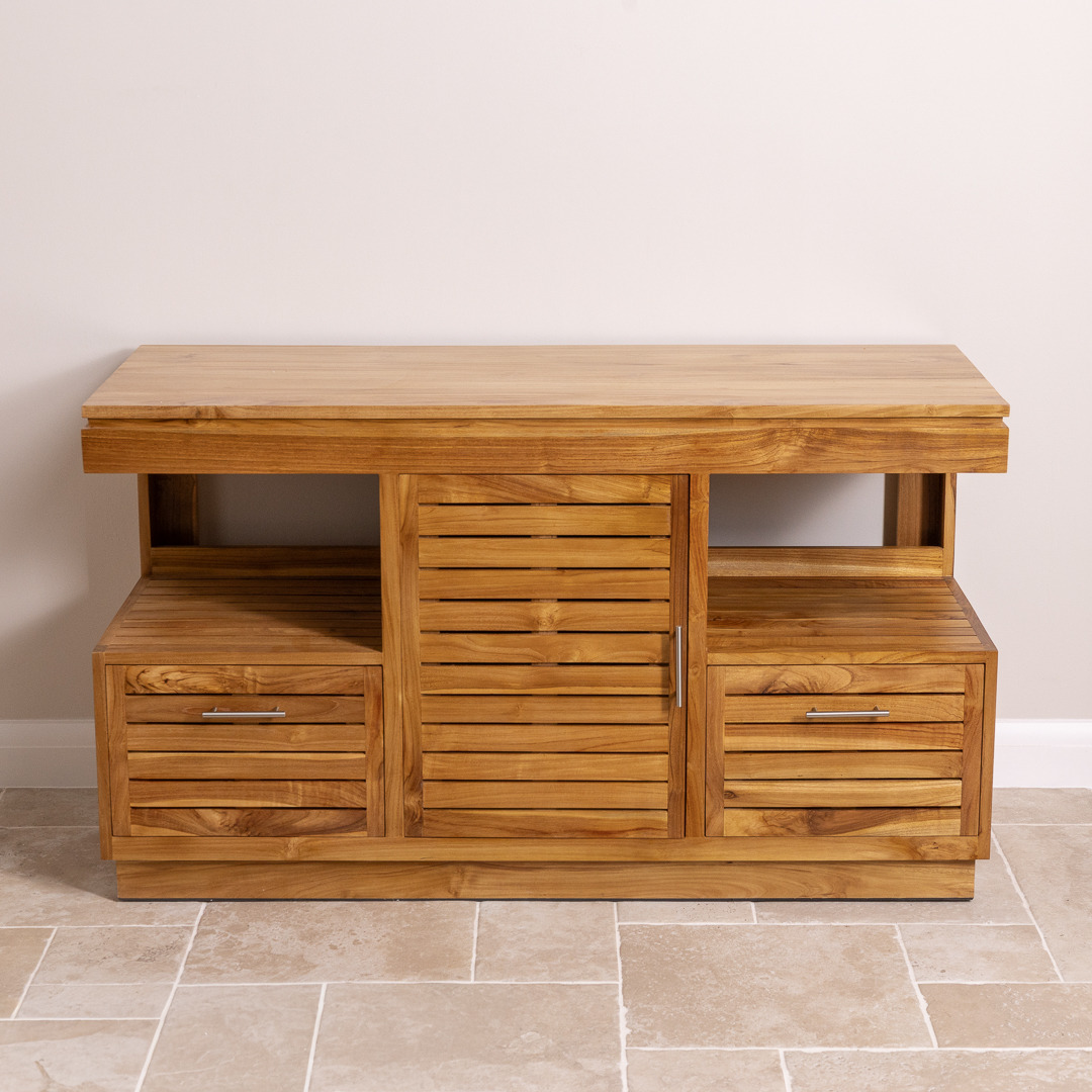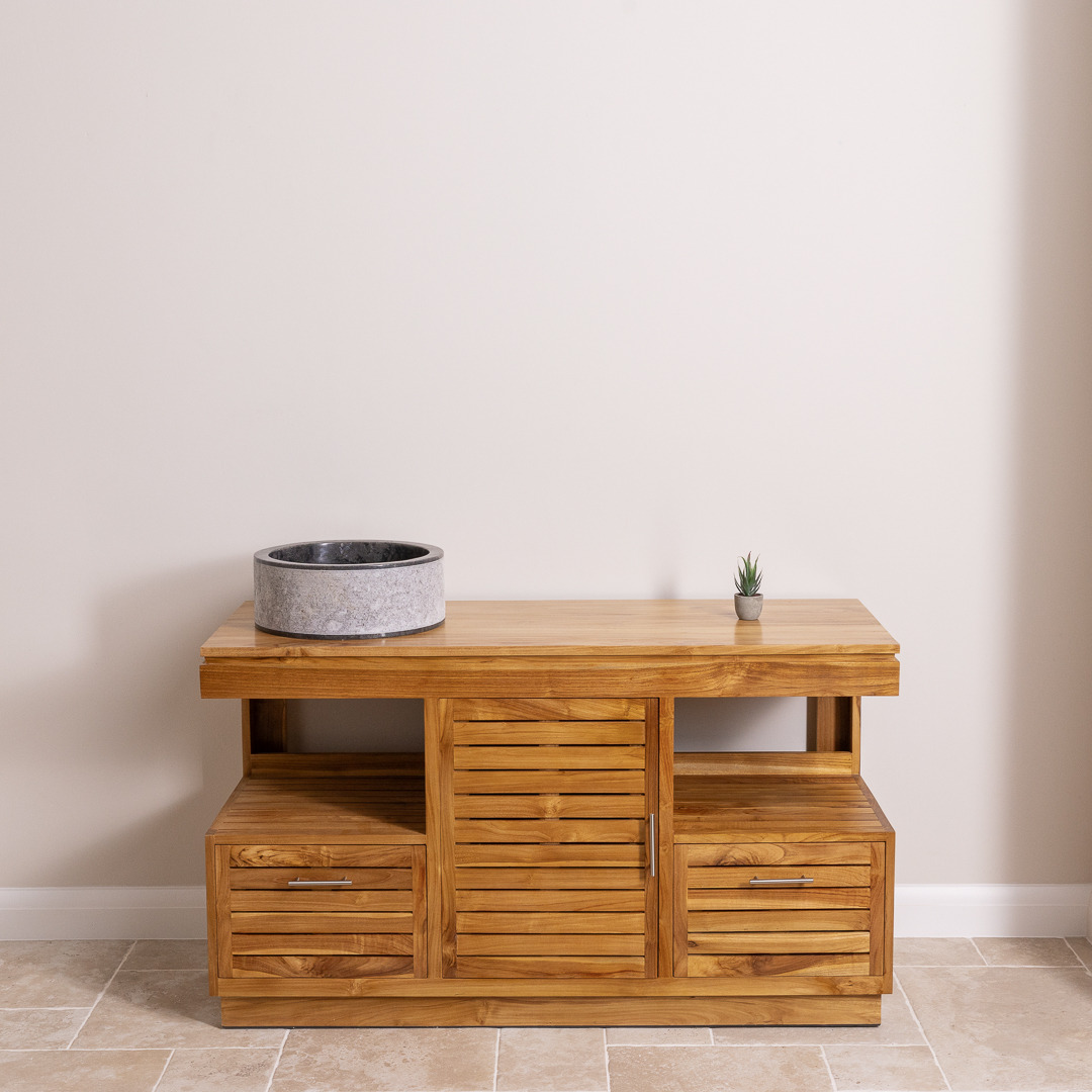 Our Oasis bathroom range combines rich Teak with luxury contemporary styling to create a range that will fit seamlessly into your room. We've carefully selected a range of vanity cabinets, mirrors, washstands and storage cabinets to help you find the perfect combination to suit your space. The Oasis vanity cabinet is manufactured from solid Grade A Teak and features a cupboard and two drawers for handy storage. The shelves are perfect for displaying towels, toiletries or a basket full of bath toys for your little ones.