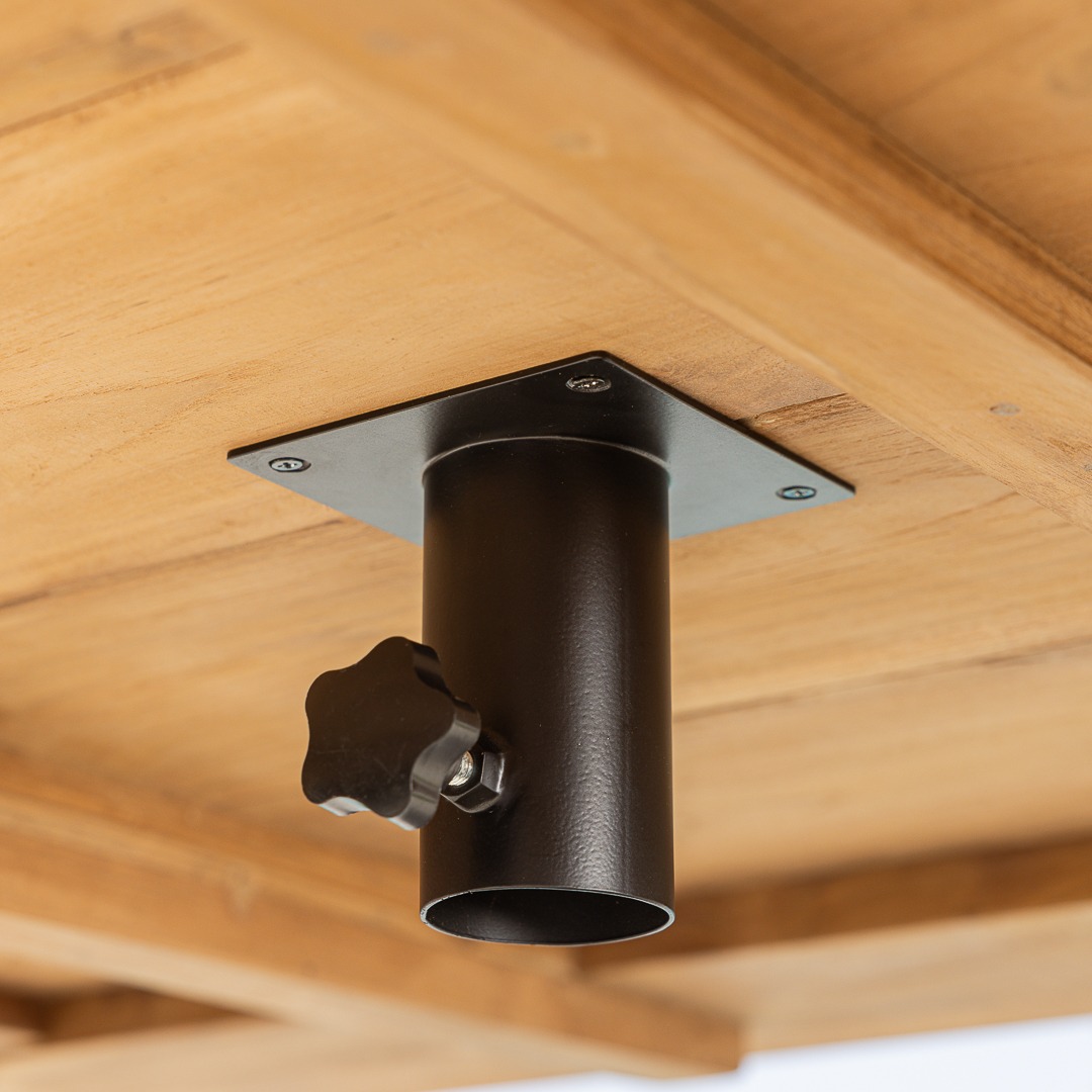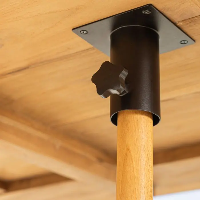 Our minimal and innovative parasol lock can be used with any table design, making this simple yet effective product incredibly versatile. The parasol lock can be fitted using the four small screws provided, to the tabletop or support bars, it can even be fitted to the underside of the tabletop to keep it hidden. The overall design is sleek, stylish and looks great against the warm golden brown colour of our teak tables, the biggest benefit is that it can be used instead of a parasol base. Standard size parasol poles will pair perfectly with this parasol lock and keep your patio area clutter-free for years to come. Manufactured from black powder-coated galvanised steel which will not rust over time, featuring rounded corners and a triangular-shaped tightening screw for ease of use.